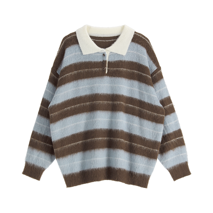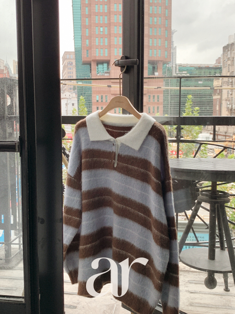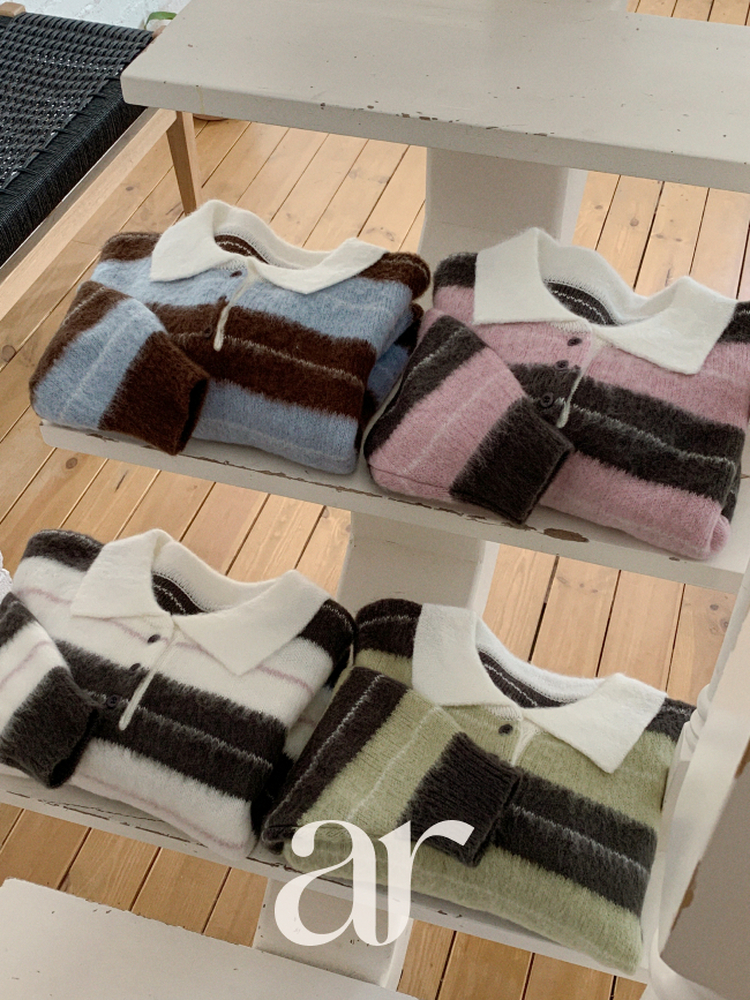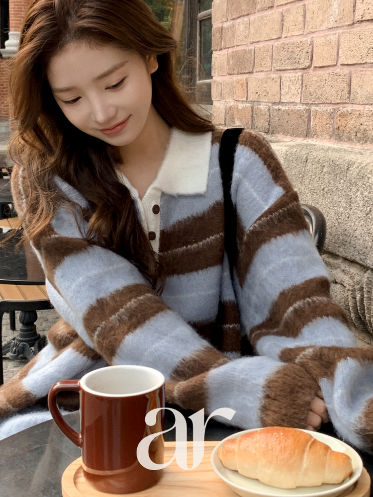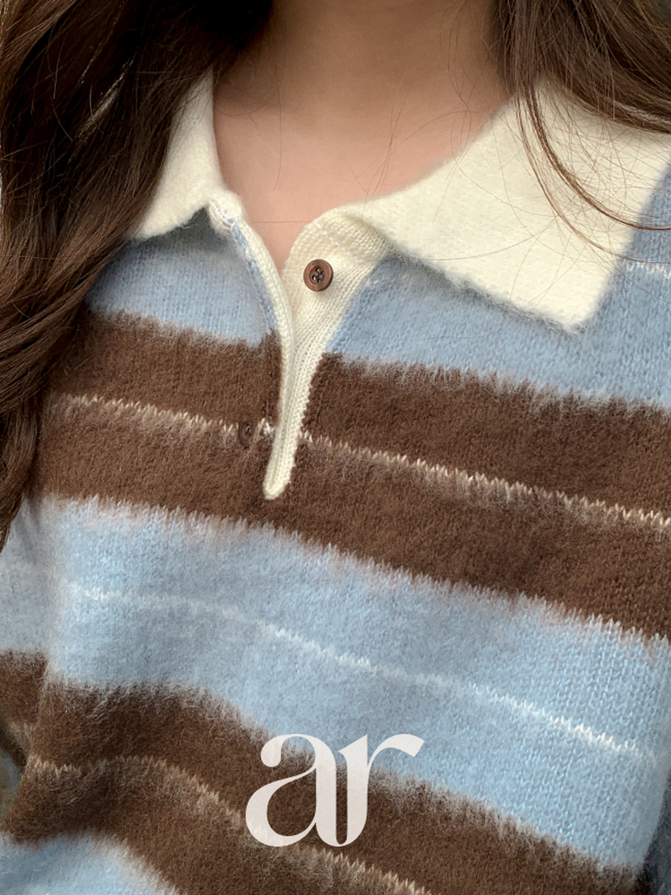 SNT33568 nt5321 (포인트룩추천♥/포근여리핏) 홀린 브러쉬 배색 스트라이프 카라넥 버튼 긴팔 니트