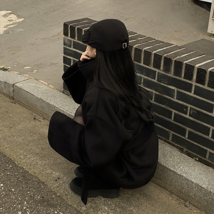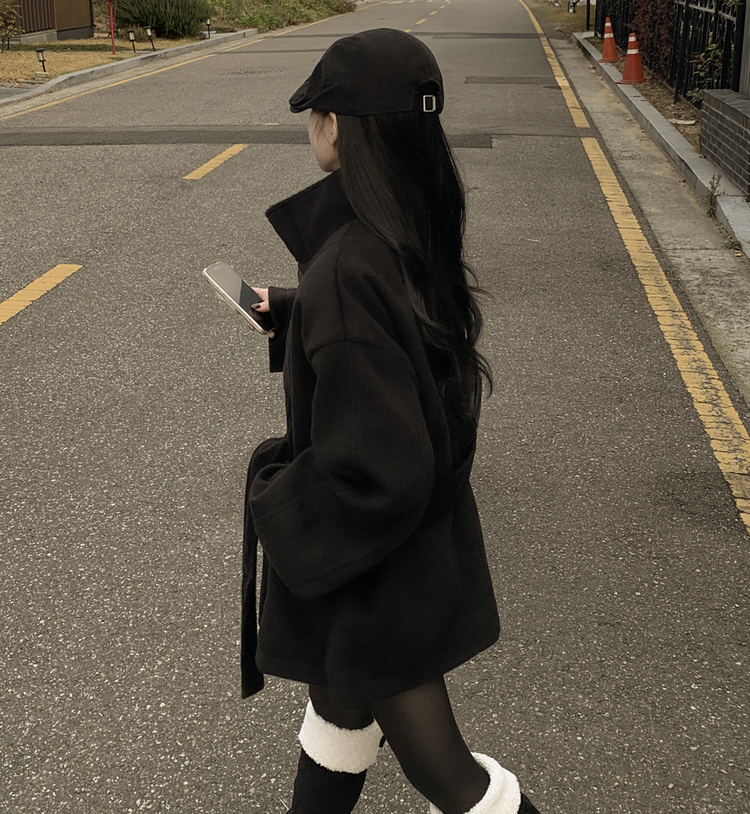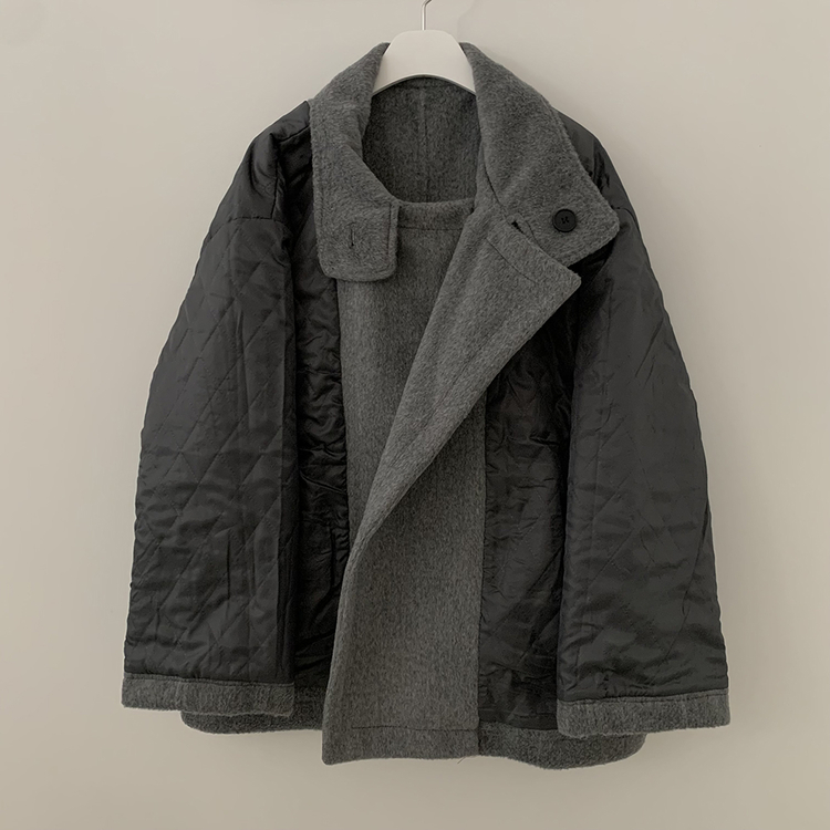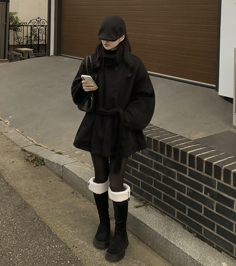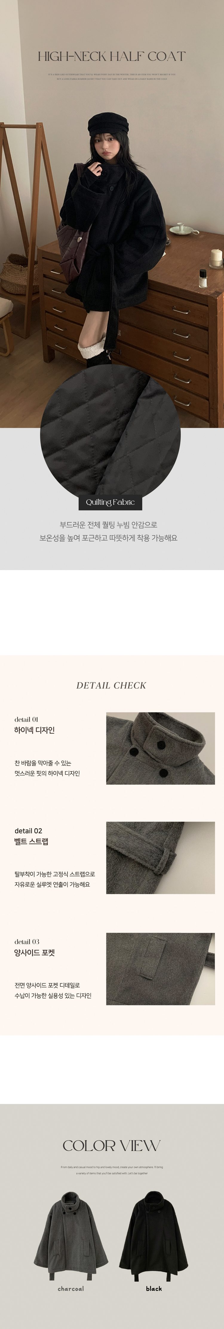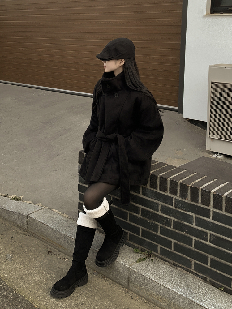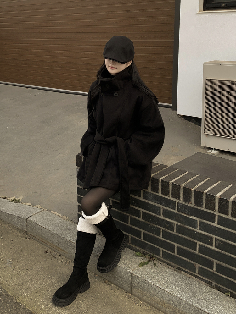 SJP19191 연말룩추천하이넥 단추 허리벨트끈 누빔 하프 로브 반코트 박시핏 자켓