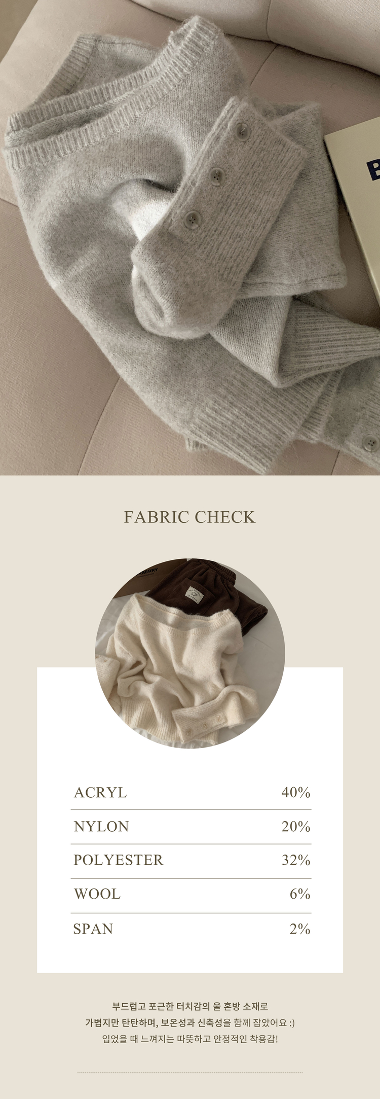 | 素材 | 아크릴(40%), 나일론(20%), 폴리(32%), 울(6%), 스판(2%) |