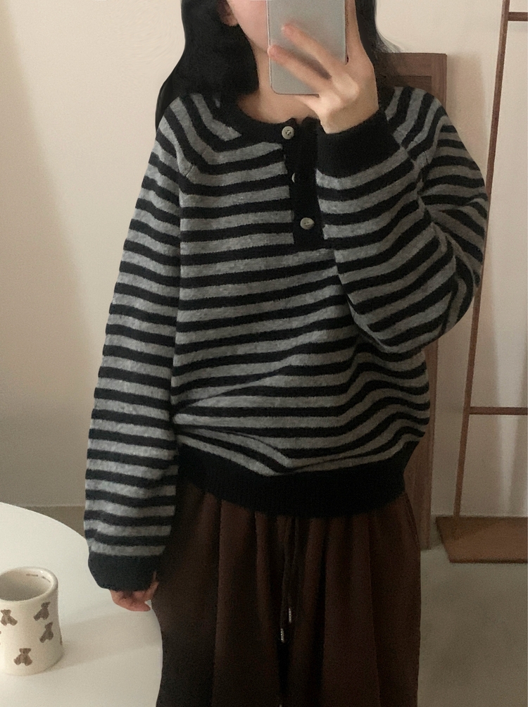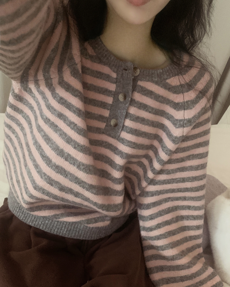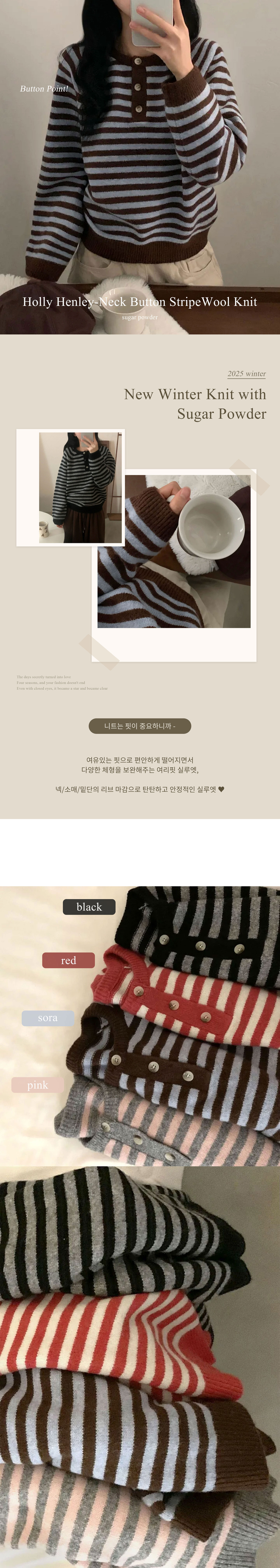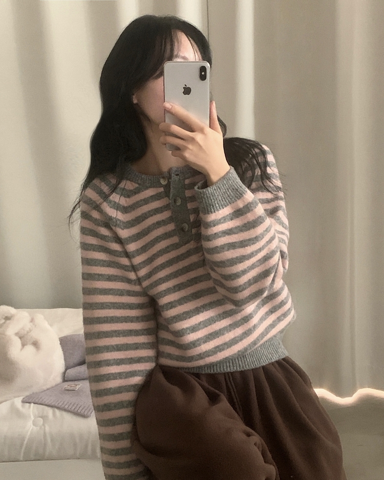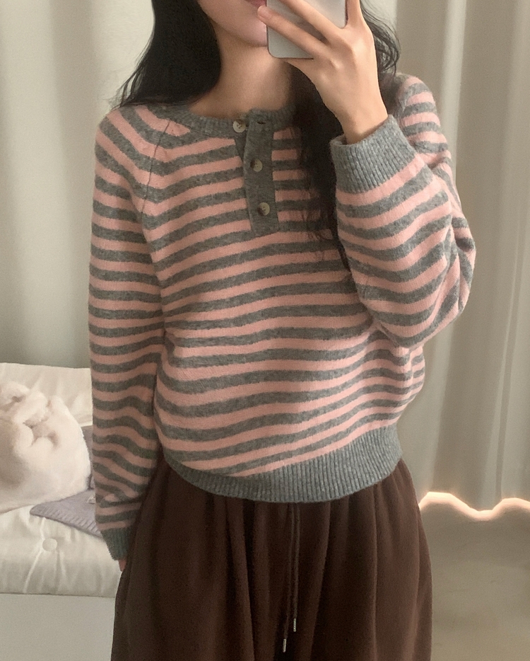 SNT34316 홀리 헨리넥 버튼 스트라이프 긴팔 울니트