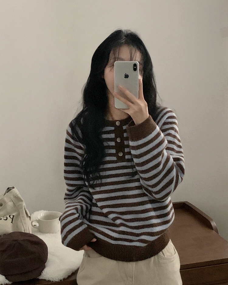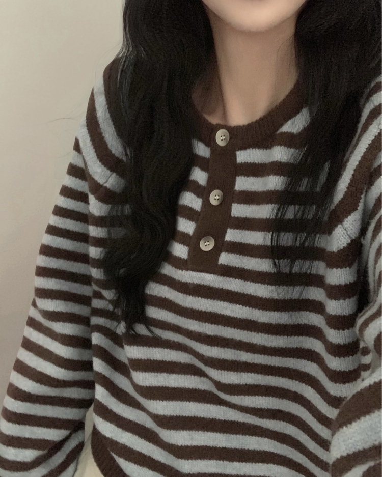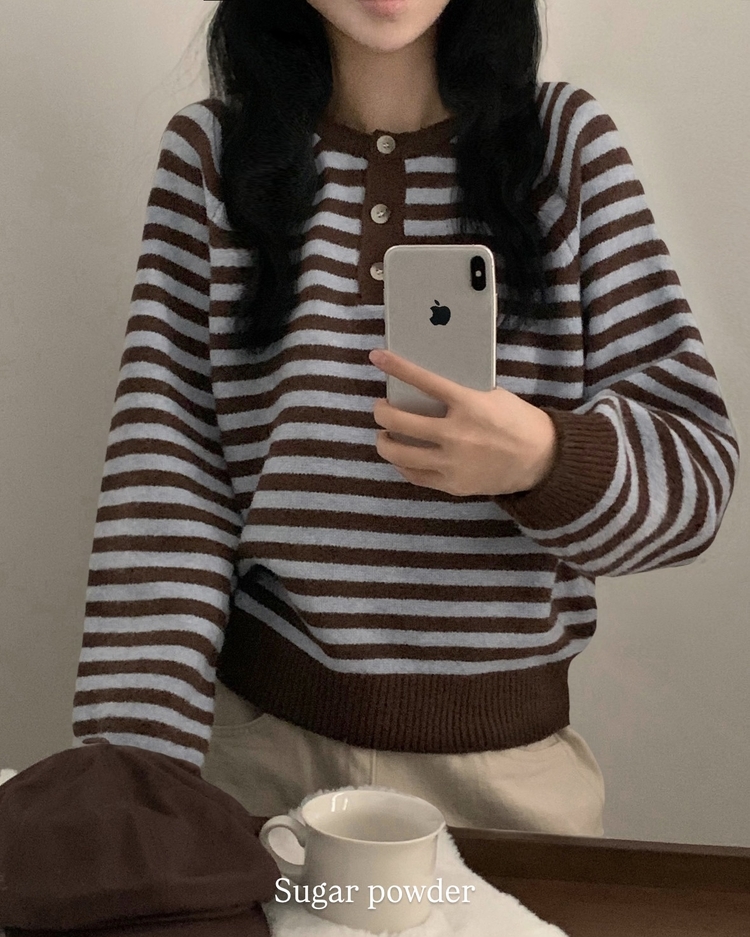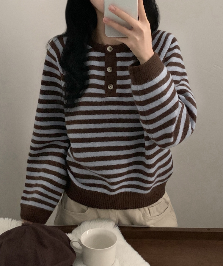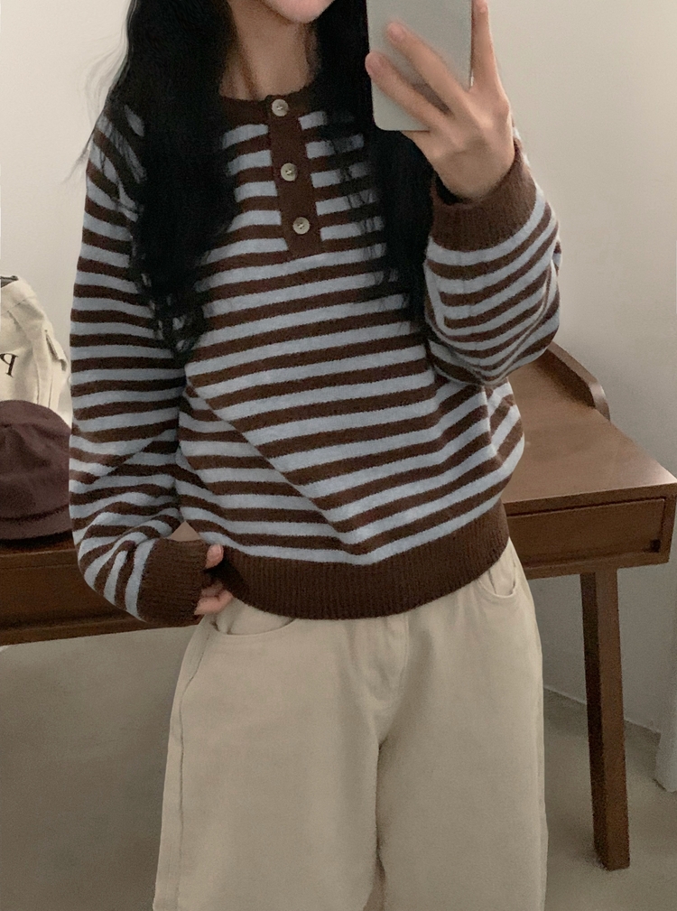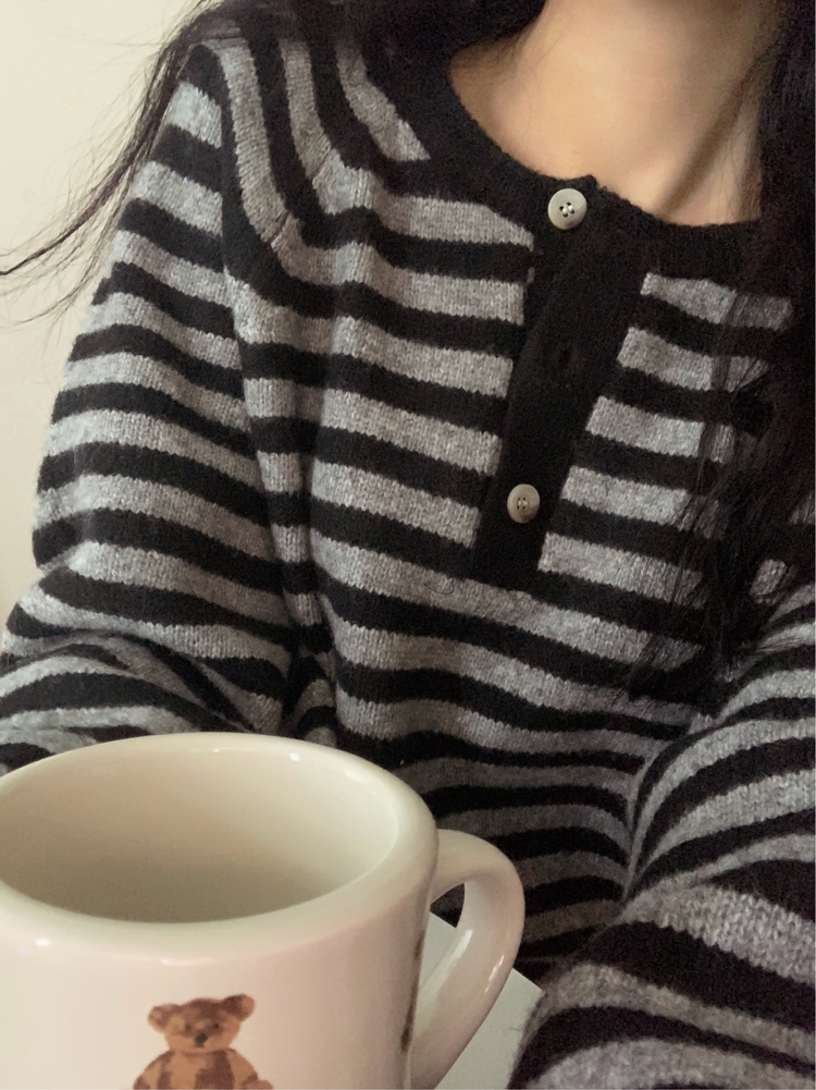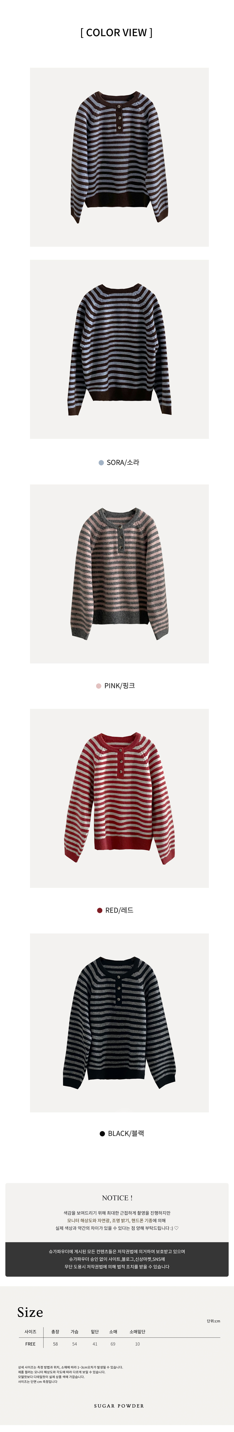 SNT34316 홀리 헨리넥 버튼 스트라이프 긴팔 울니트