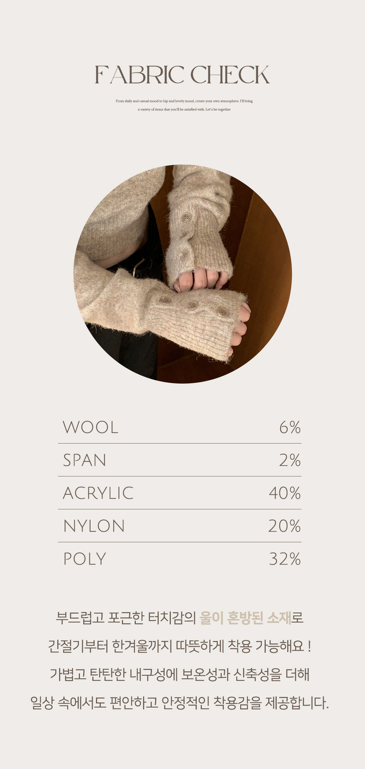 | 素材 | 아크릴(40%), 나일론(20%), 폴리(32%), 울(6%), 스판(2%) |