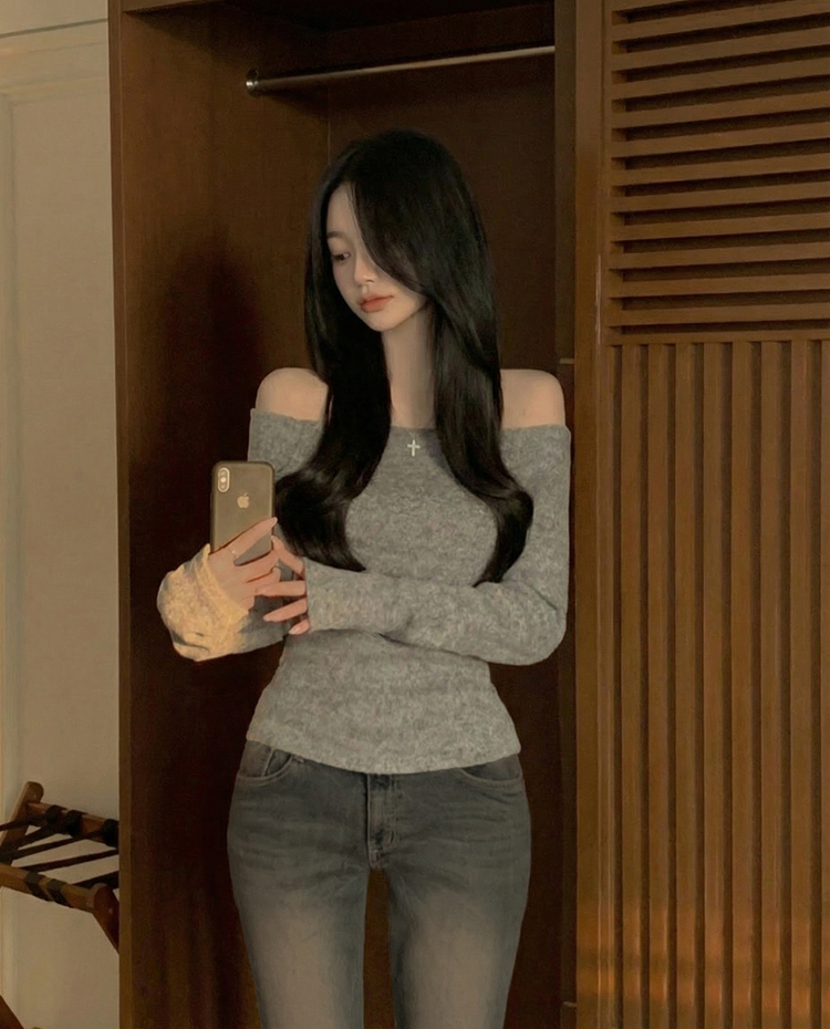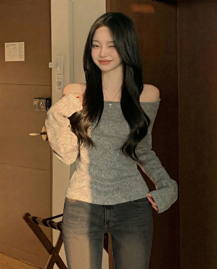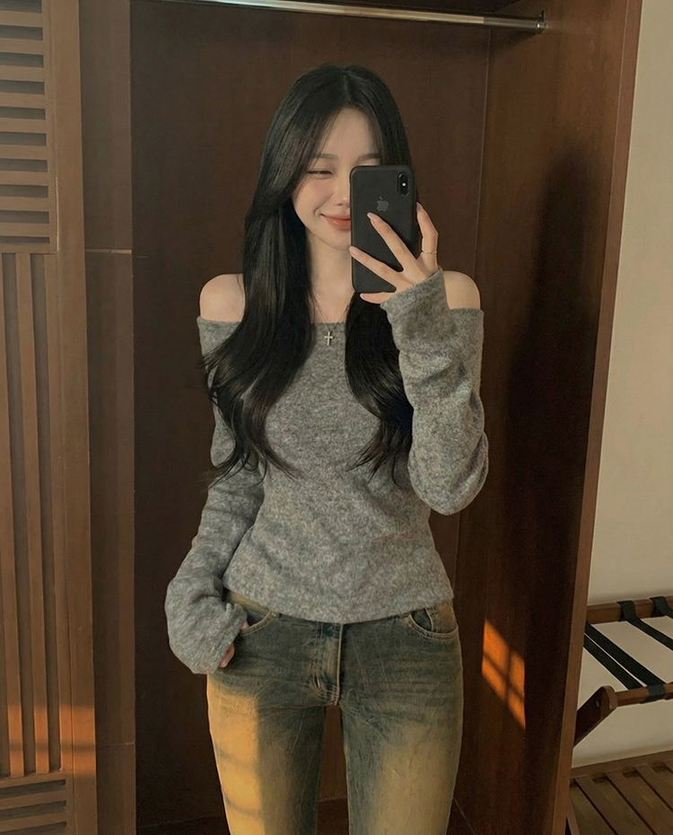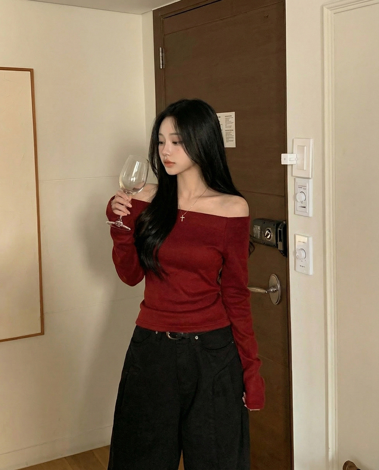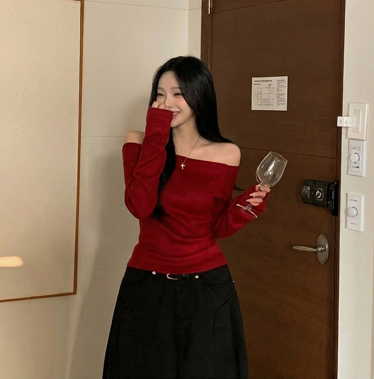 STS74325 손등덮는 여리핏 오프숄더 겨울 기모 슬림핏 긴팔티셔츠 크리스마스룩 파티룩