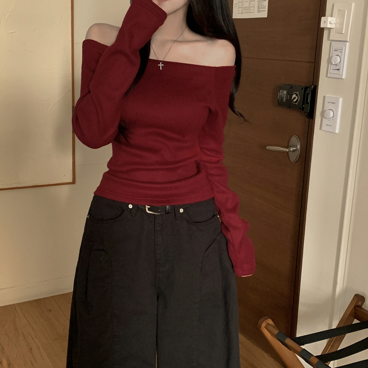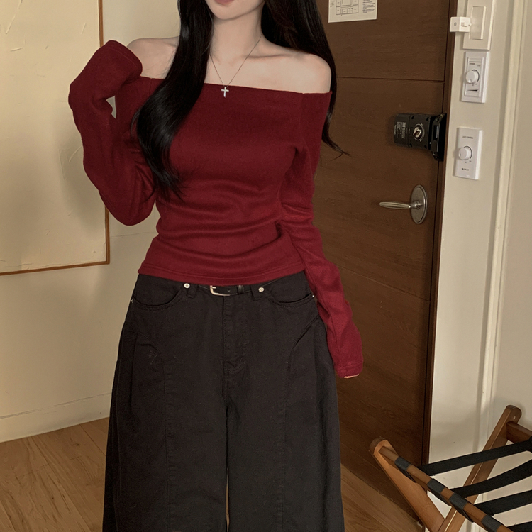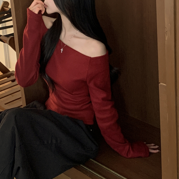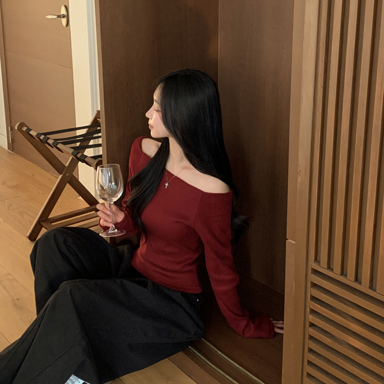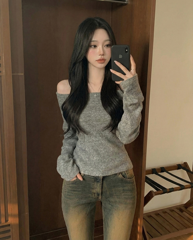 STS74325 손등덮는 여리핏 오프숄더 겨울 기모 슬림핏 긴팔티셔츠 크리스마스룩 파티룩