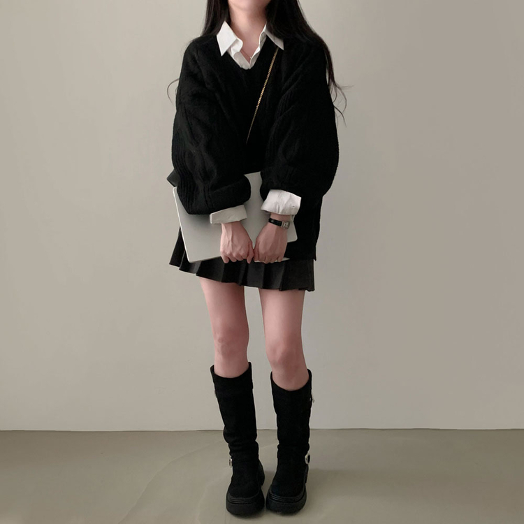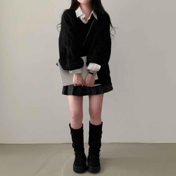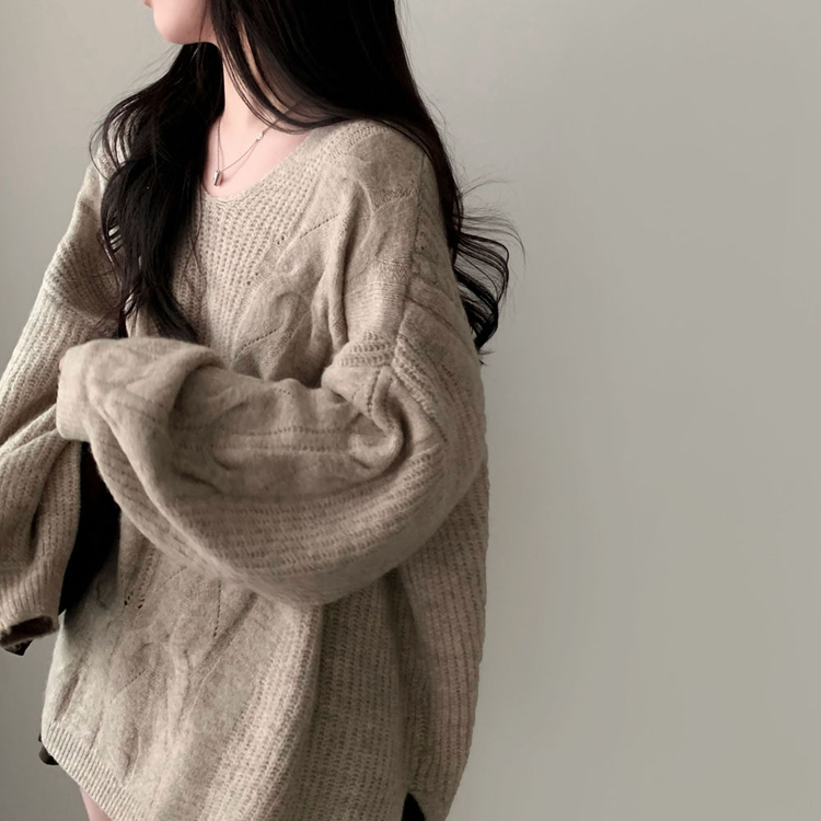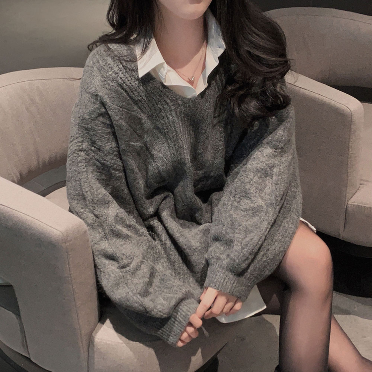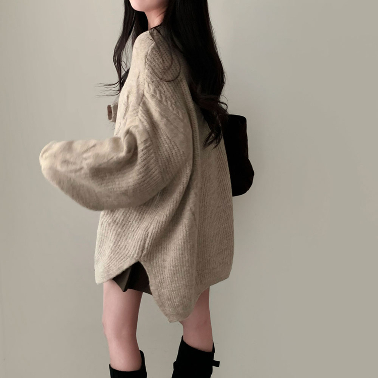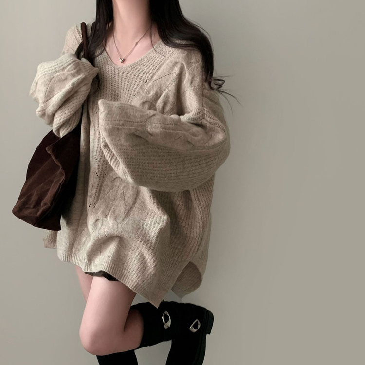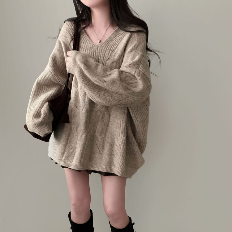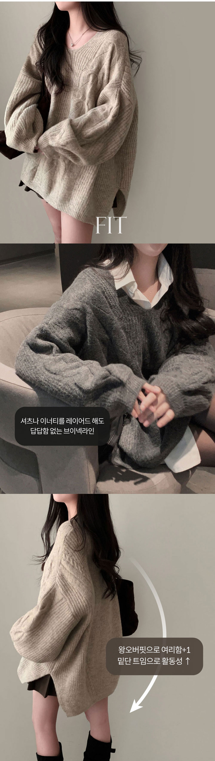 SNT34492 보호본능 자극핏여리함 플러스 꽈배기 꼬임 브이넥 오버핏 니트