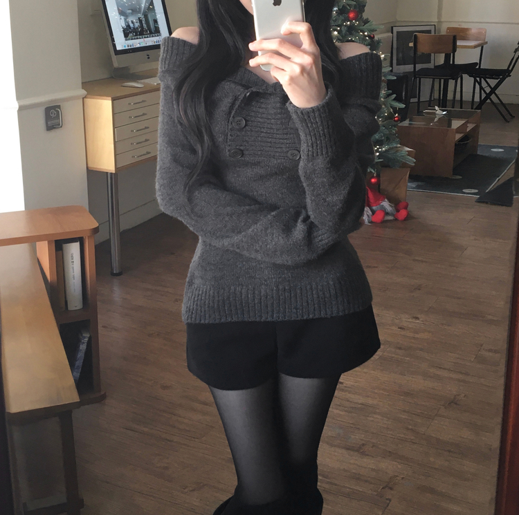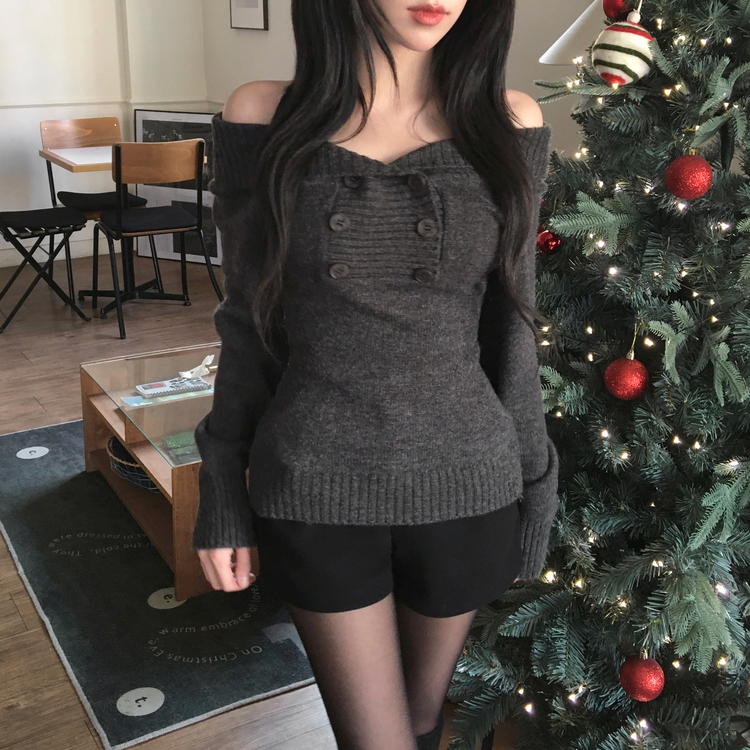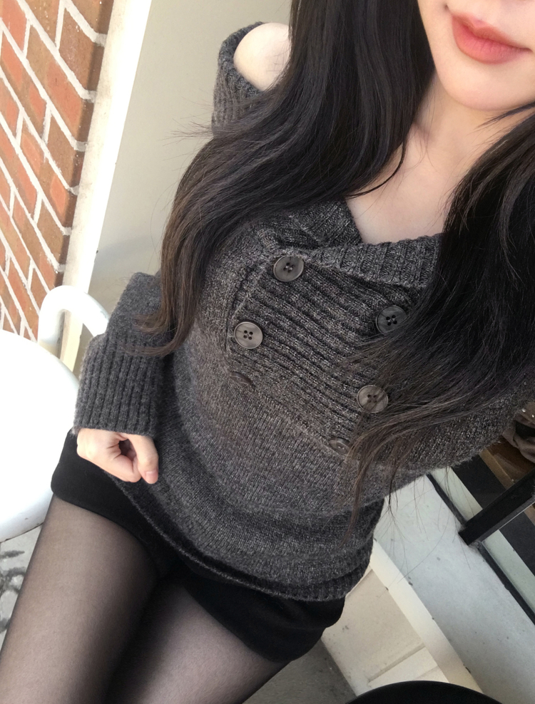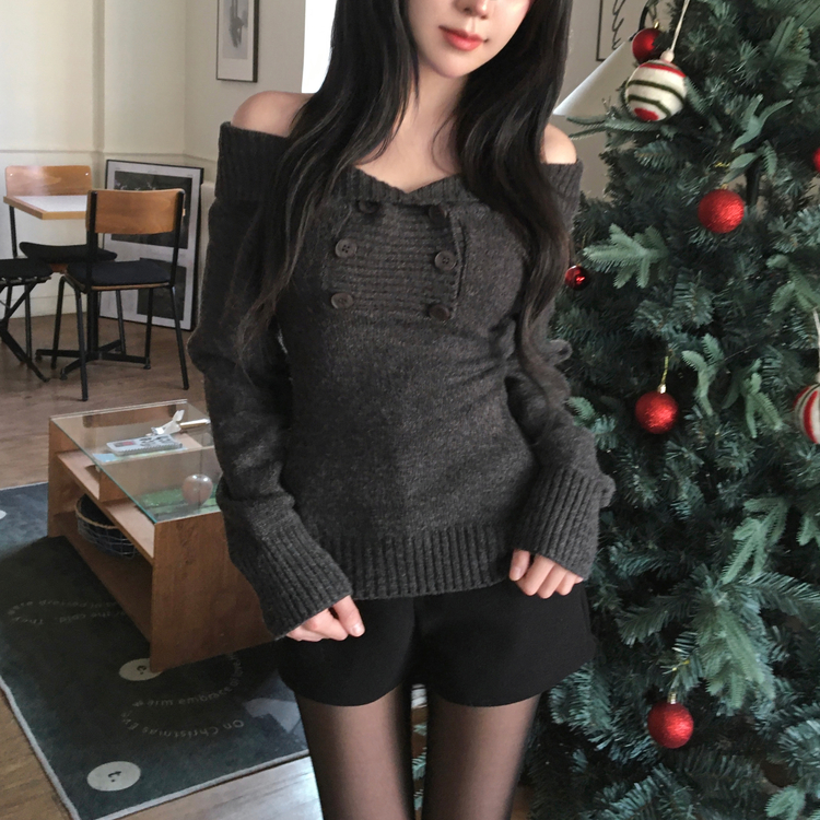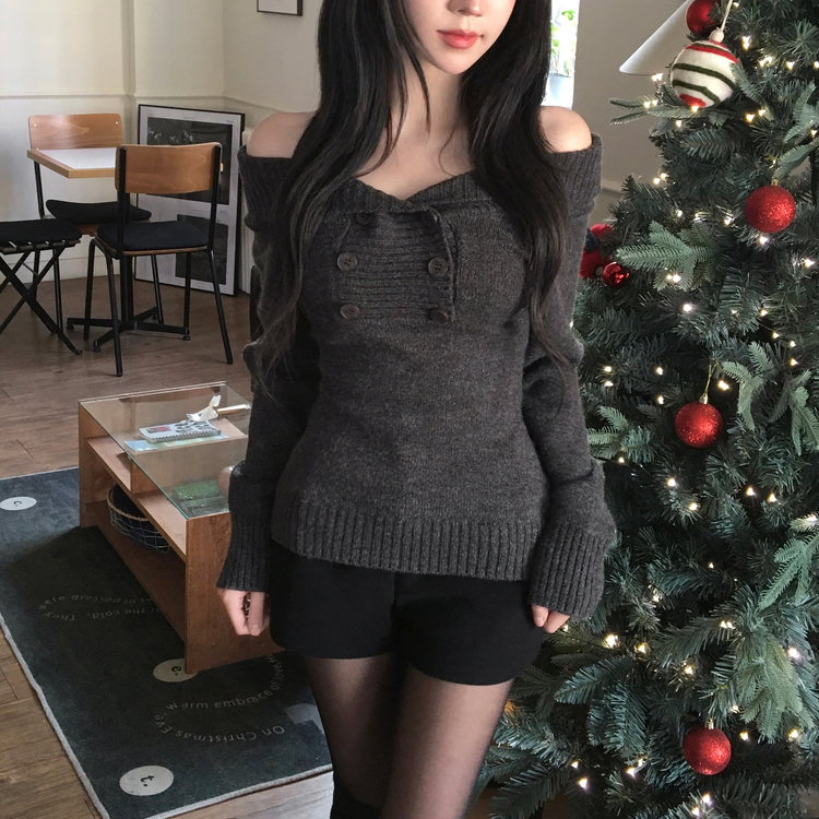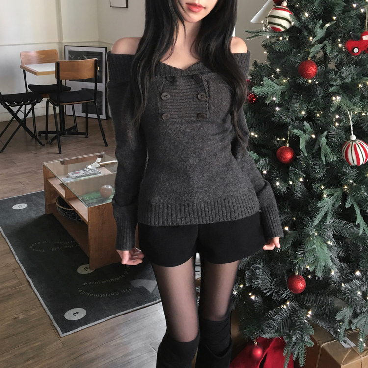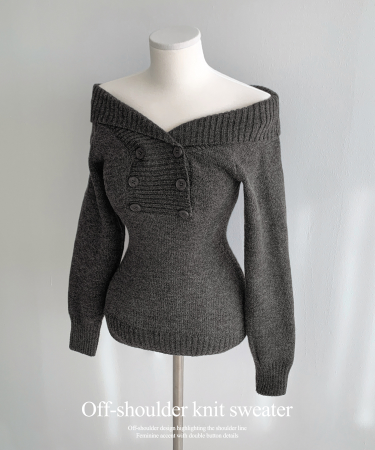 SNT34515 파넬 더블 버튼 오프숄더 슬림핏 긴팔 니트