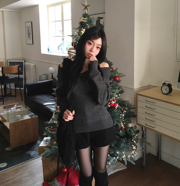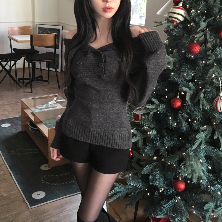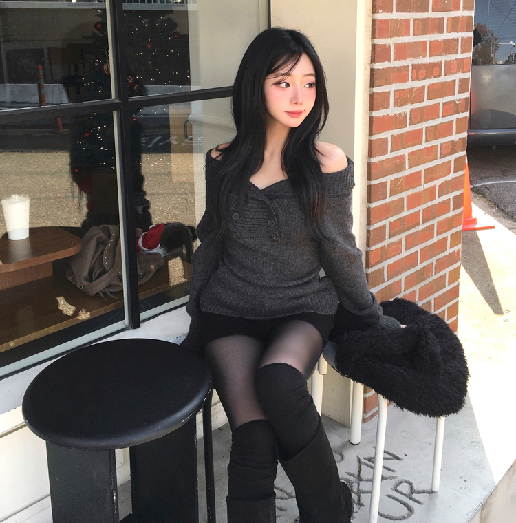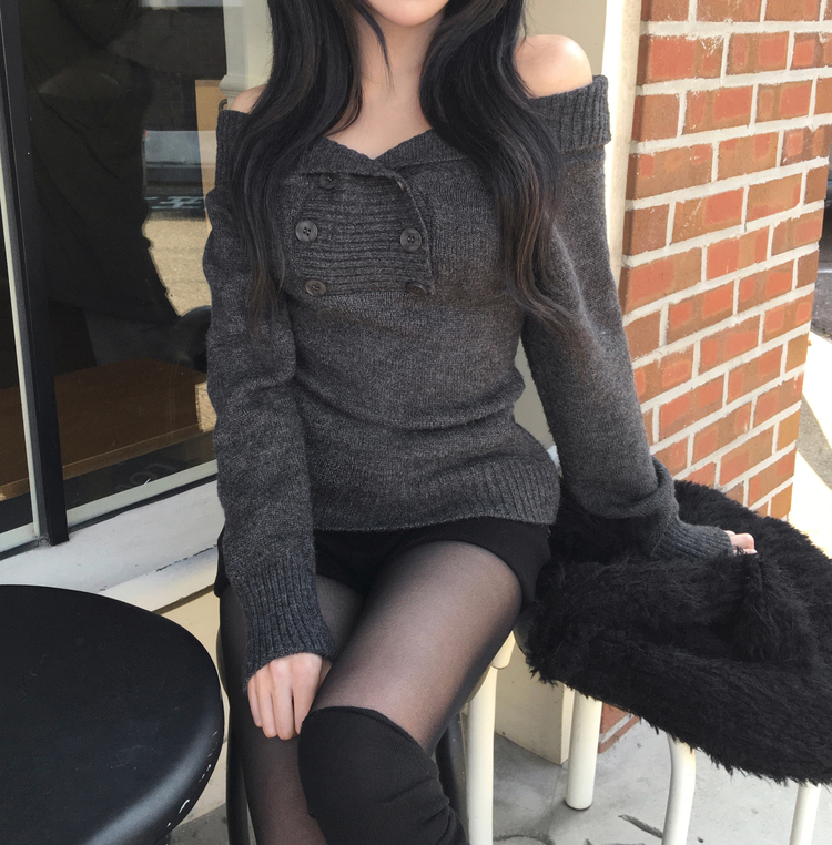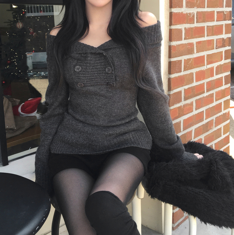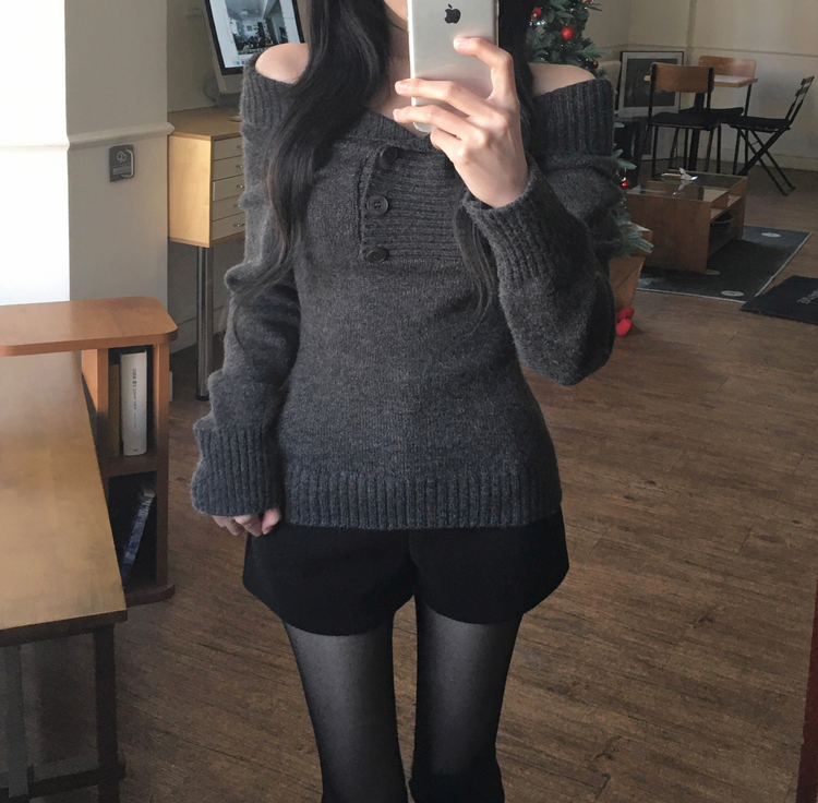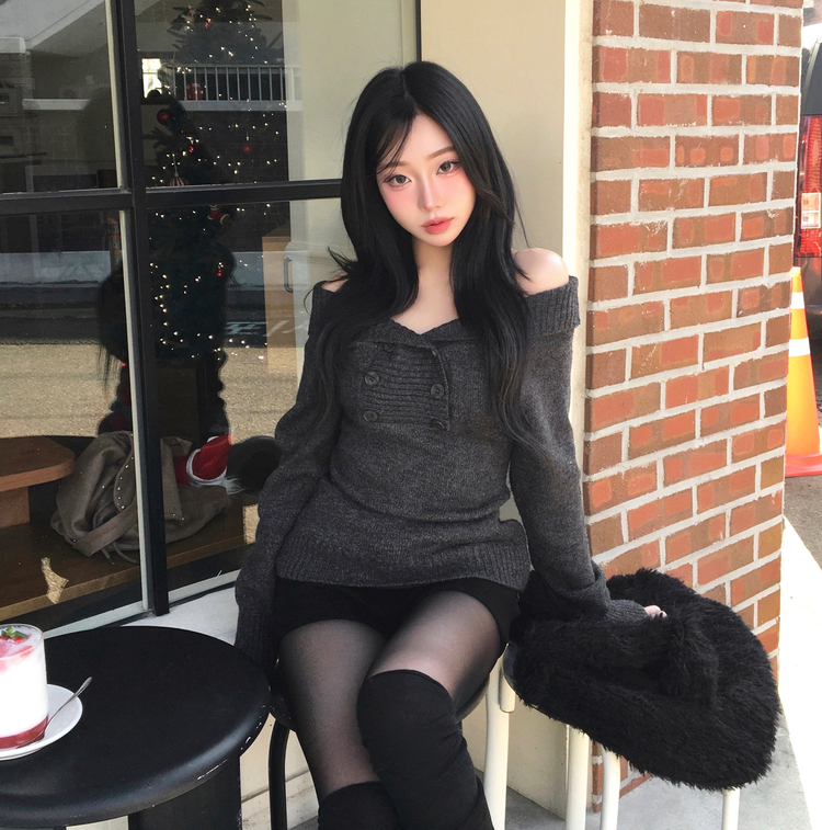 SNT34515 파넬 더블 버튼 오프숄더 슬림핏 긴팔 니트