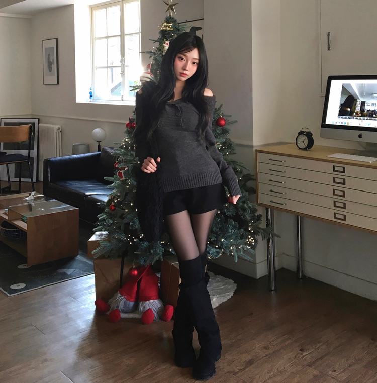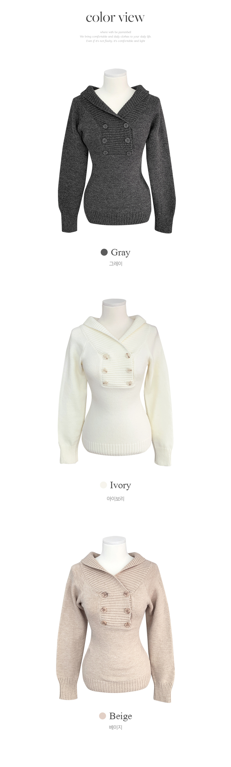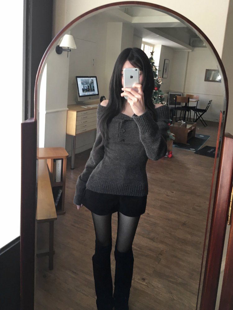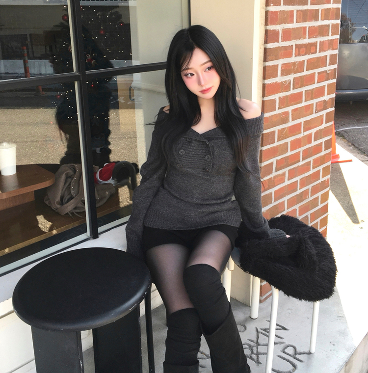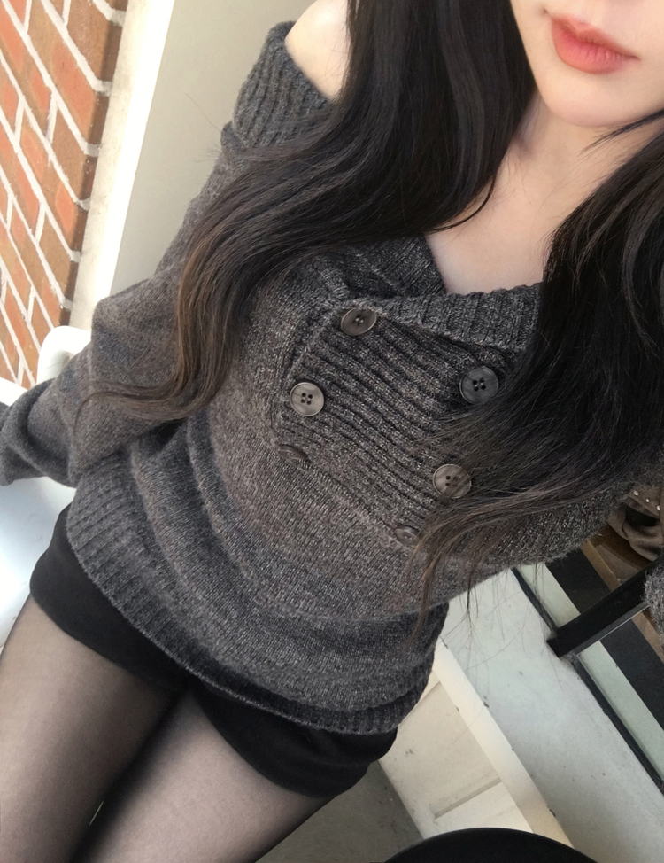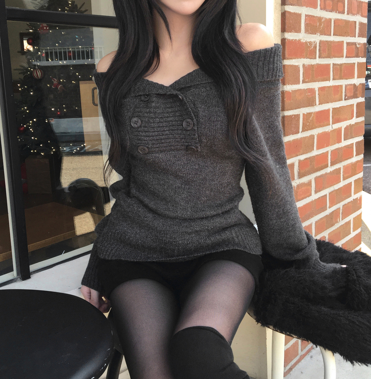 SNT34515 파넬 더블 버튼 오프숄더 슬림핏 긴팔 니트