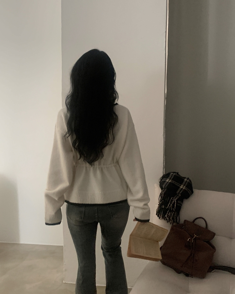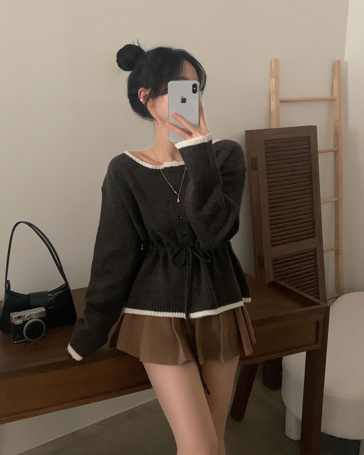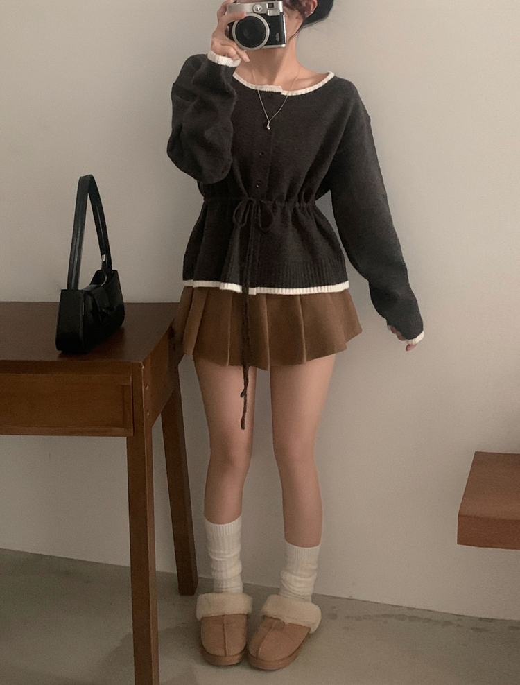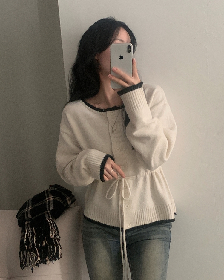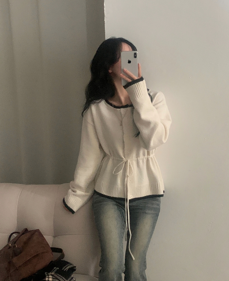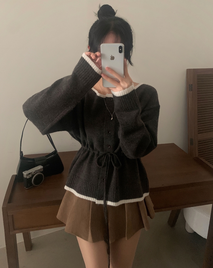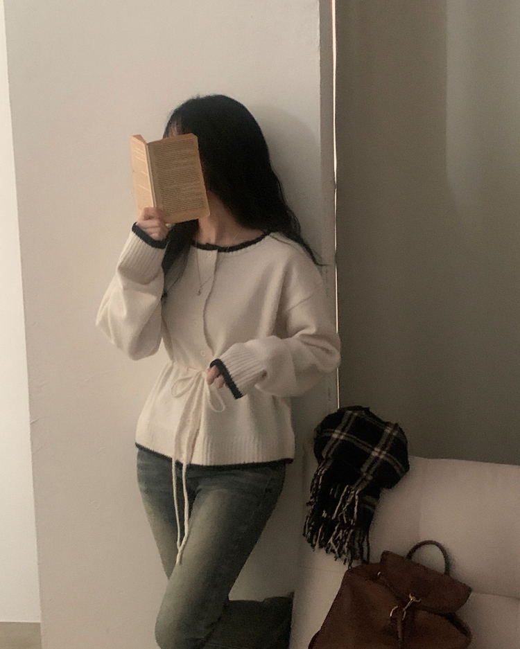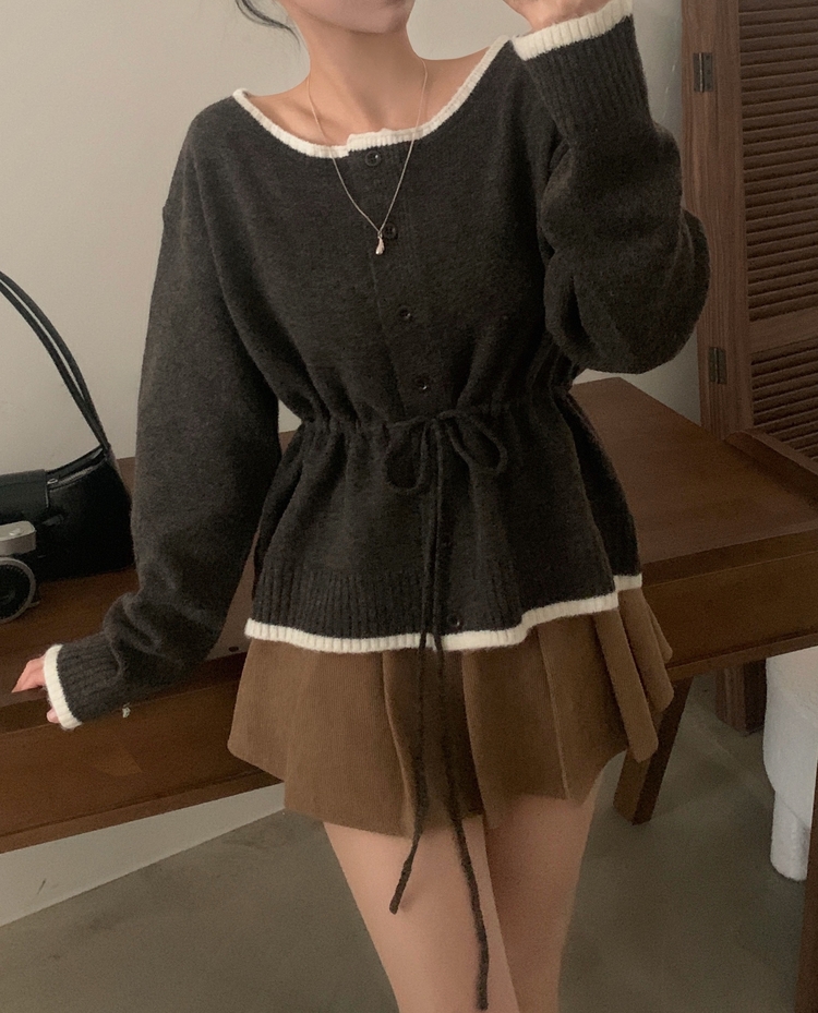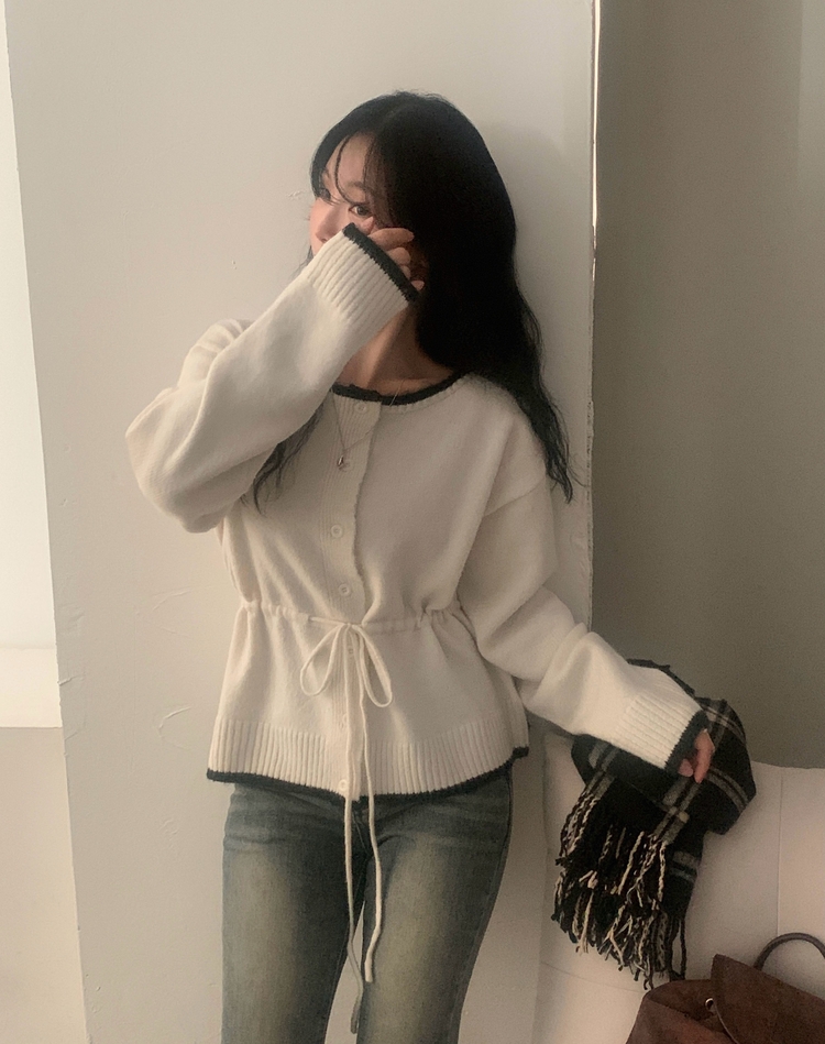 SGD30388 포니 배색 보트넥 허리스트링 울 니트가디건