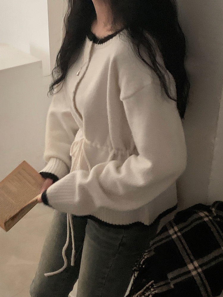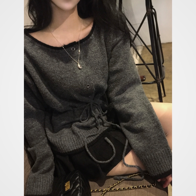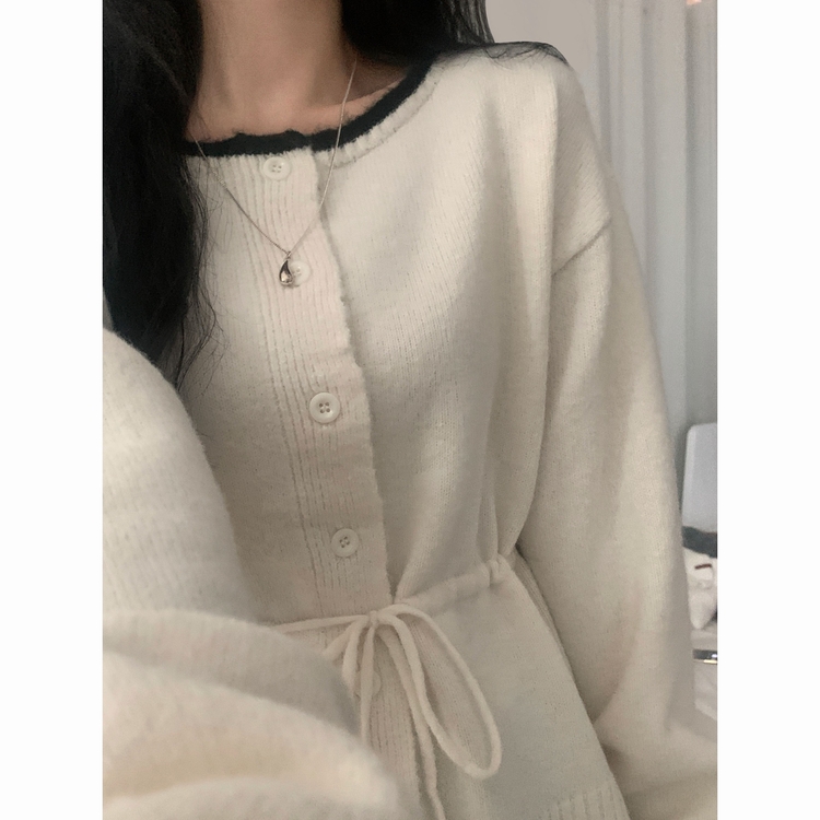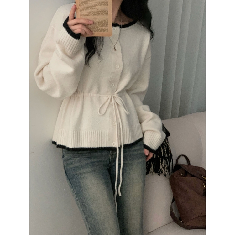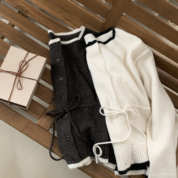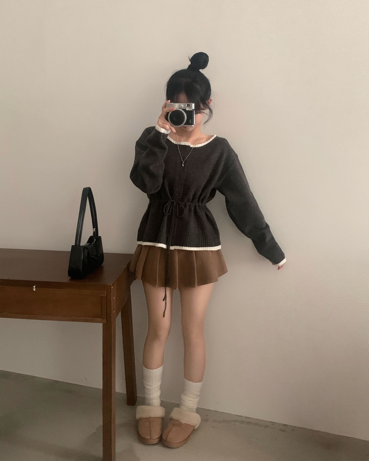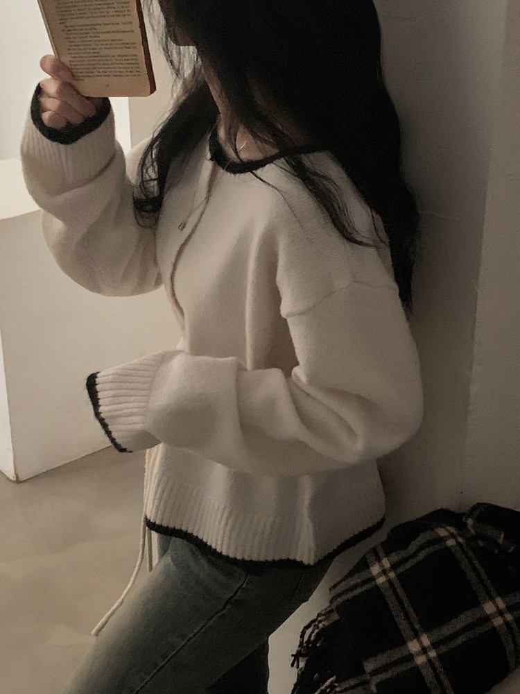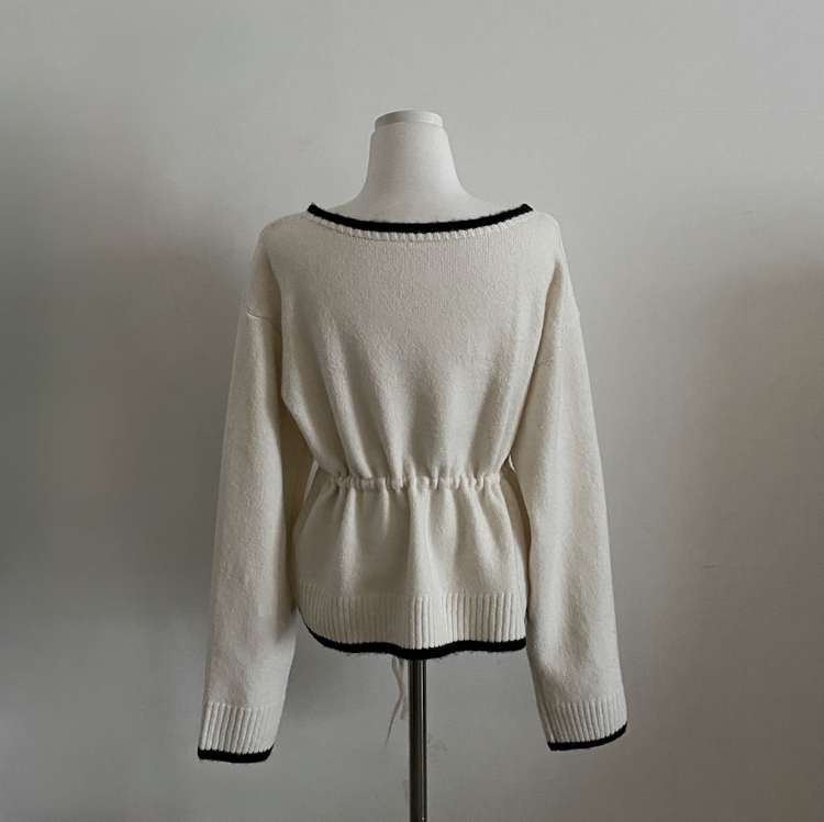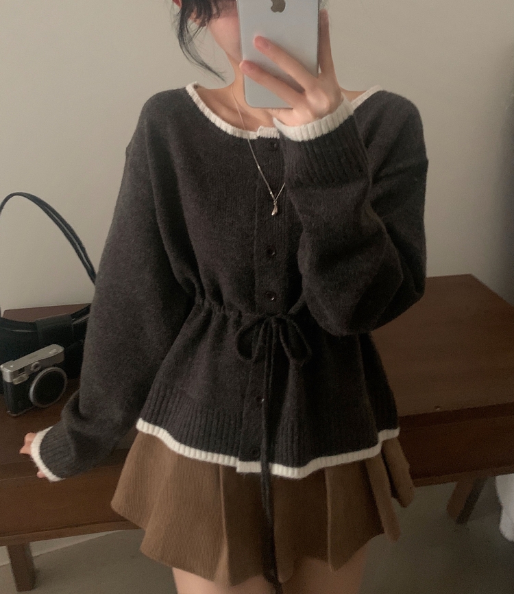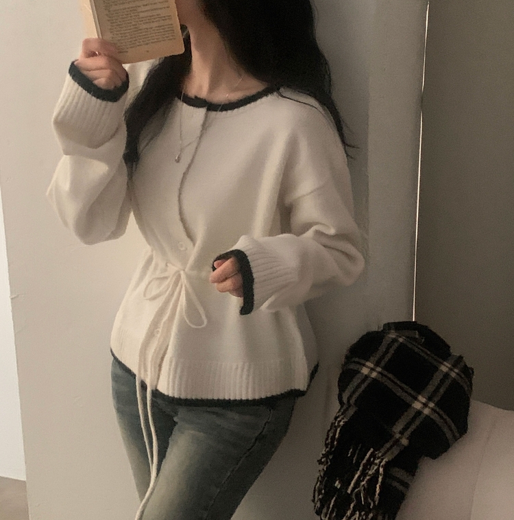 SGD30388 포니 배색 보트넥 허리스트링 울 니트가디건