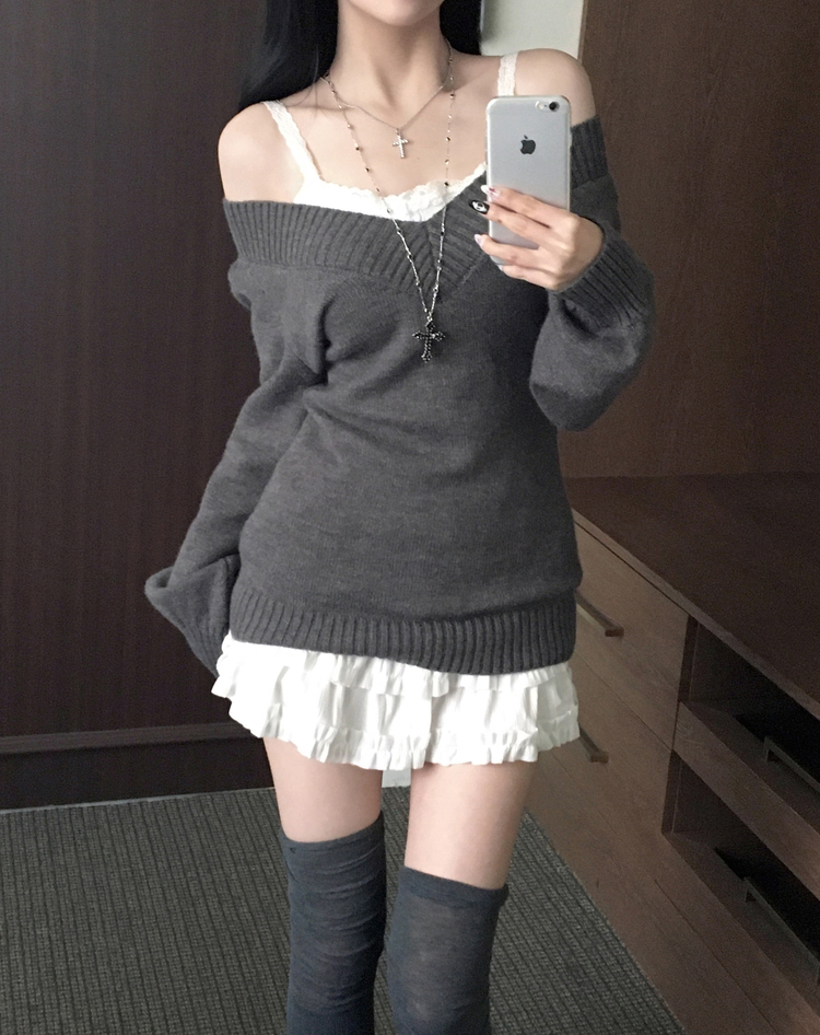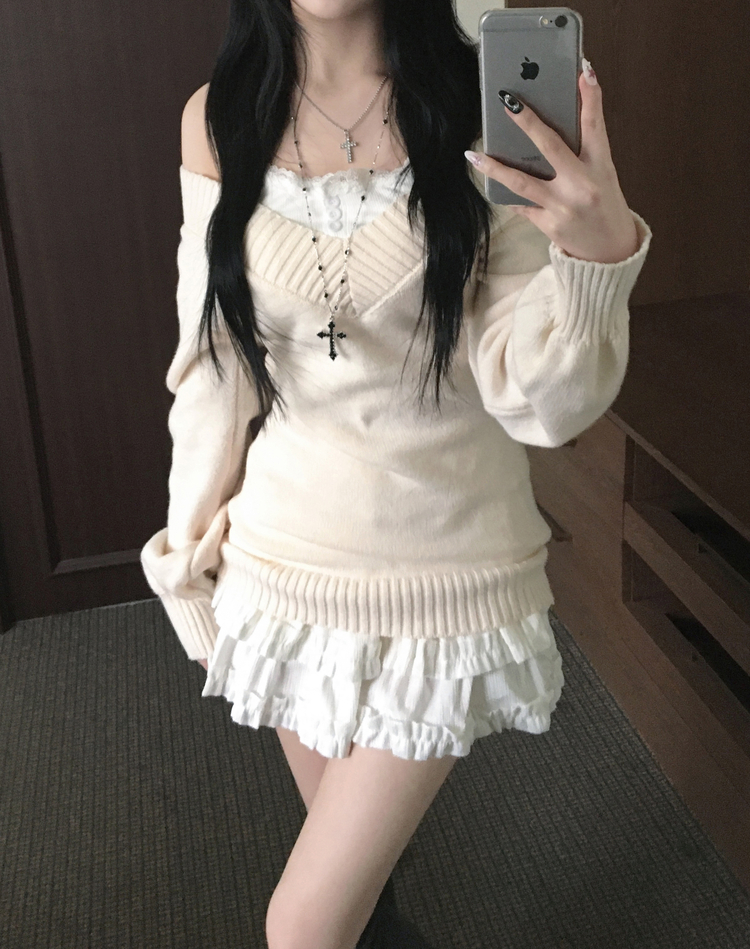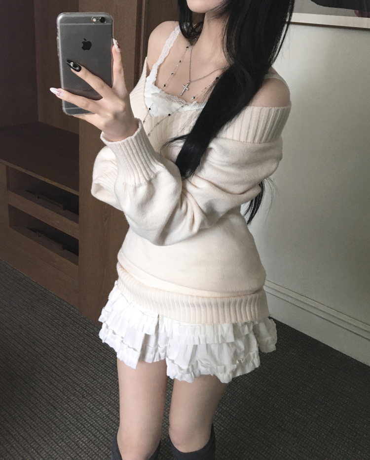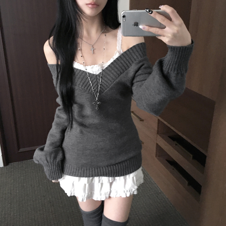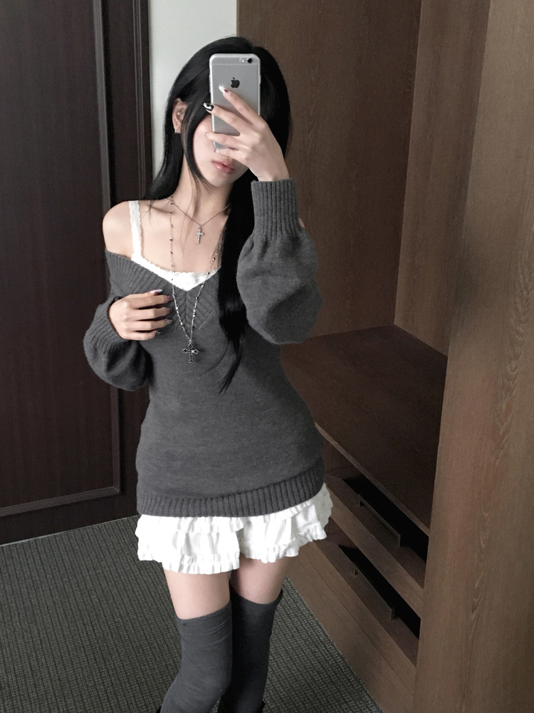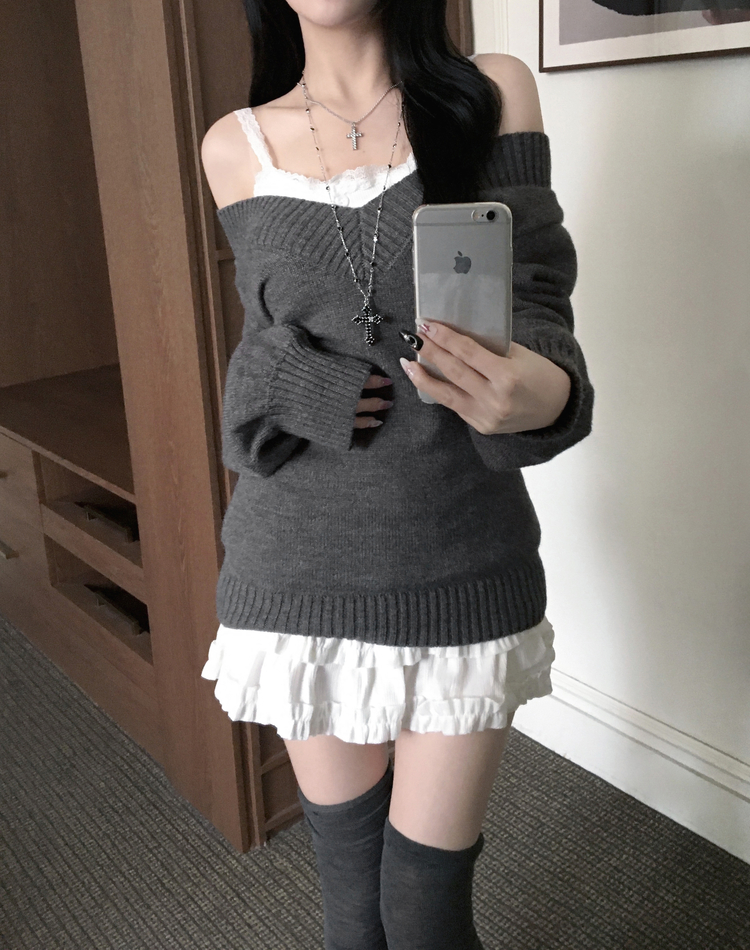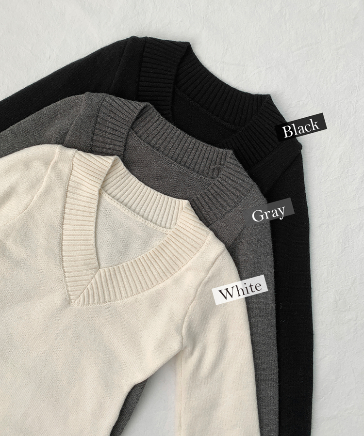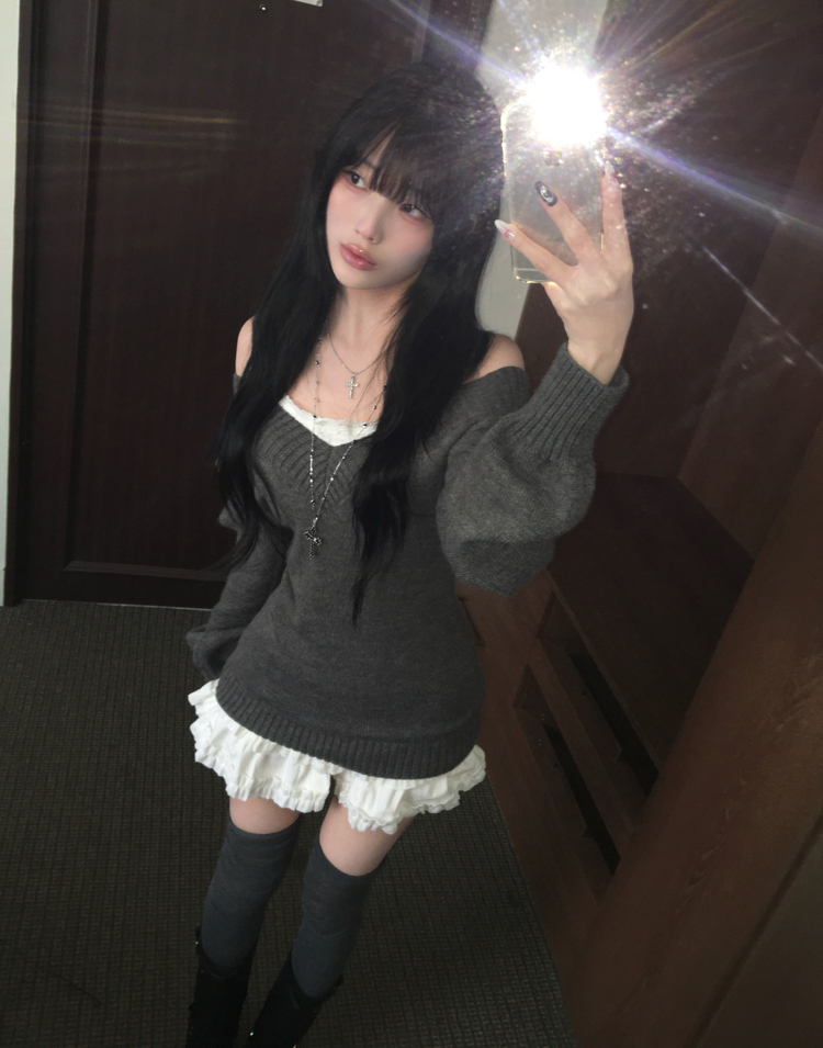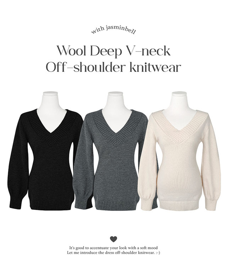 SNT34595 데스 울 딥브이넥 오프숄더 레이어드 벌룬 슬림 롱 니트