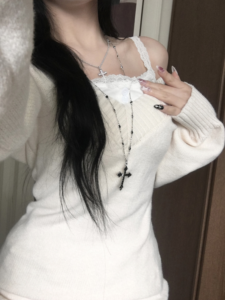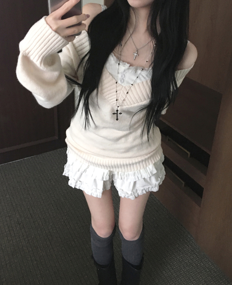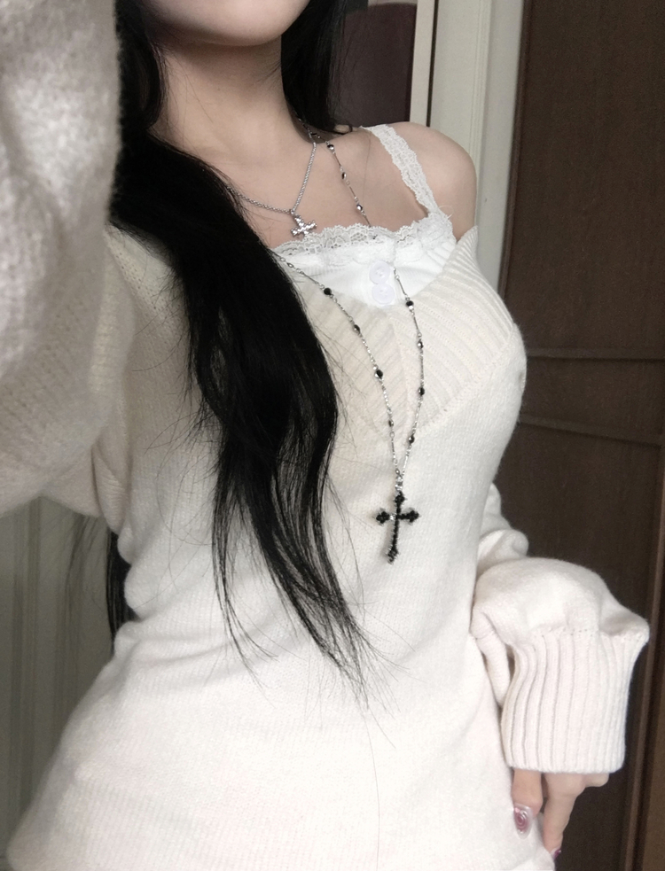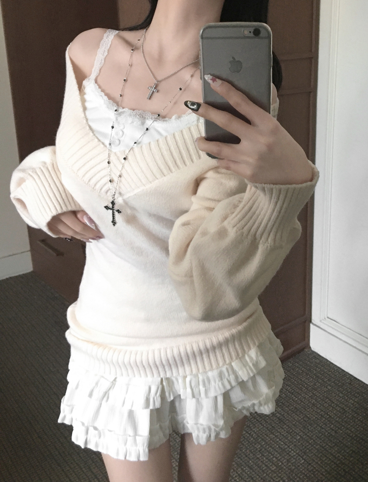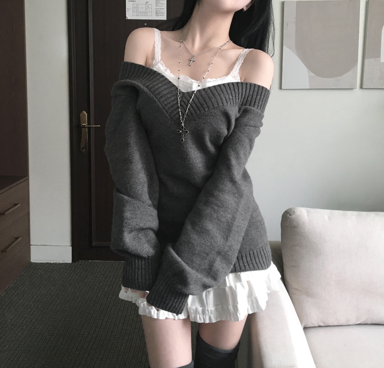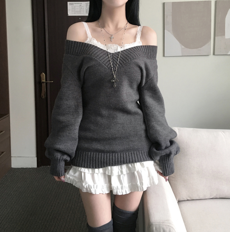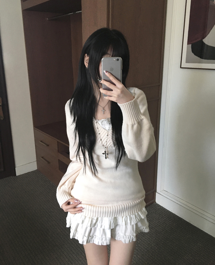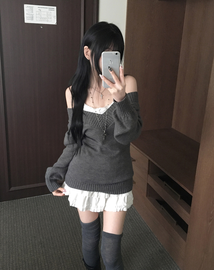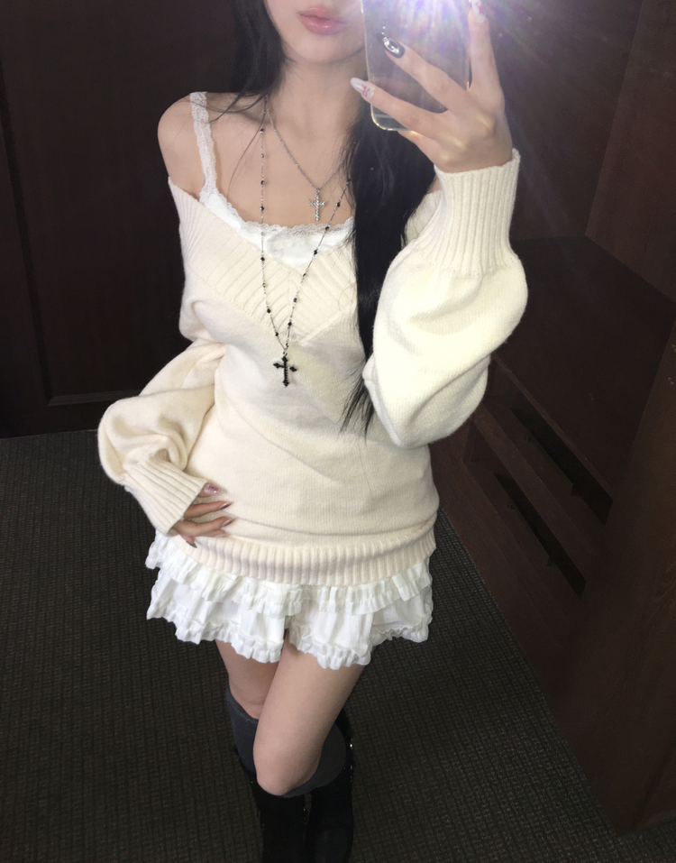SNT34595 데스 울 딥브이넥 오프숄더 레이어드 벌룬 슬림 롱 니트