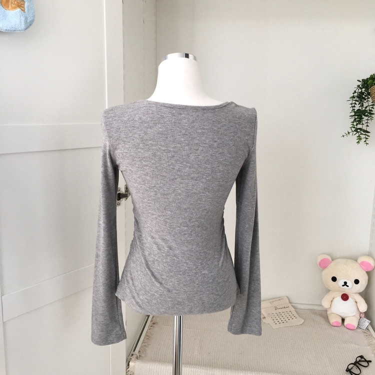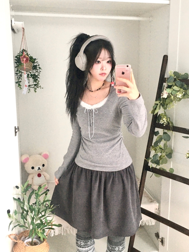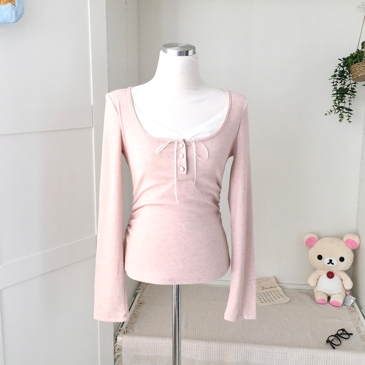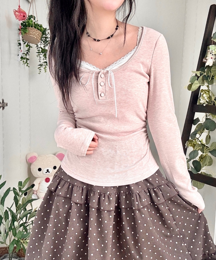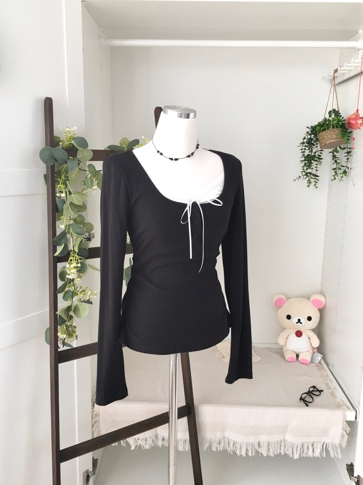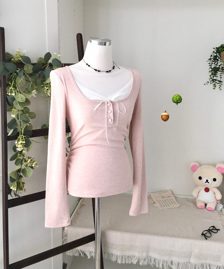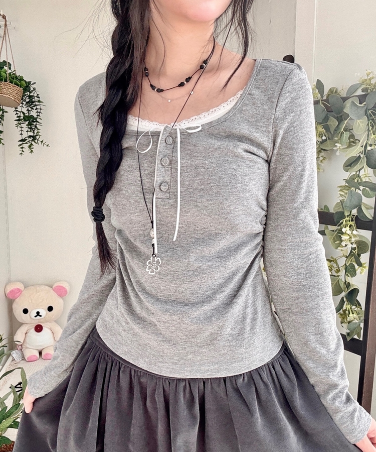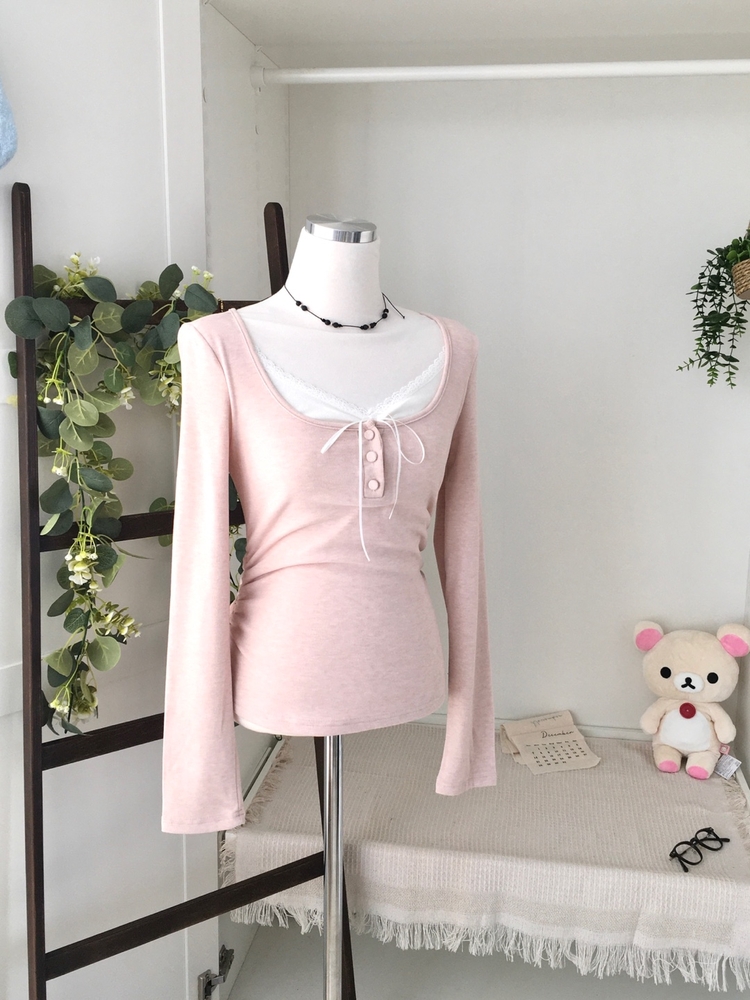 STS74549 일체형 리본 단추 버튼 레이어드 옆셔링 긴팔티셔츠