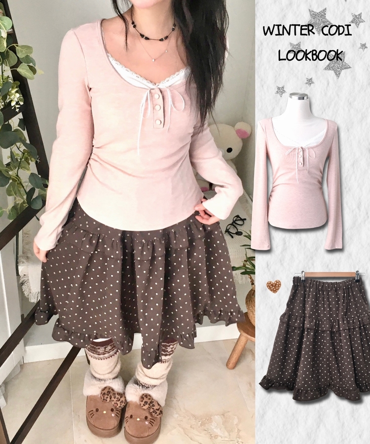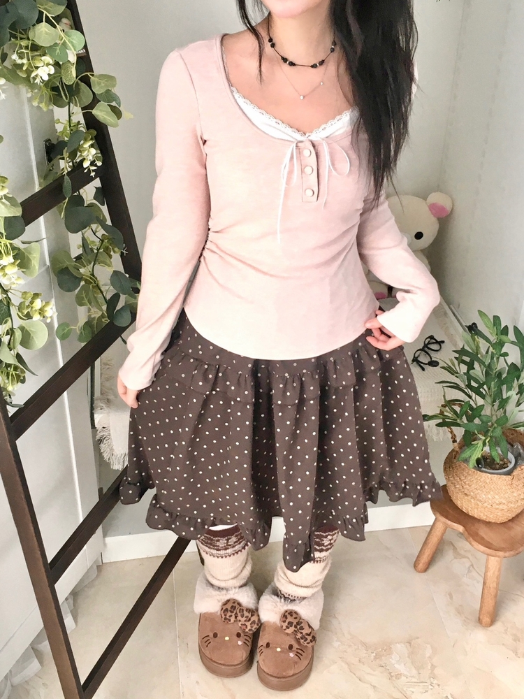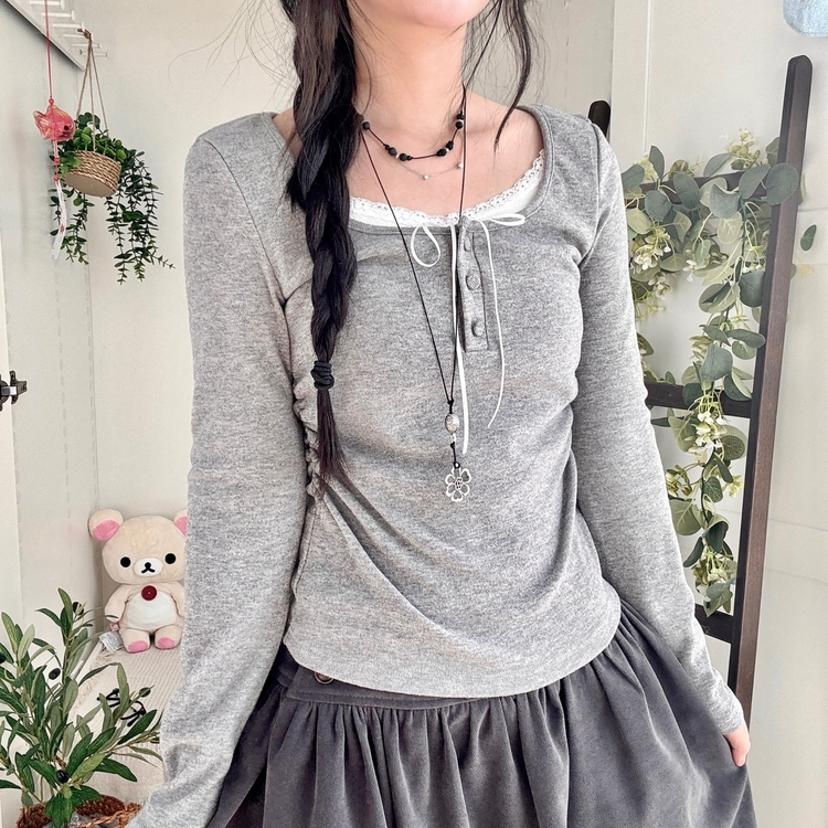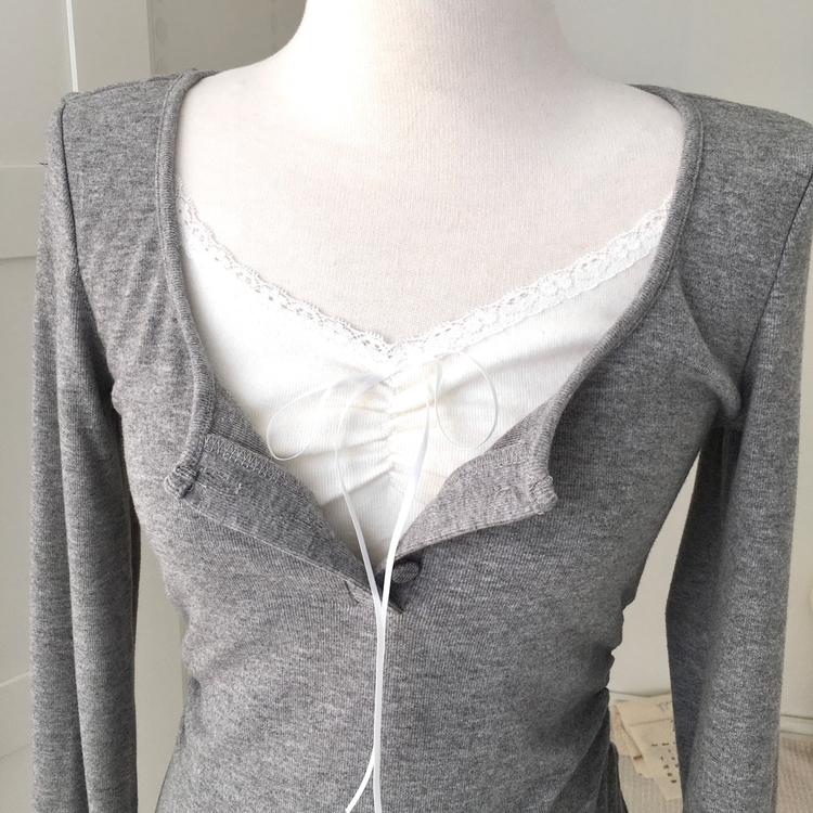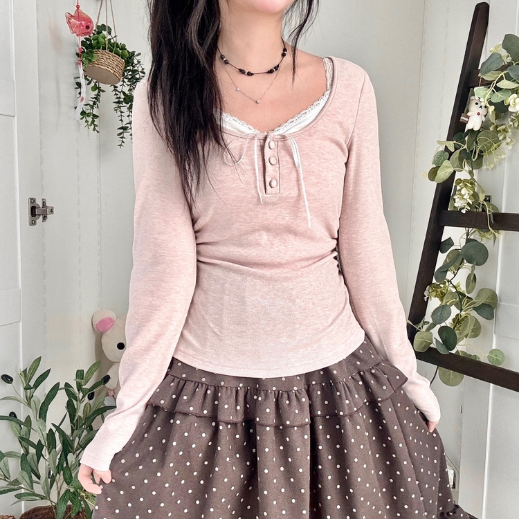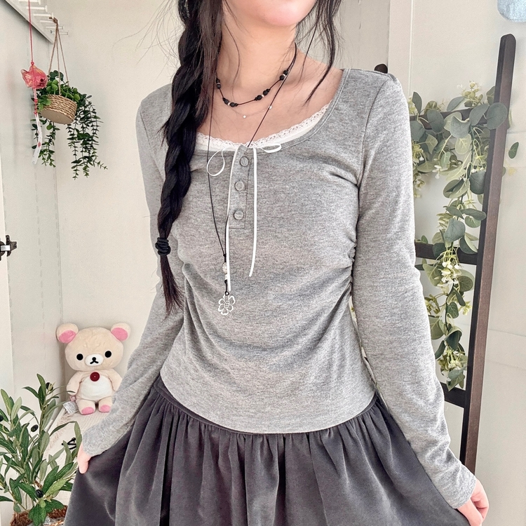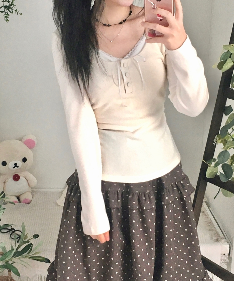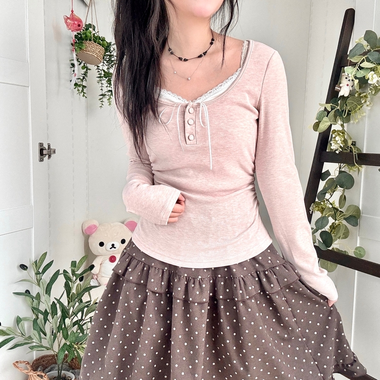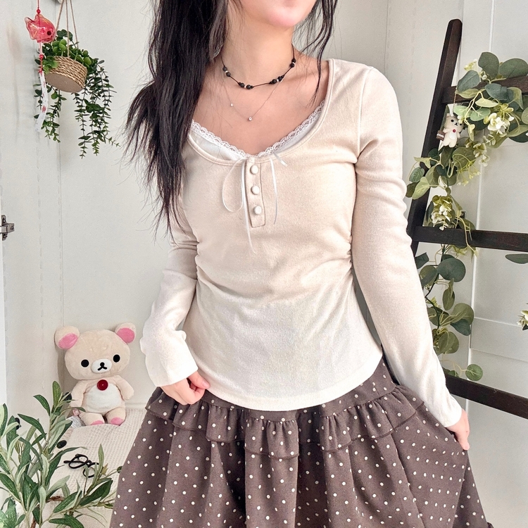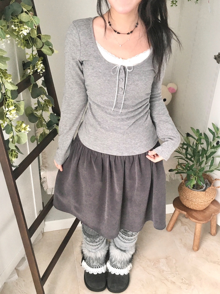 STS74549 일체형 리본 단추 버튼 레이어드 옆셔링 긴팔티셔츠