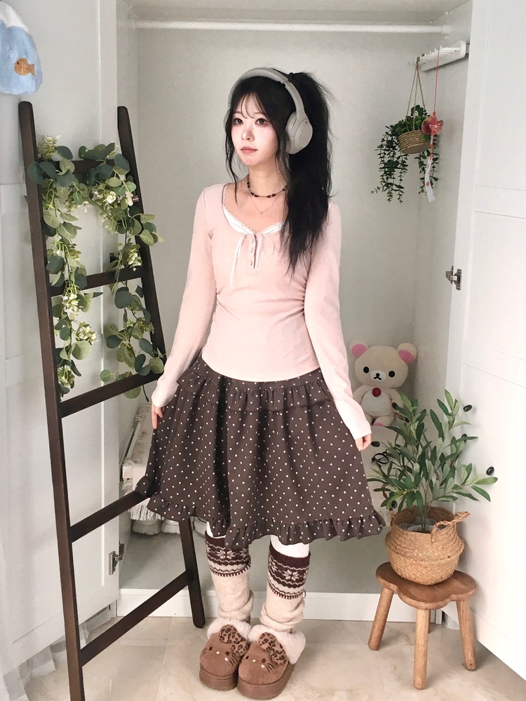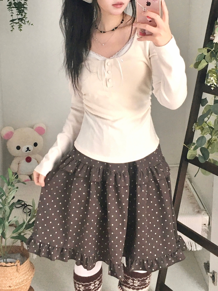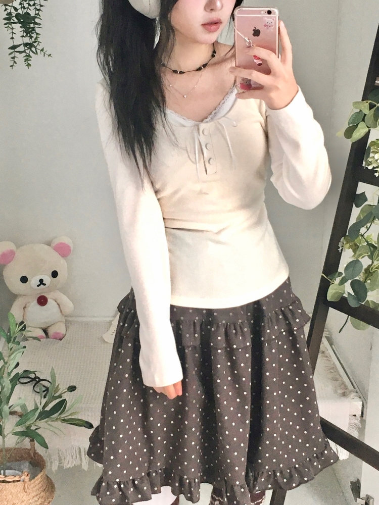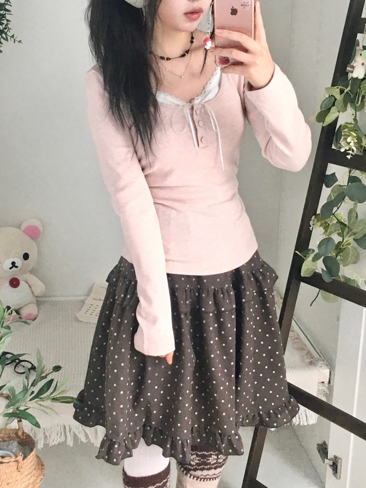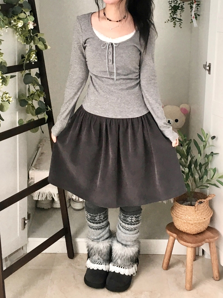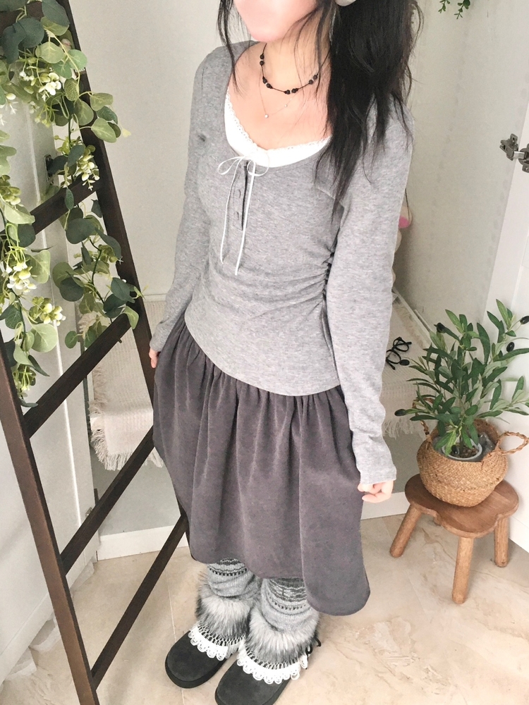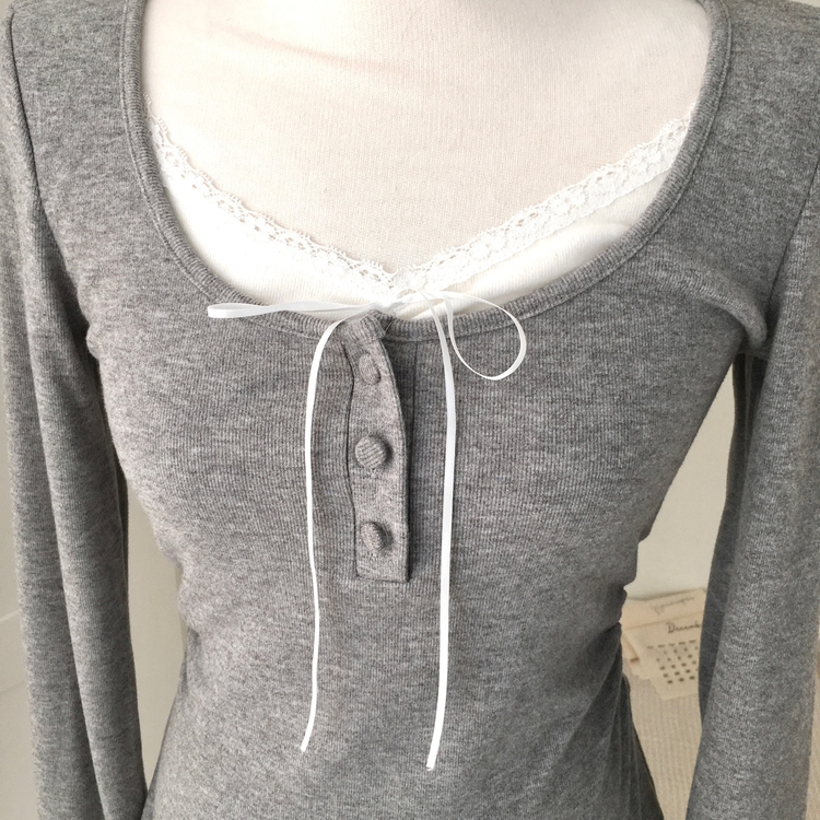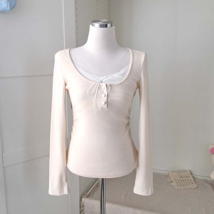 STS74549 일체형 리본 단추 버튼 레이어드 옆셔링 긴팔티셔츠