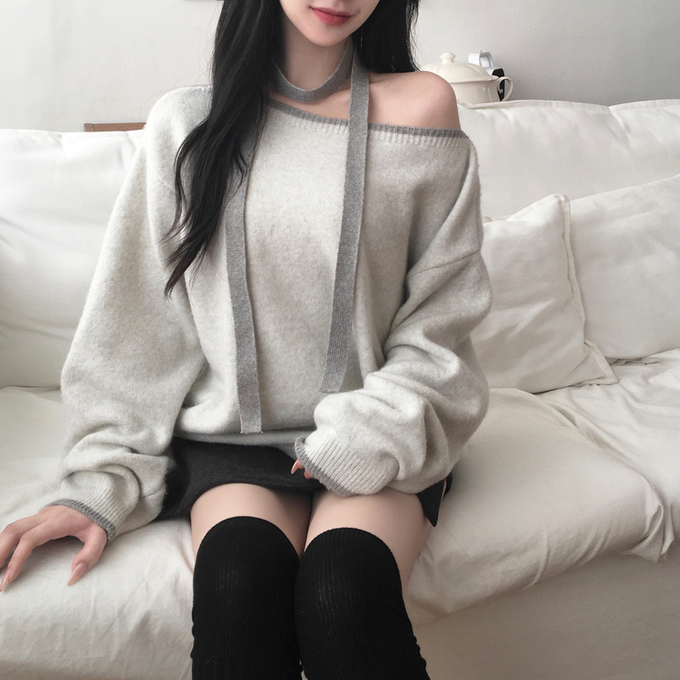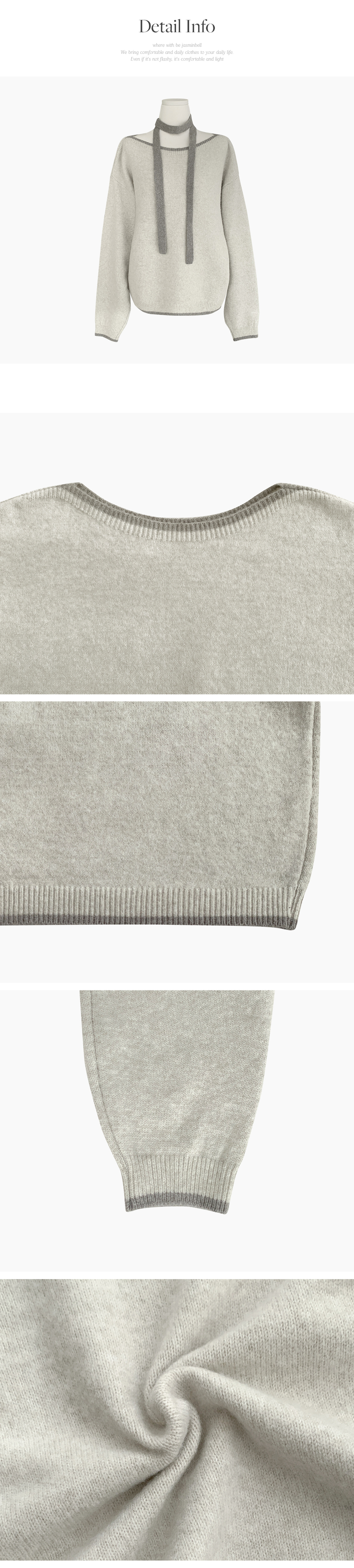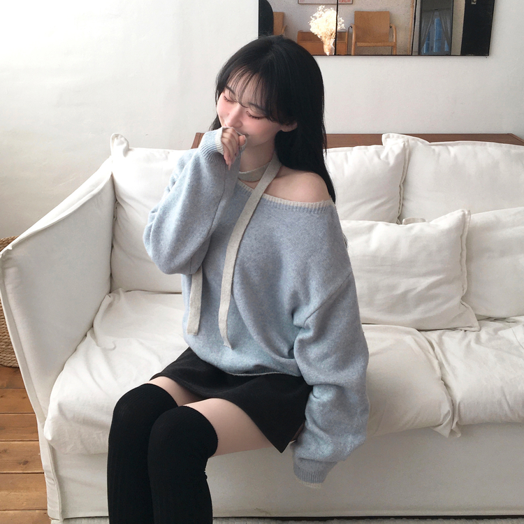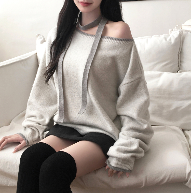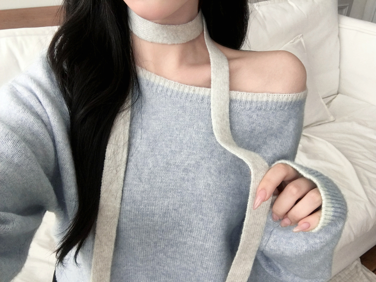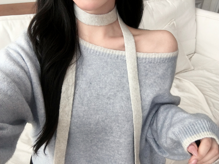 SNT34953 데르온 배색 입술넥 오프숄더 머플러 초커 긴팔 니트
