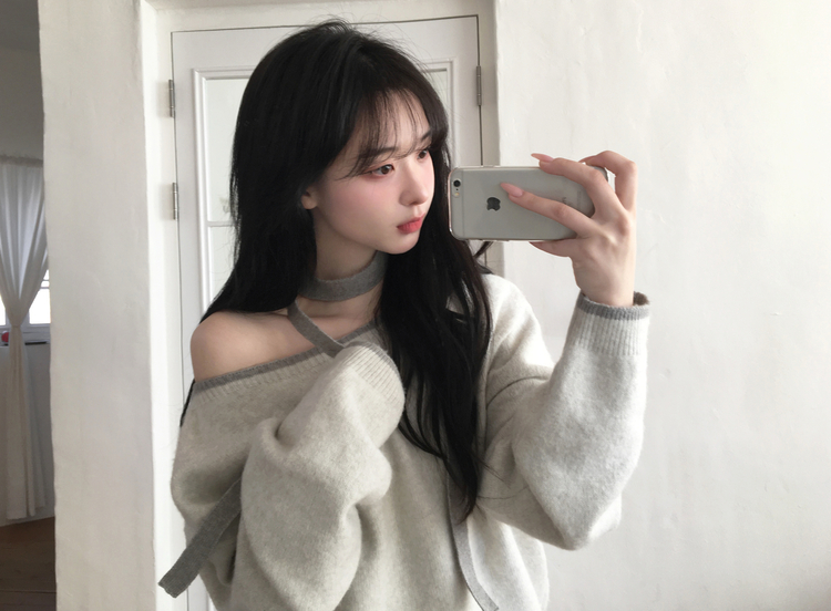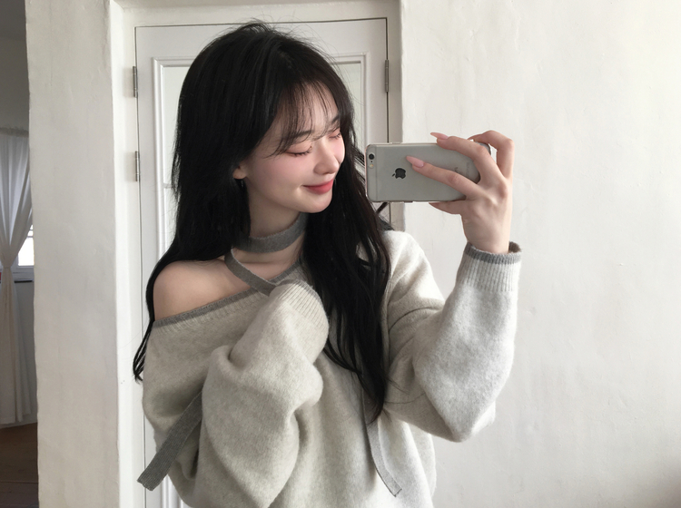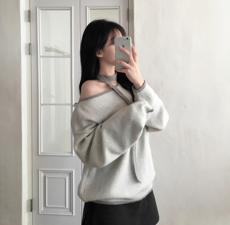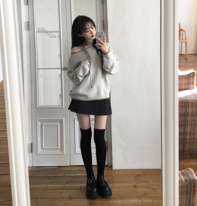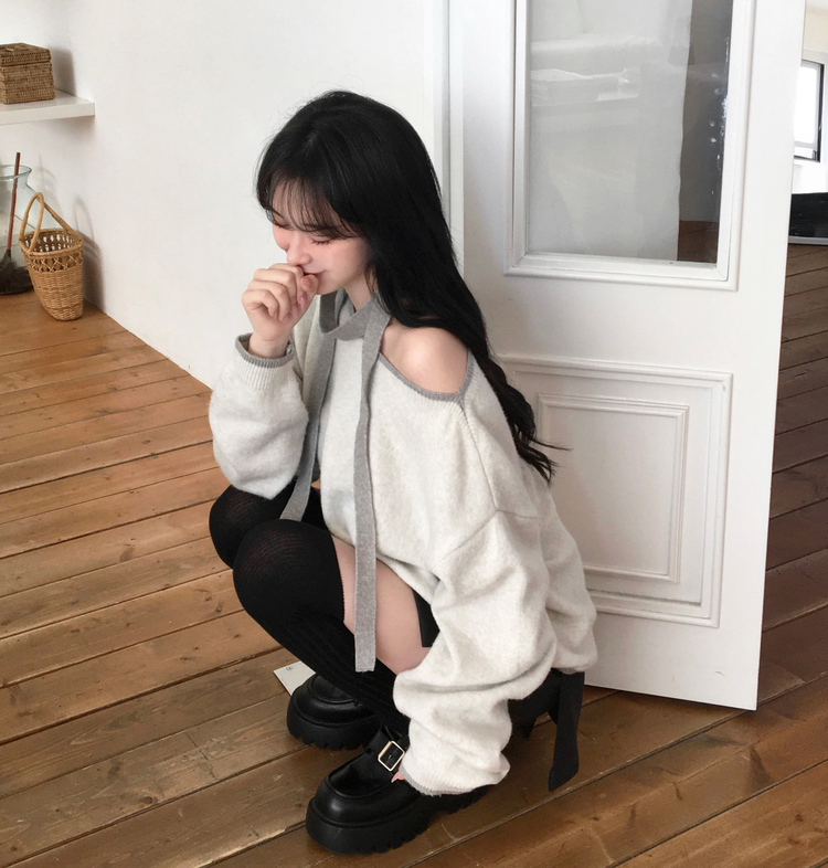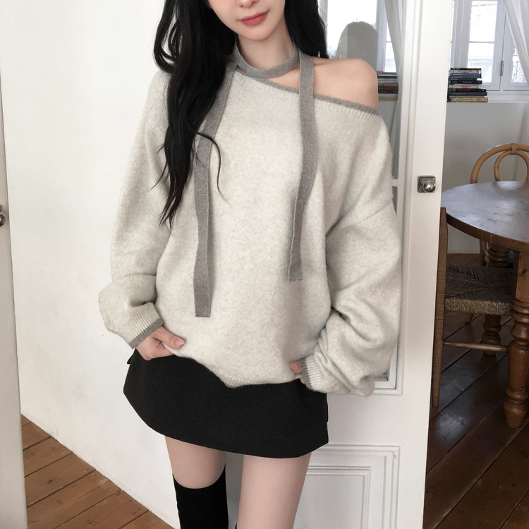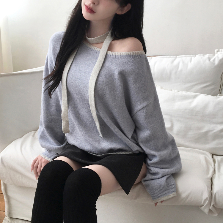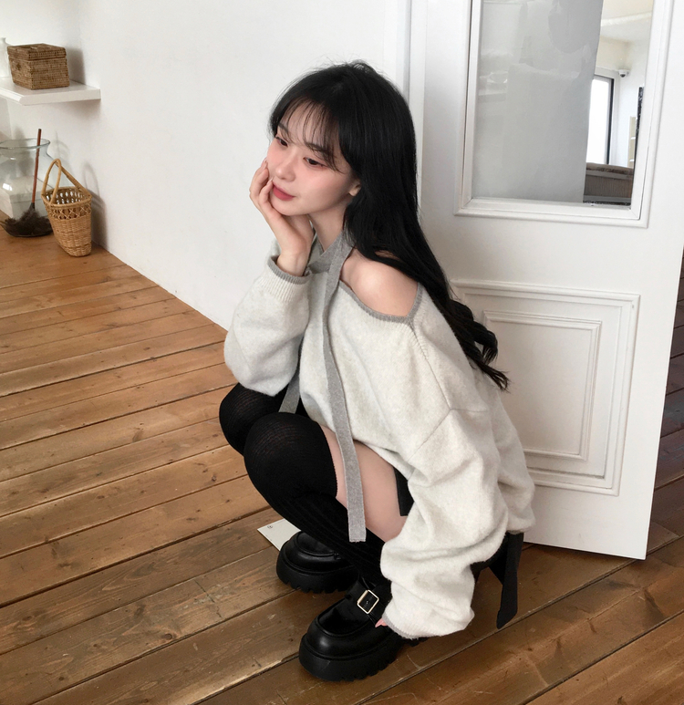 SNT34953 데르온 배색 입술넥 오프숄더 머플러 초커 긴팔 니트