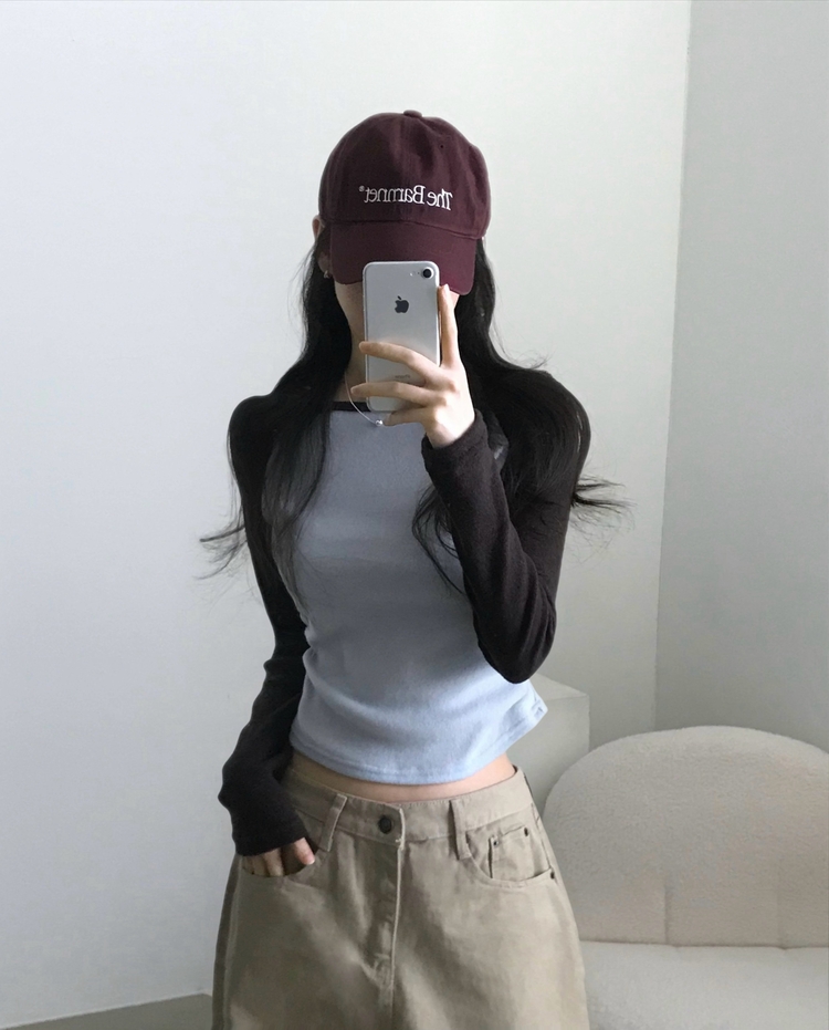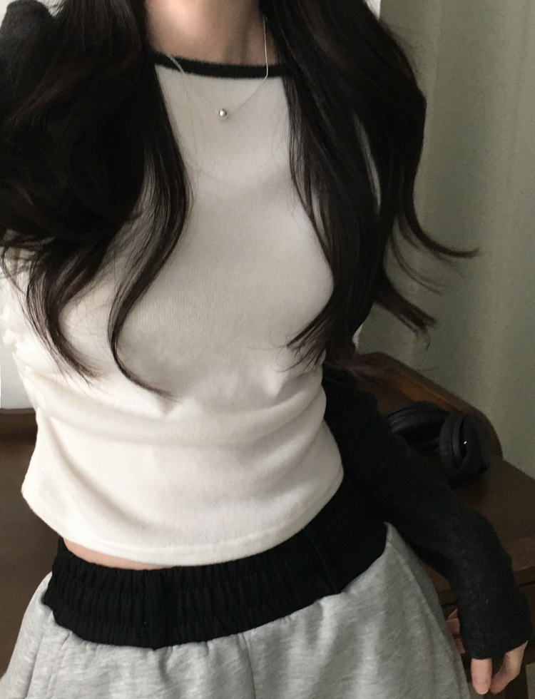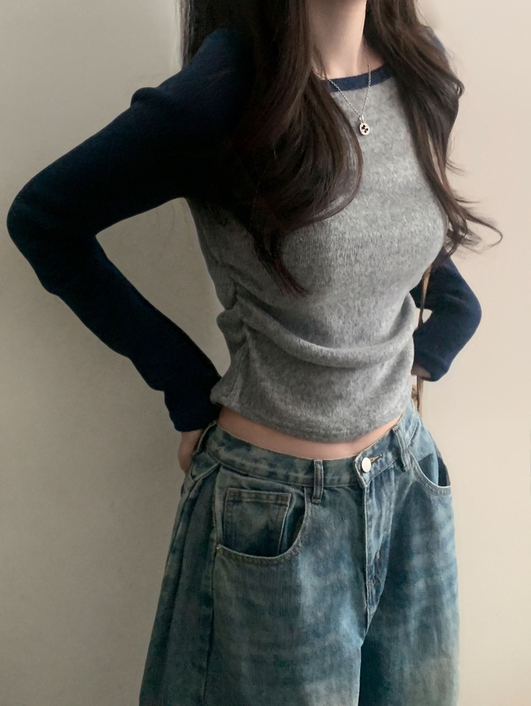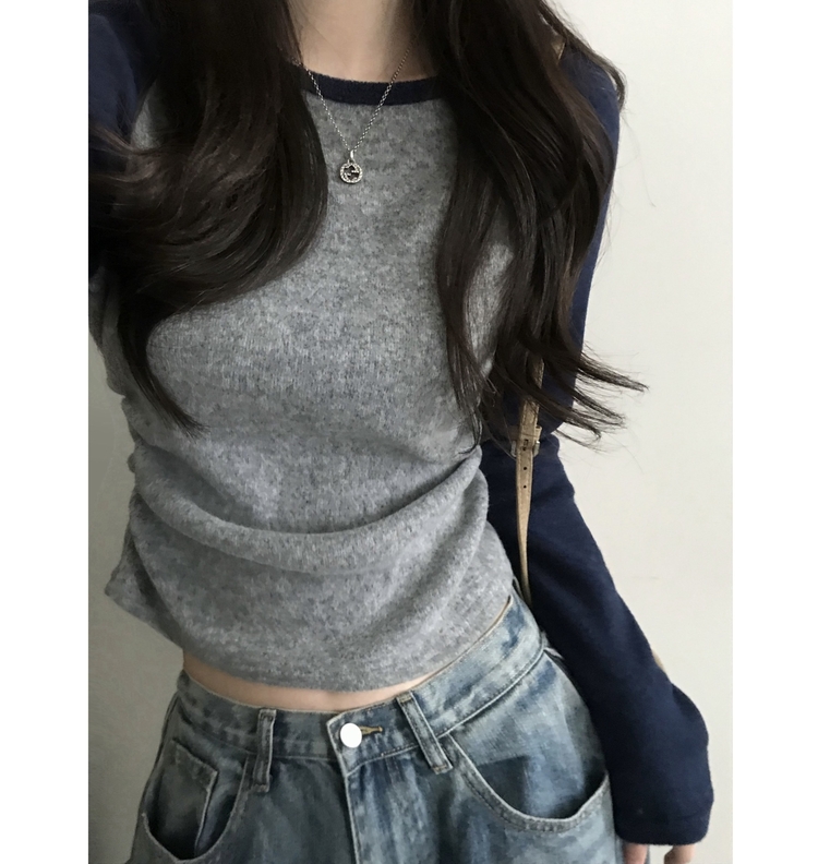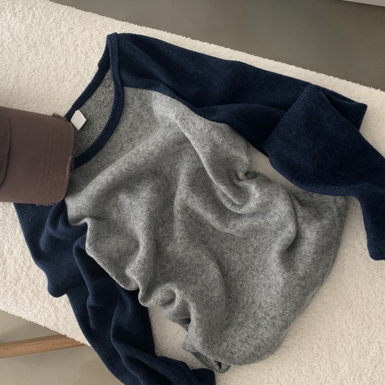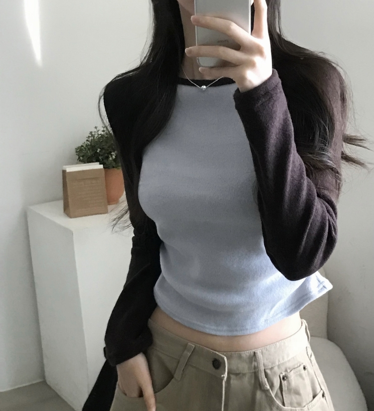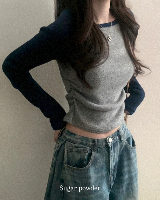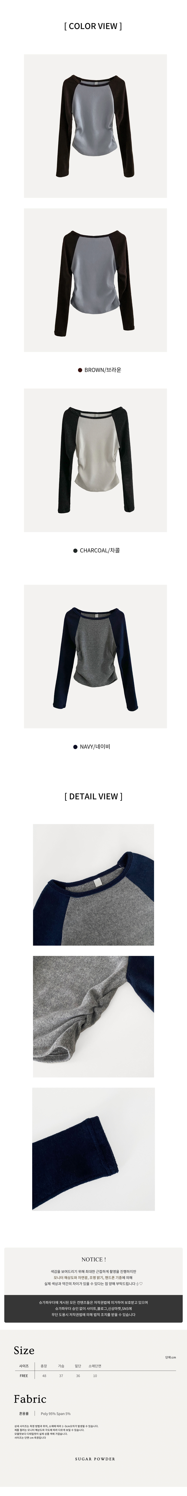 SNT34978 로멘 기모배색 레글런 셔링 크롭 긴팔니트 티셔츠