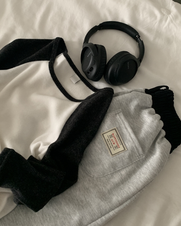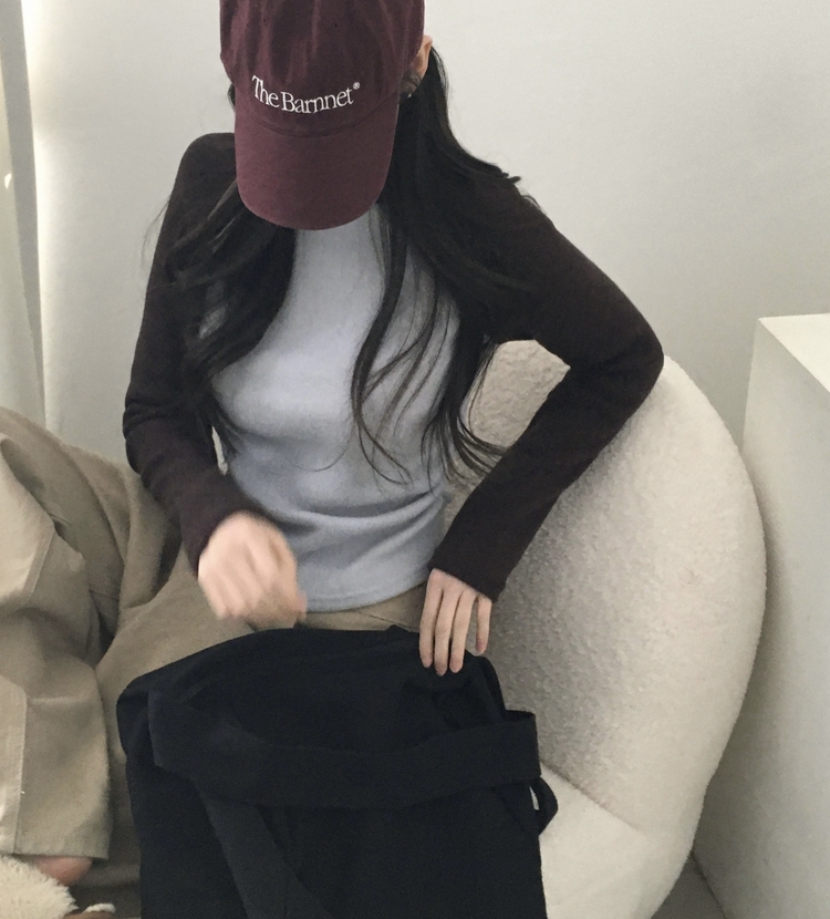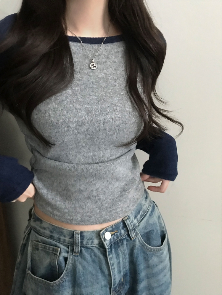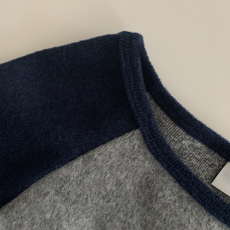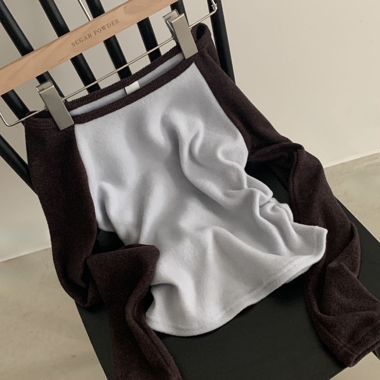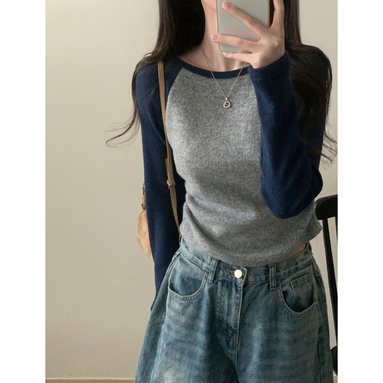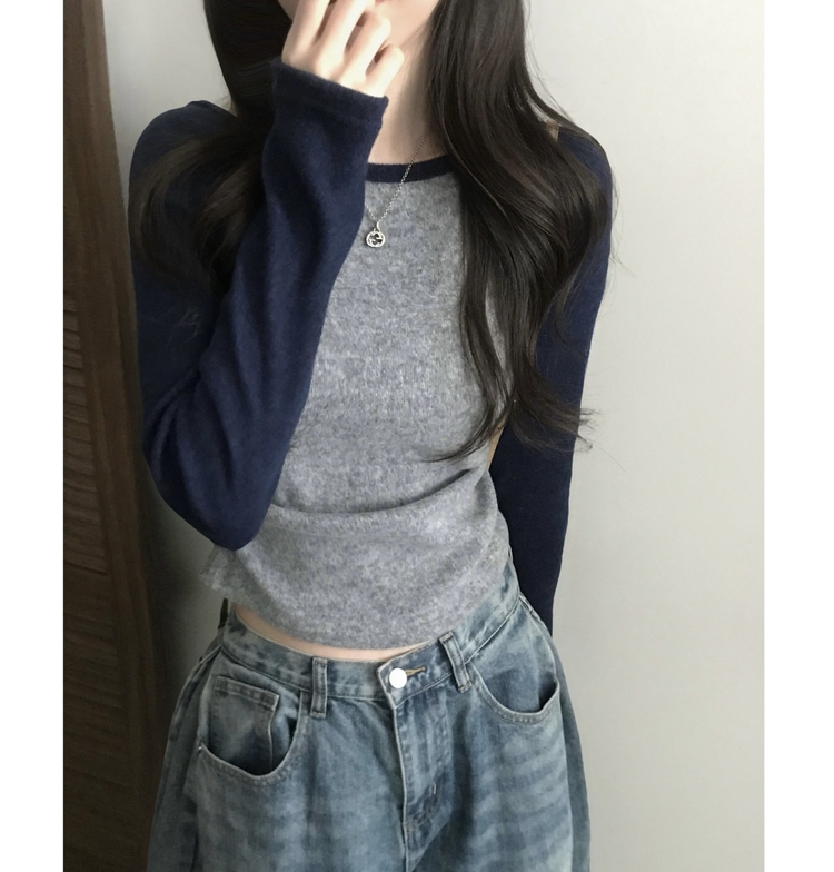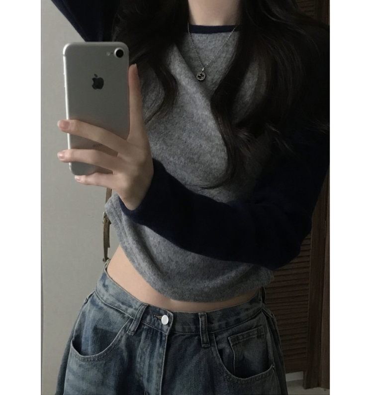 SNT34978 로멘 기모배색 레글런 셔링 크롭 긴팔니트 티셔츠