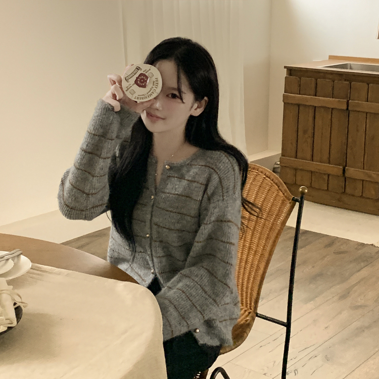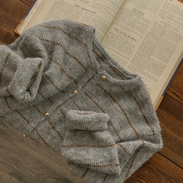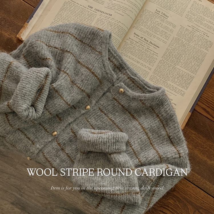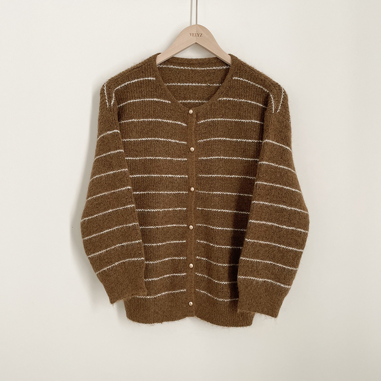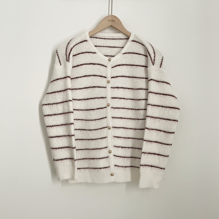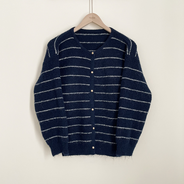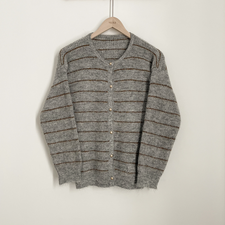 SGD30666 모헤어 배색 스트라이프 단가라 라운드넥 골드 콩단추 아방핏 니트가디건