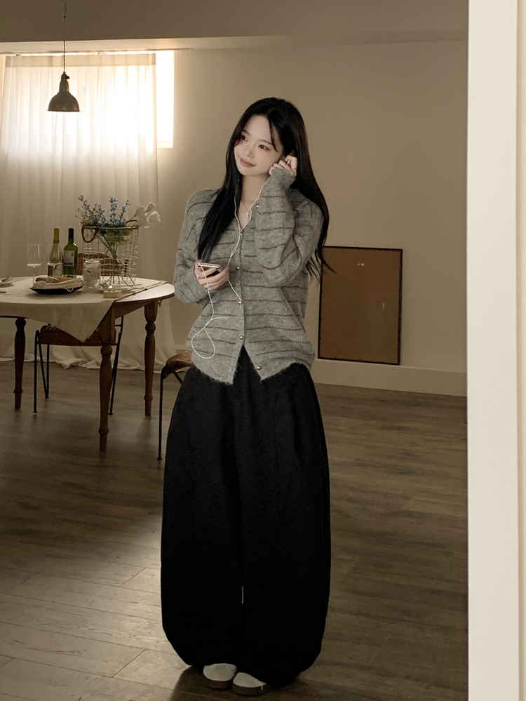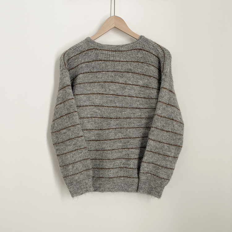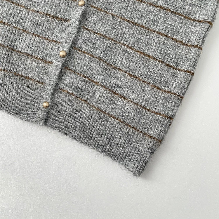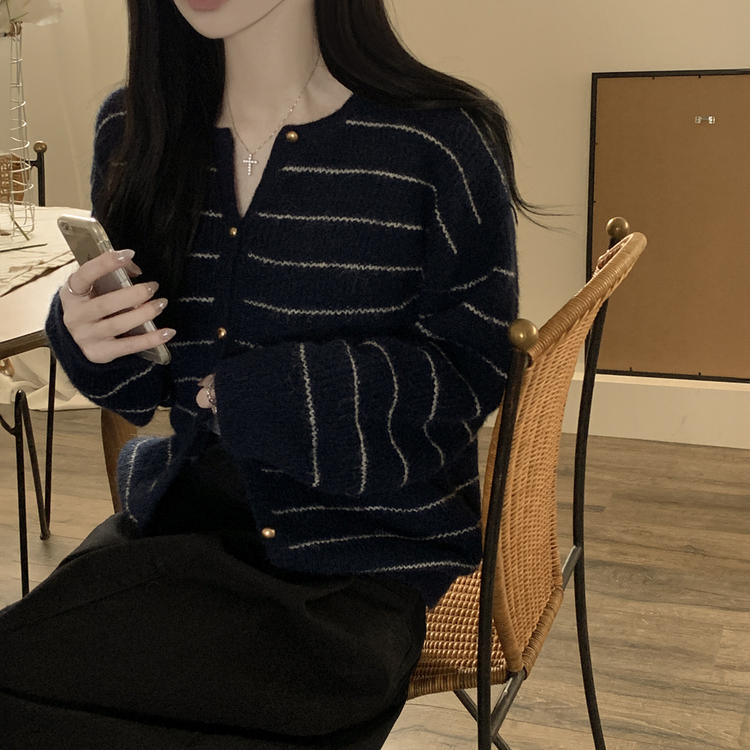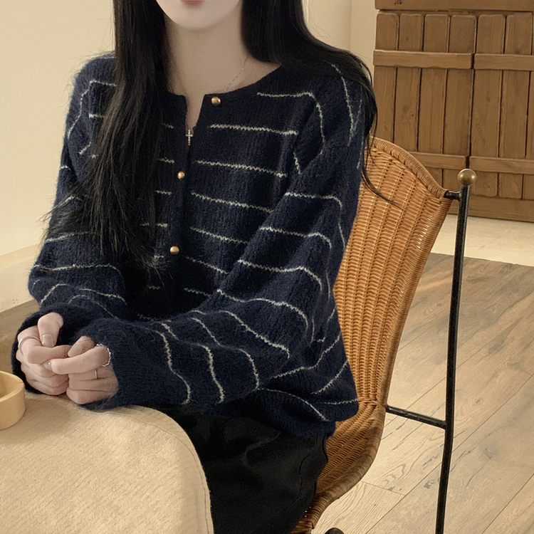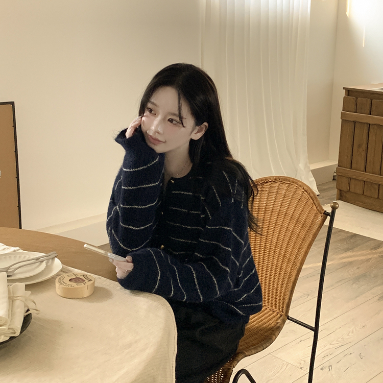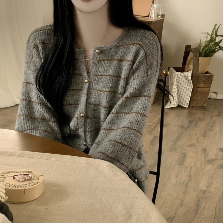 SGD30666 모헤어 배색 스트라이프 단가라 라운드넥 골드 콩단추 아방핏 니트가디건