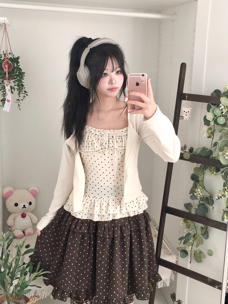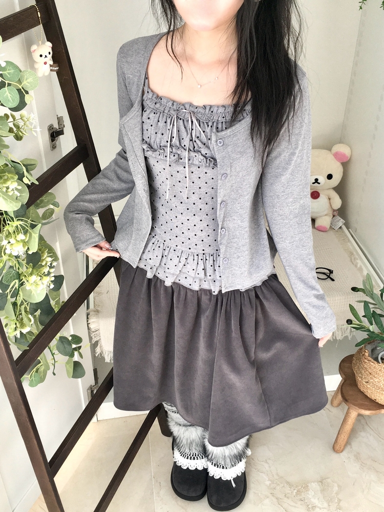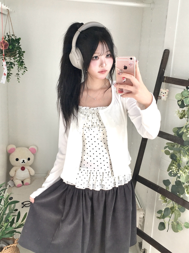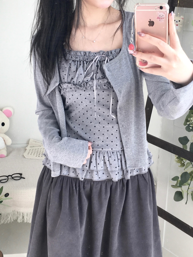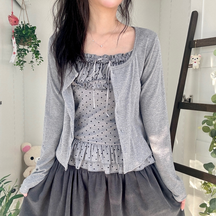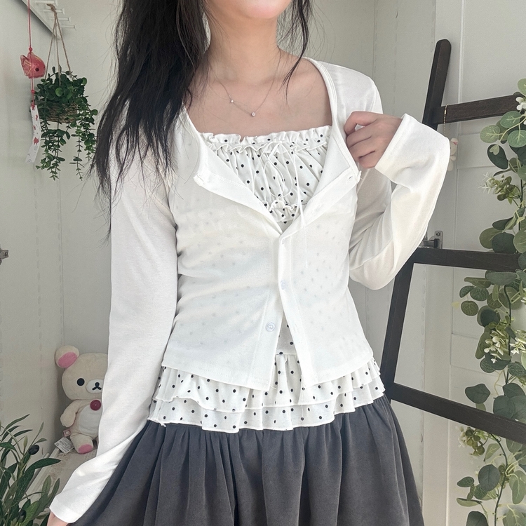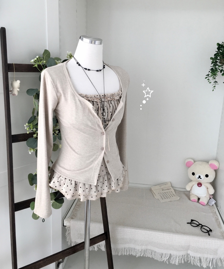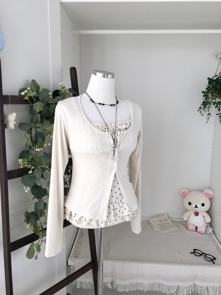 SGD30731 끈조절 빈티지 여리핏 프릴 캉캉 리본 도트 레이어드 나시 가디건 세트