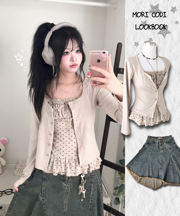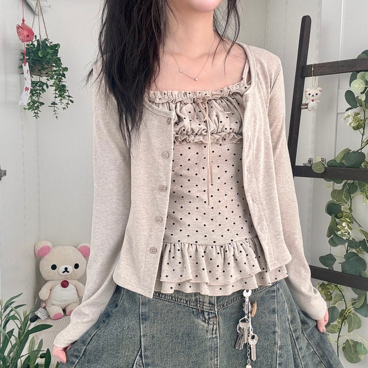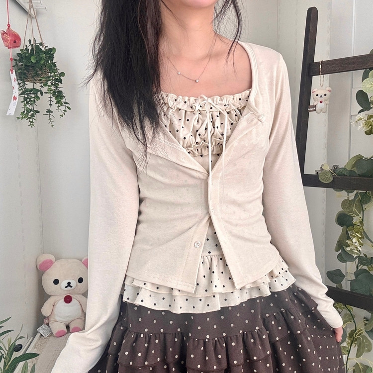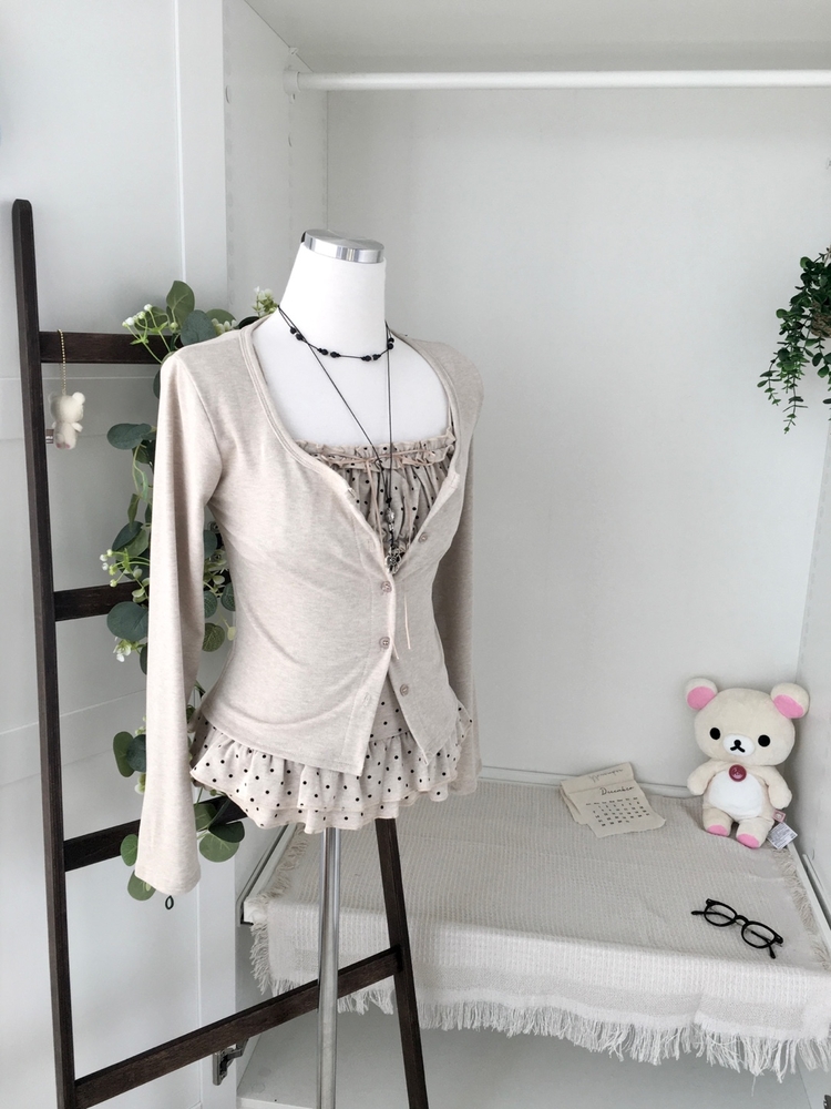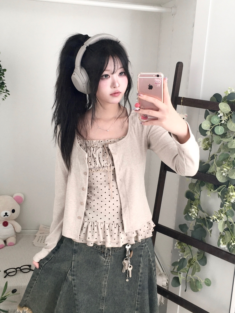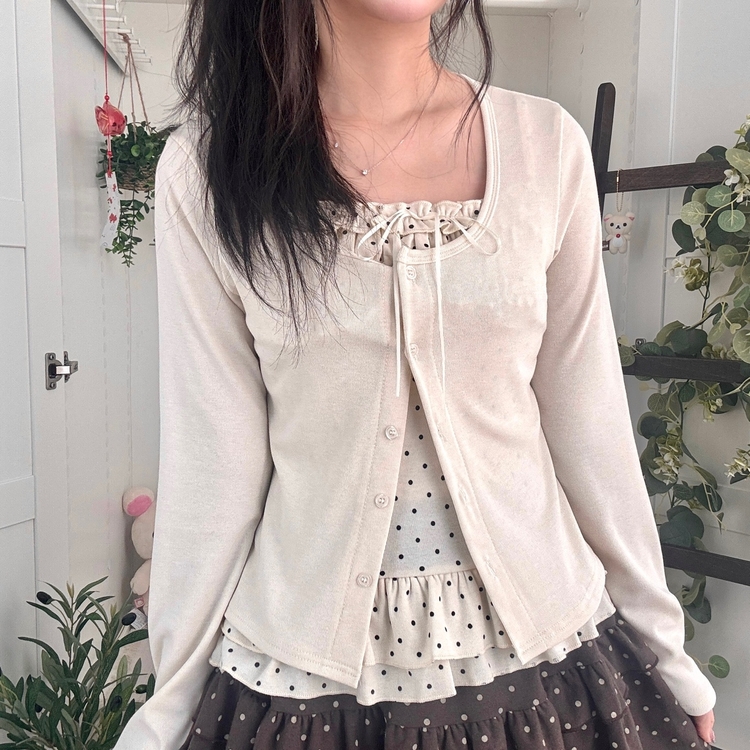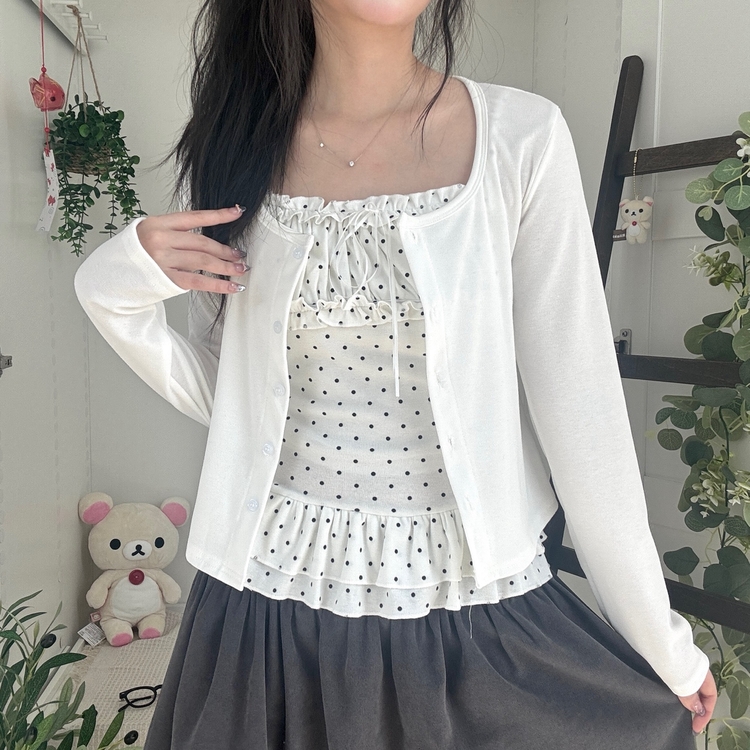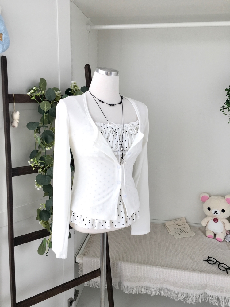 SGD30731 끈조절 빈티지 여리핏 프릴 캉캉 리본 도트 레이어드 나시 가디건 세트
