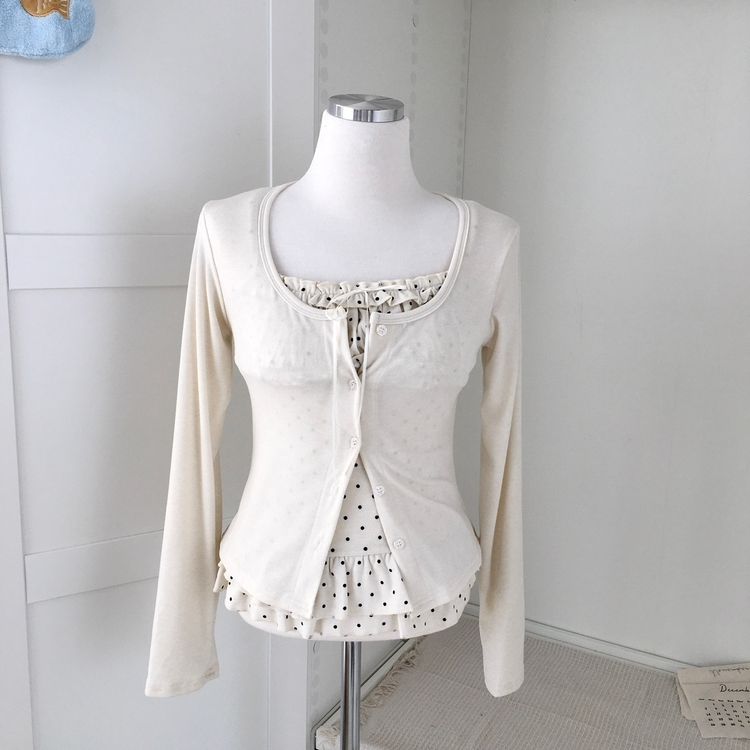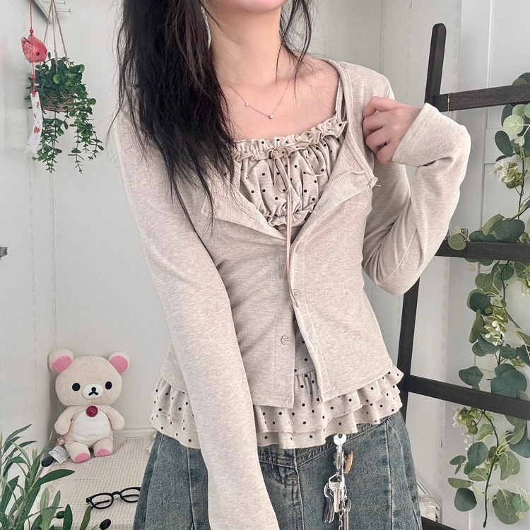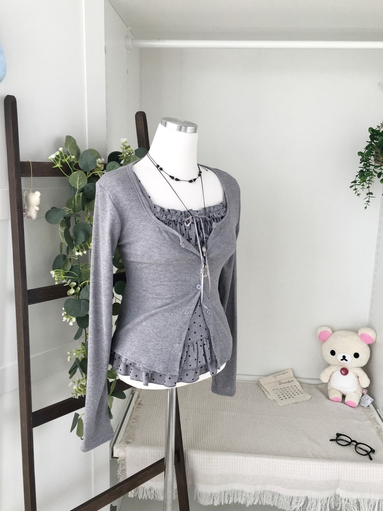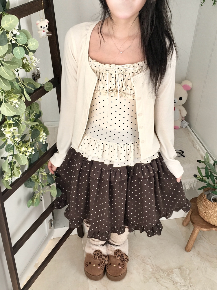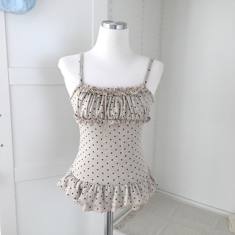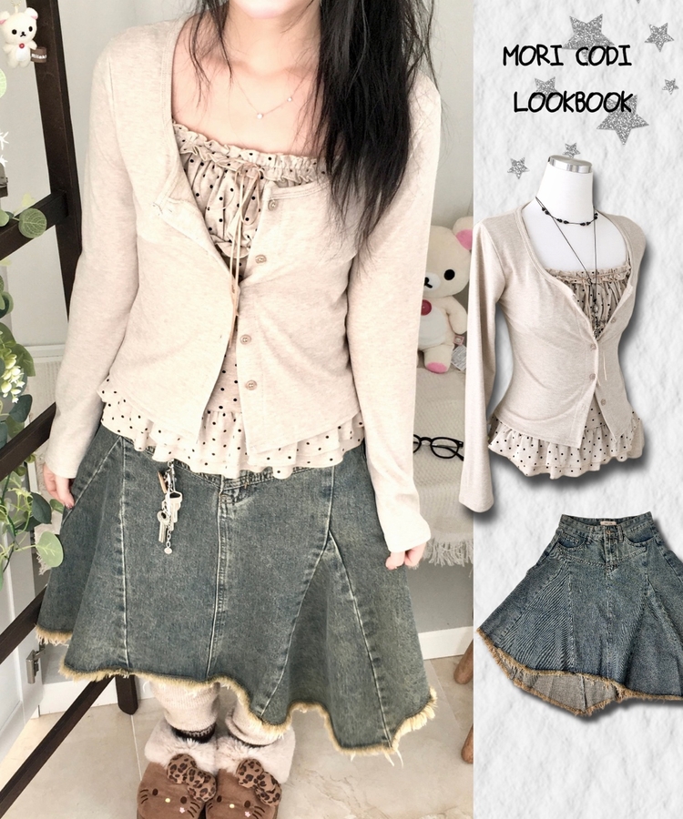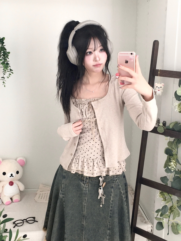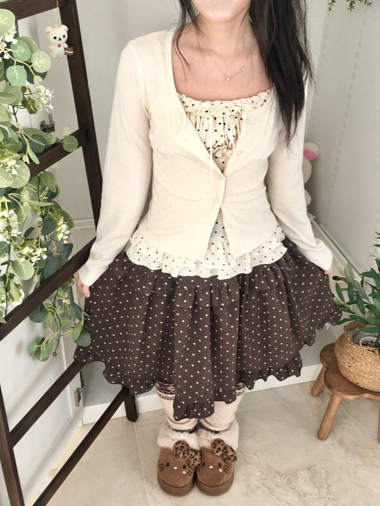 SGD30731 끈조절 빈티지 여리핏 프릴 캉캉 리본 도트 레이어드 나시 가디건 세트