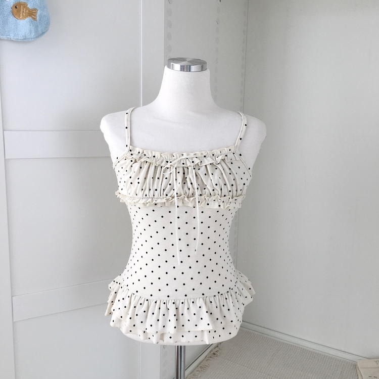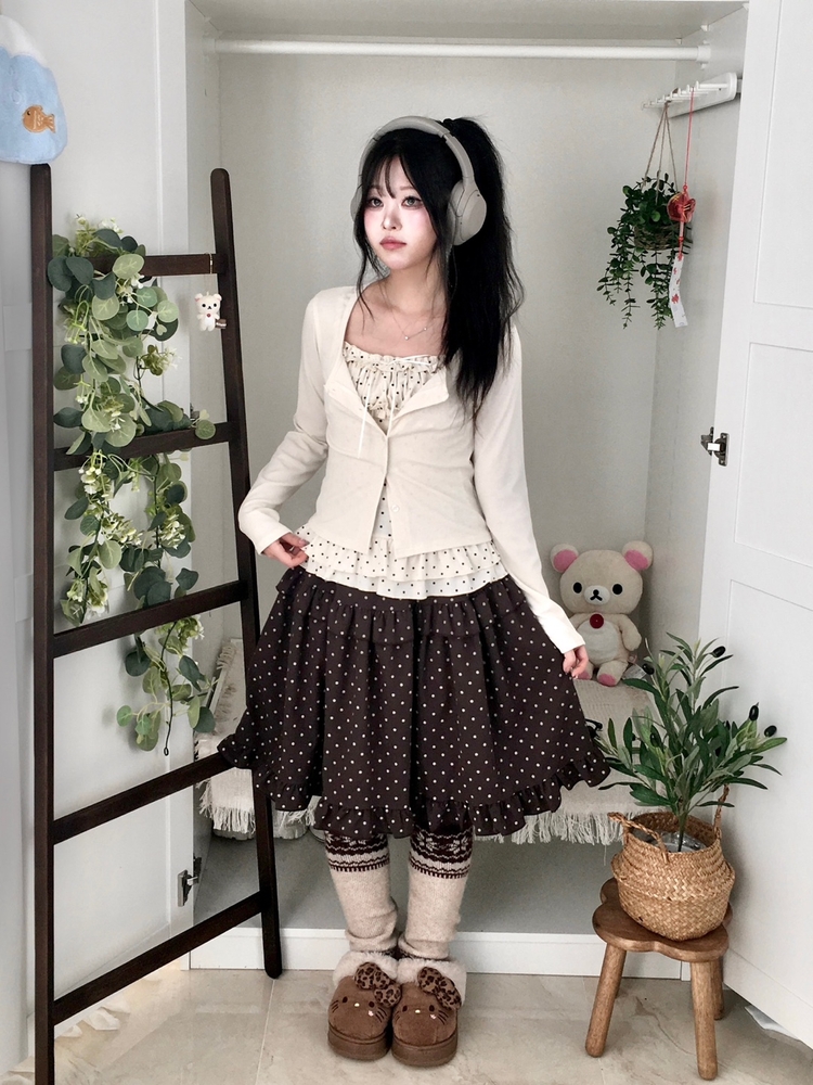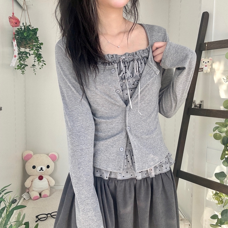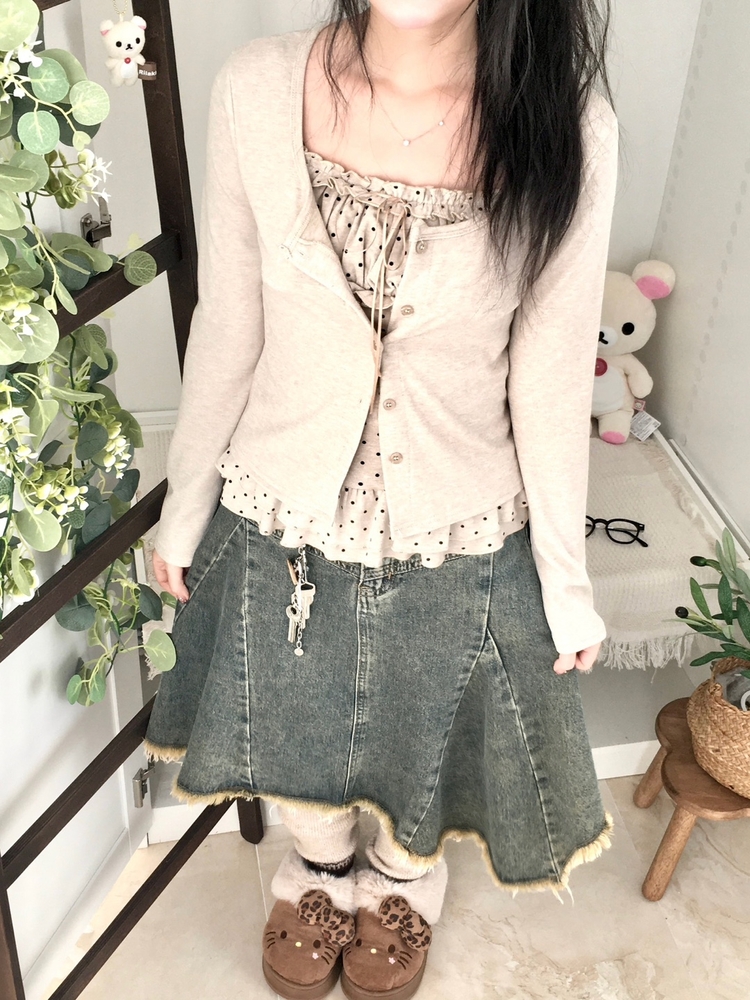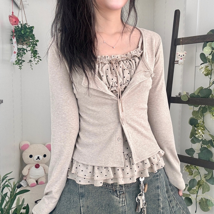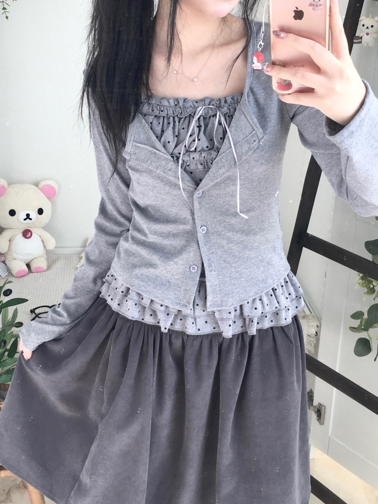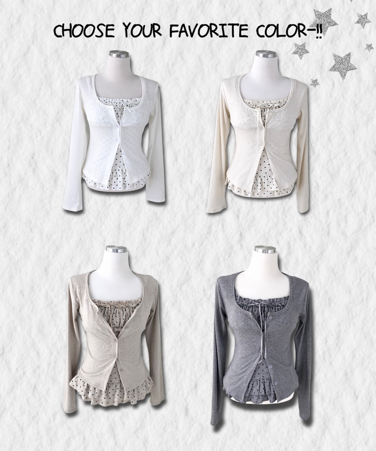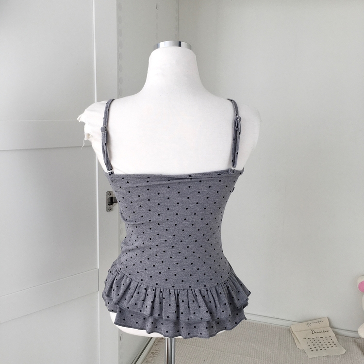 SGD30731 끈조절 빈티지 여리핏 프릴 캉캉 리본 도트 레이어드 나시 가디건 세트