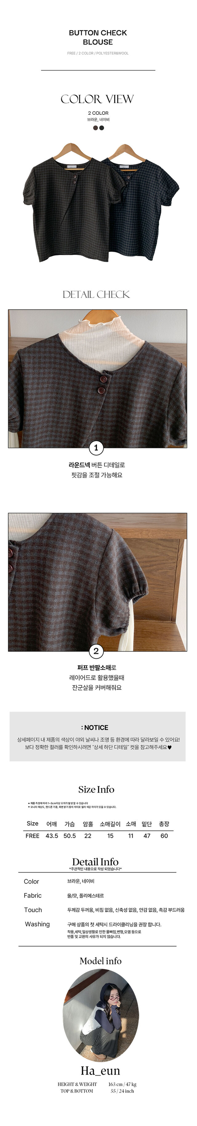 SBS30491 아멜 울 체크 버튼 모직 반팔 블라우스