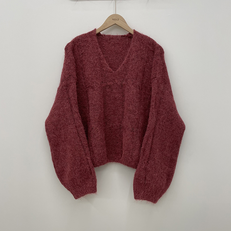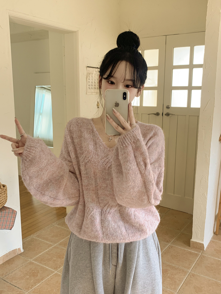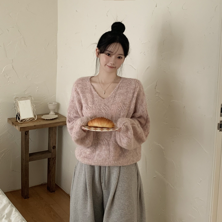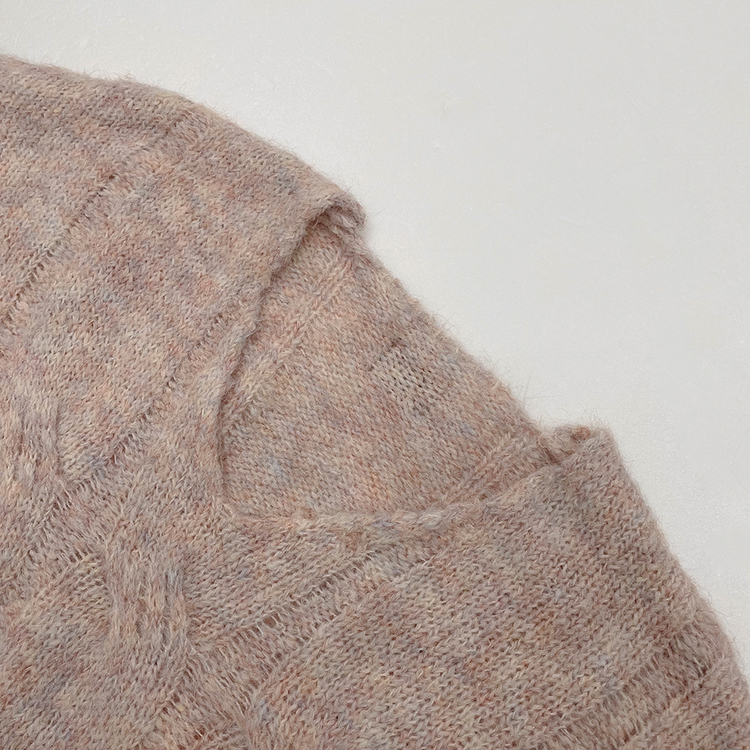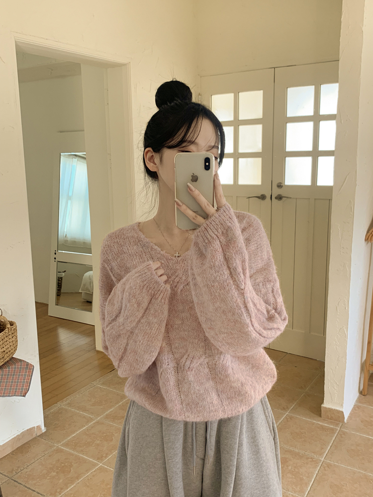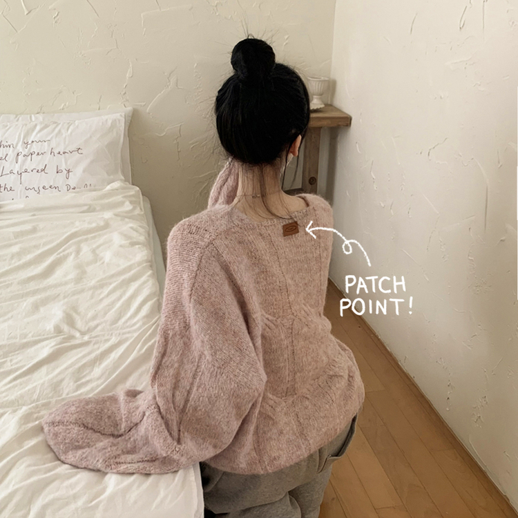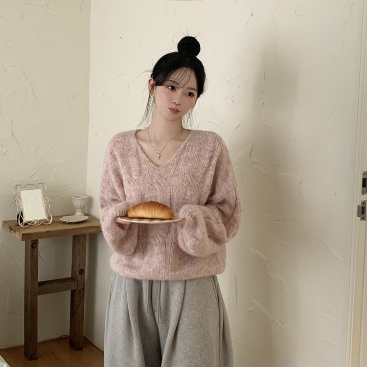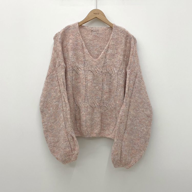 SNT35224 패치포인트 울 모헤어 보카시 브이넥 아방핏 꽈배기 울니트 무지개실 핑크니트
