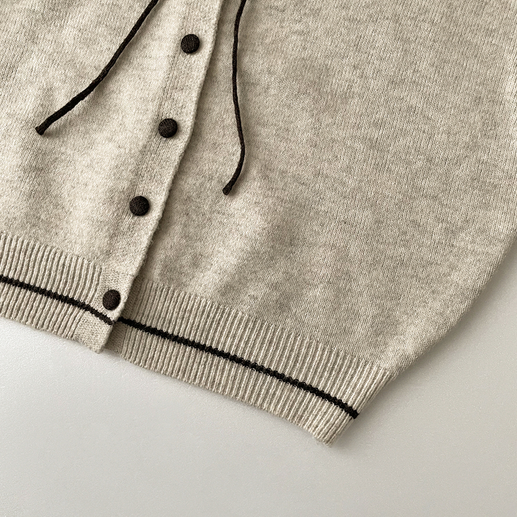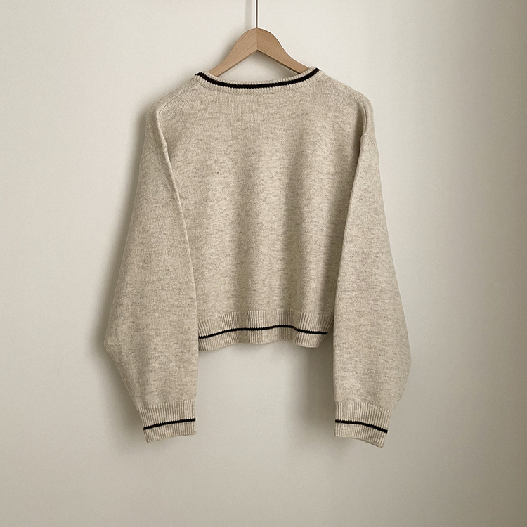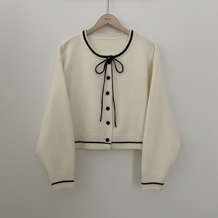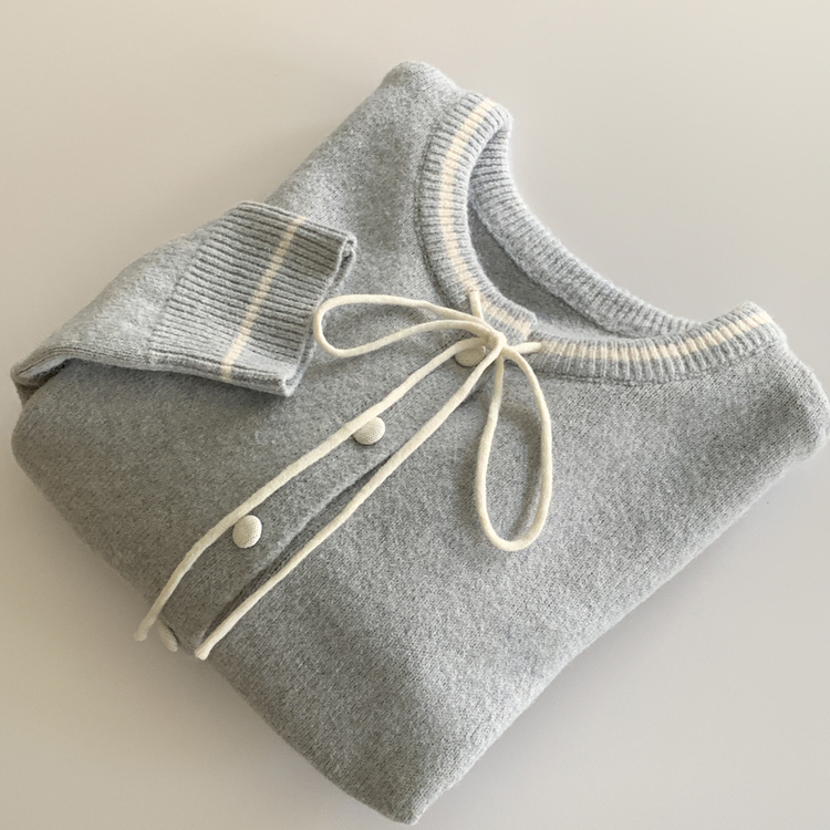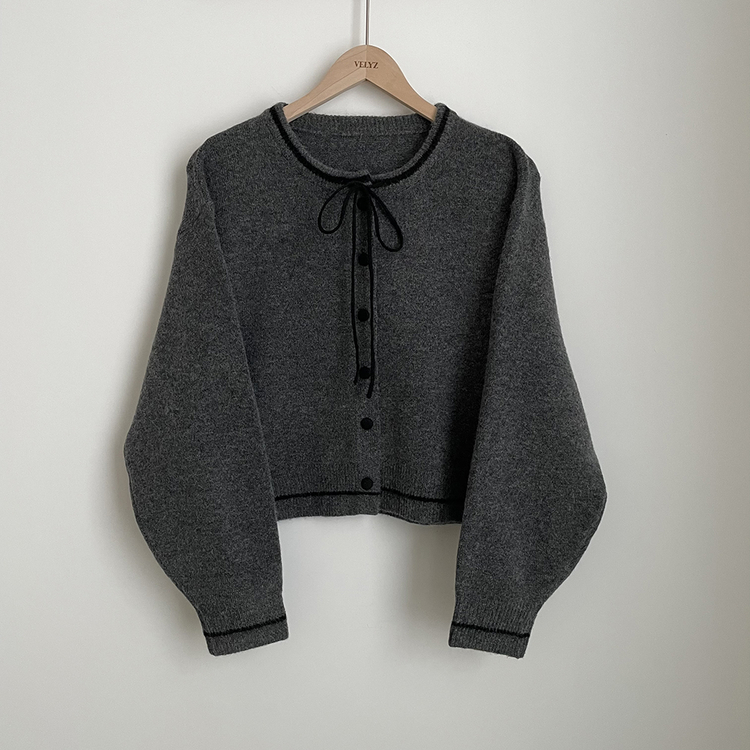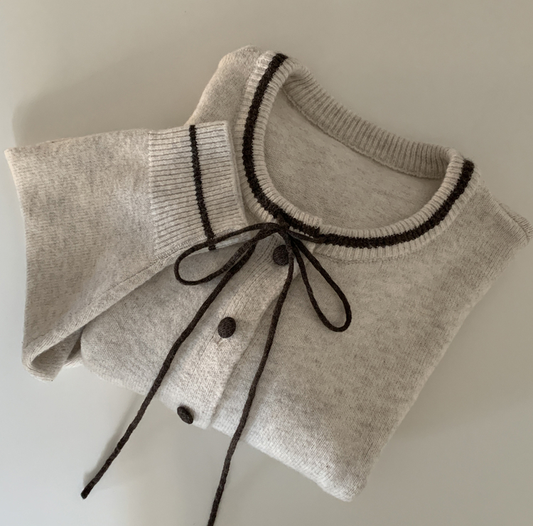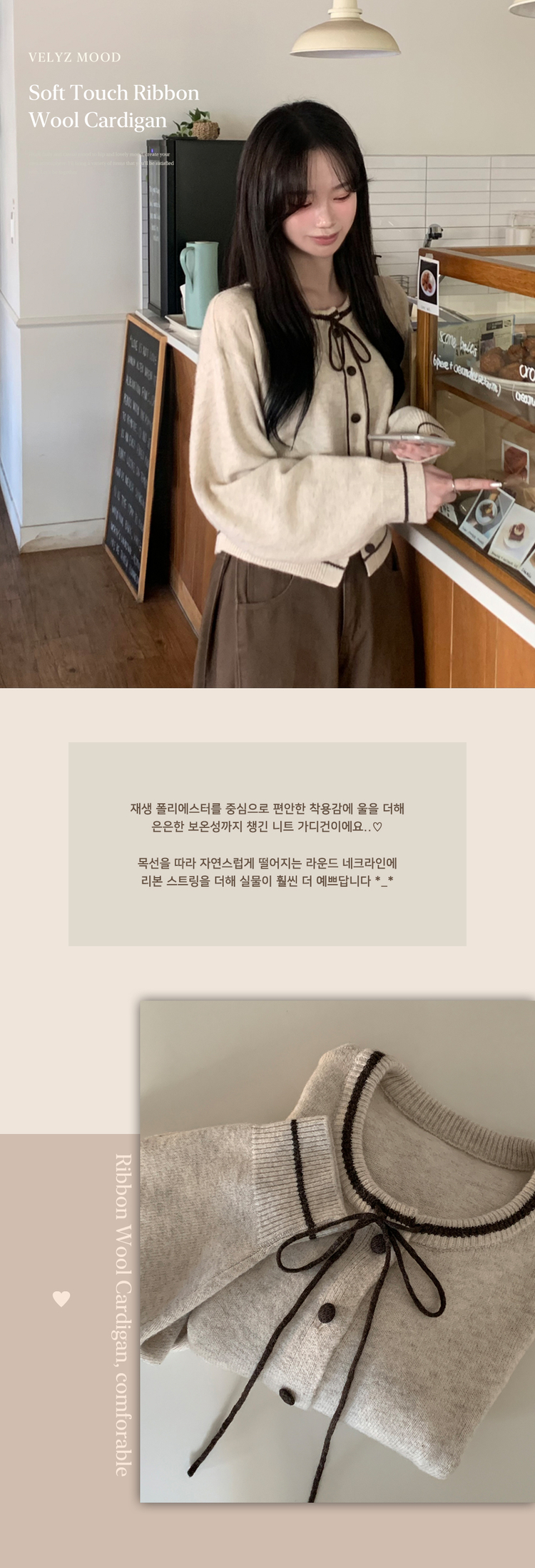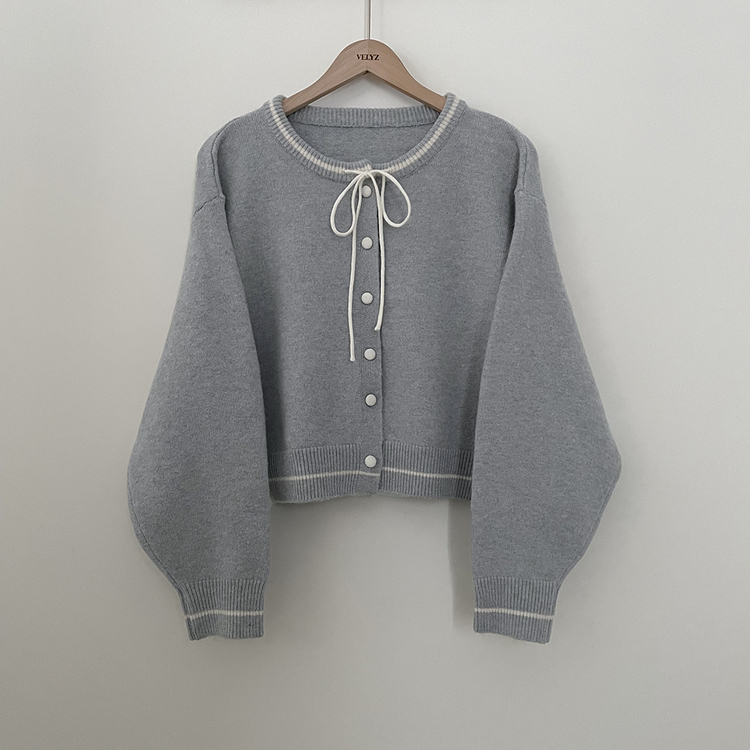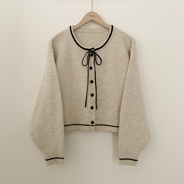 SGD30800 리본포인트 라인 배색 라운드넥 버튼 루즈핏 울 벌룬 니트가디건 봄가디건