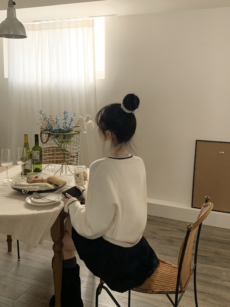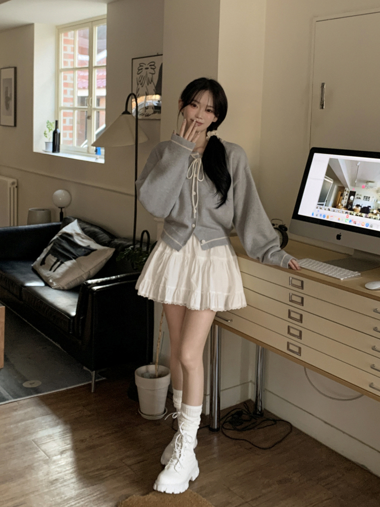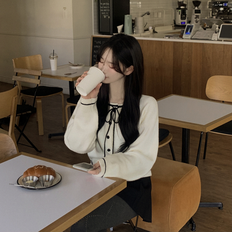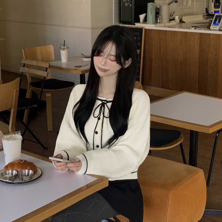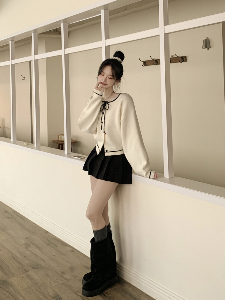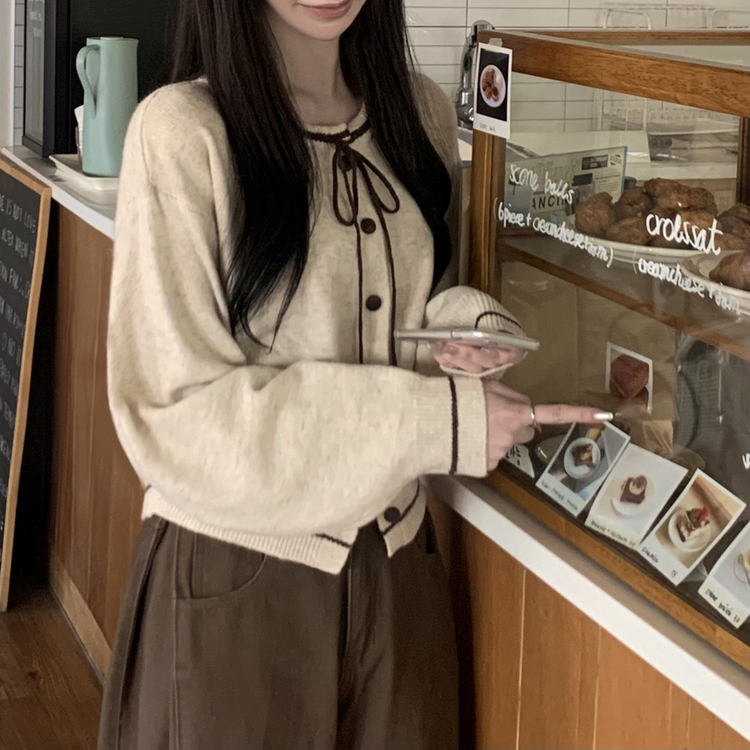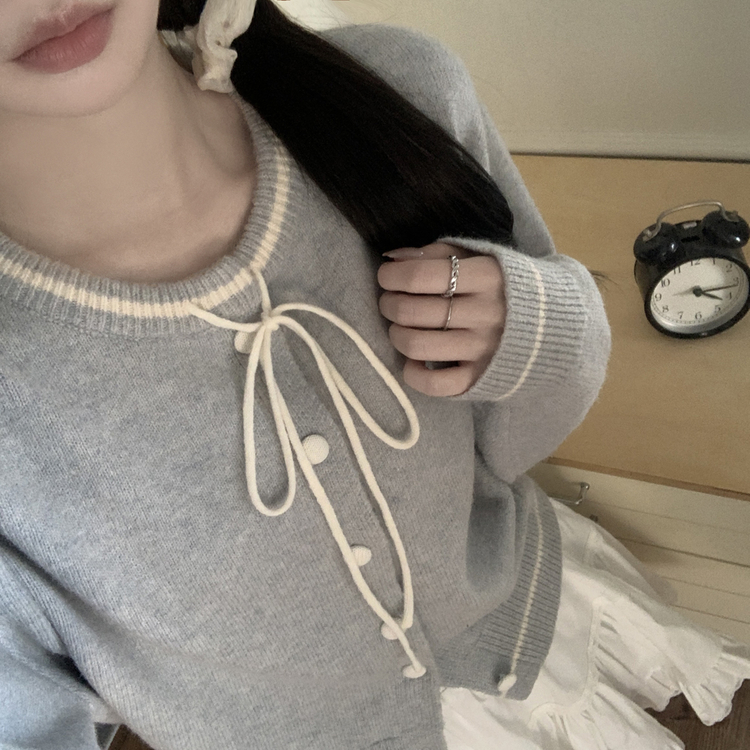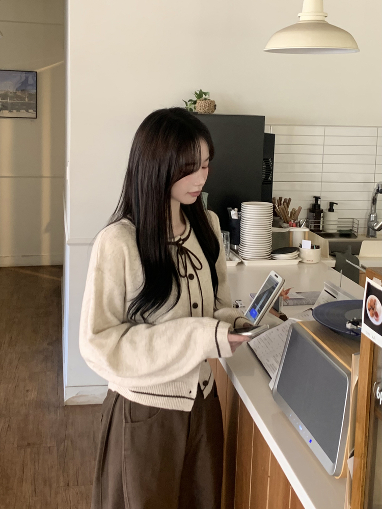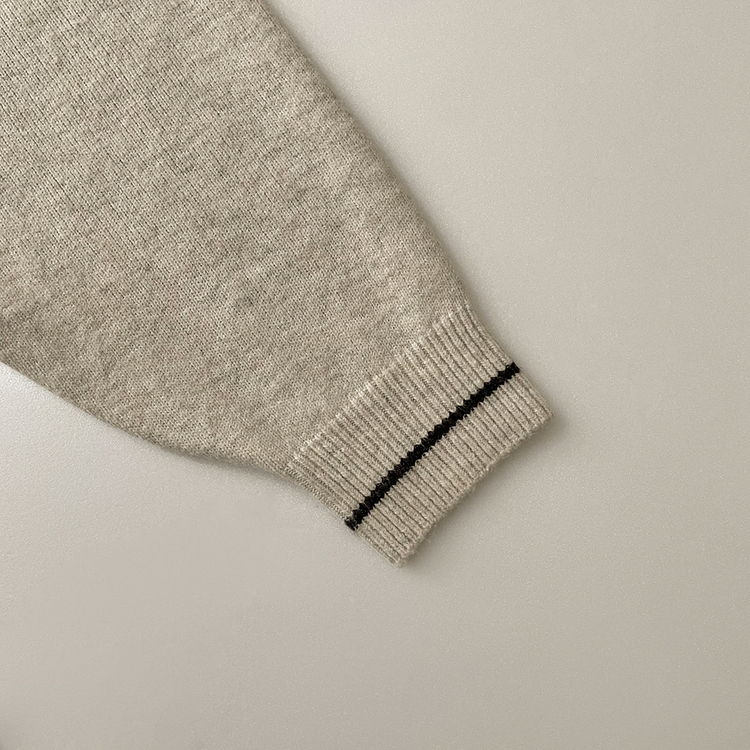 SGD30800 리본포인트 라인 배색 라운드넥 버튼 루즈핏 울 벌룬 니트가디건 봄가디건