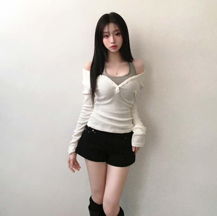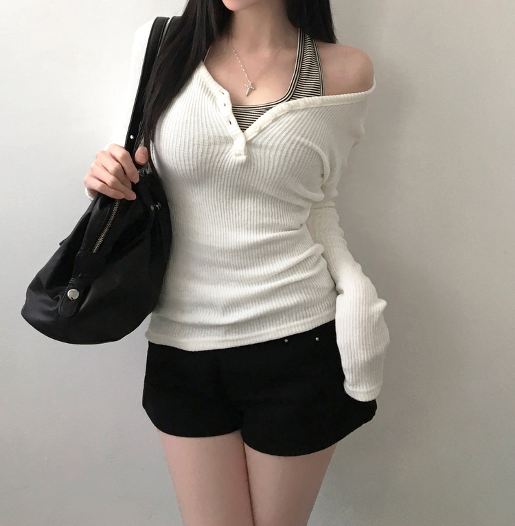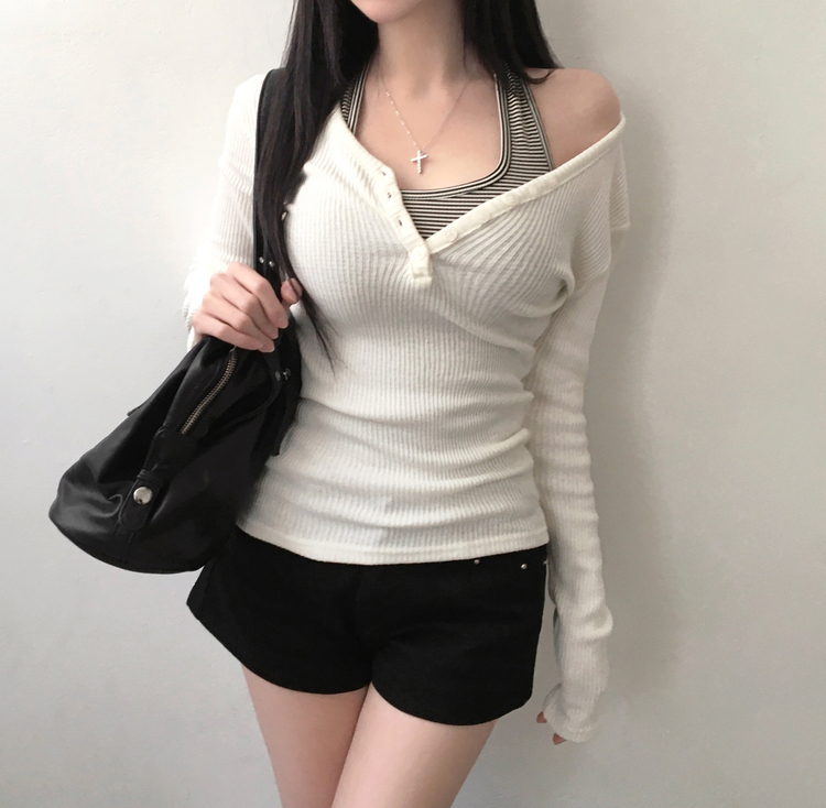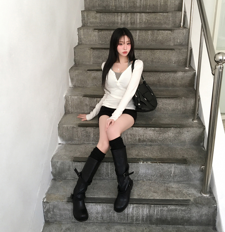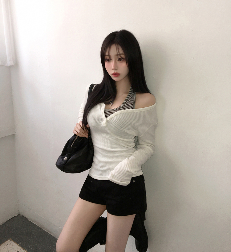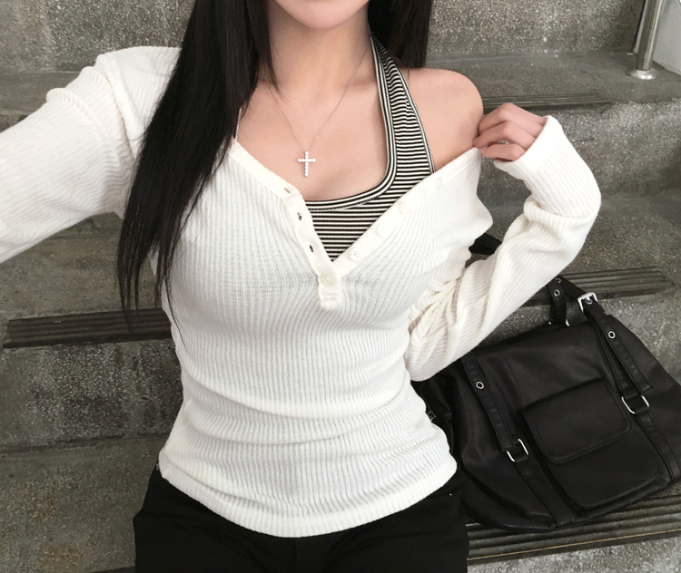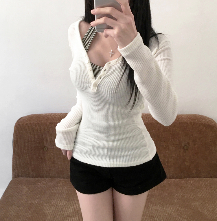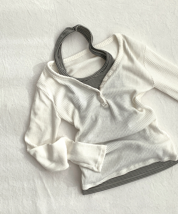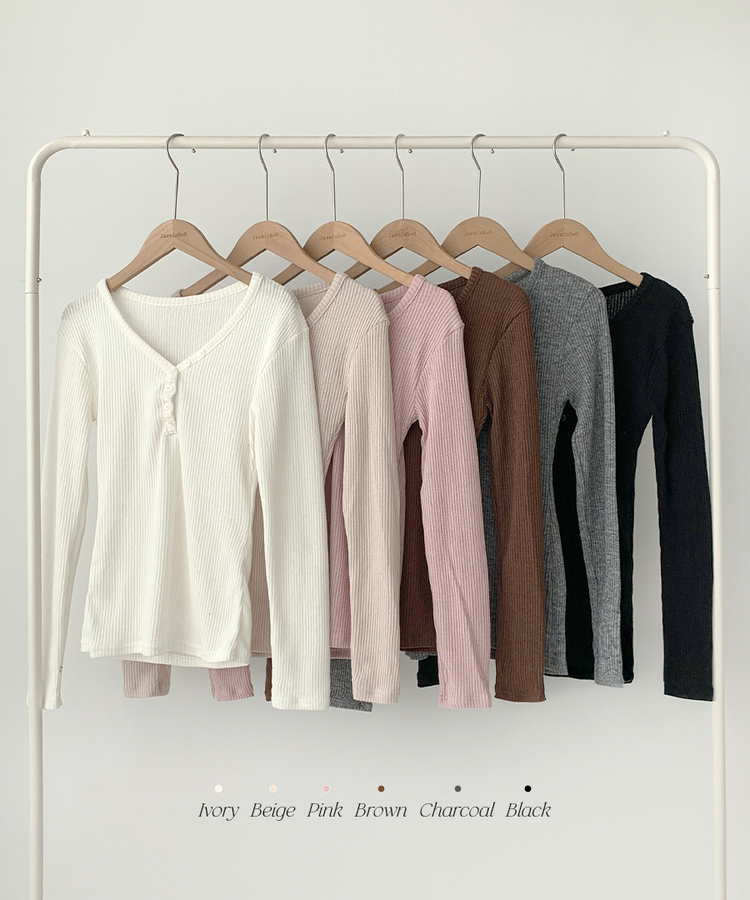 STS75305 루넬 브이넥 단추 여리 골지 니트 긴팔