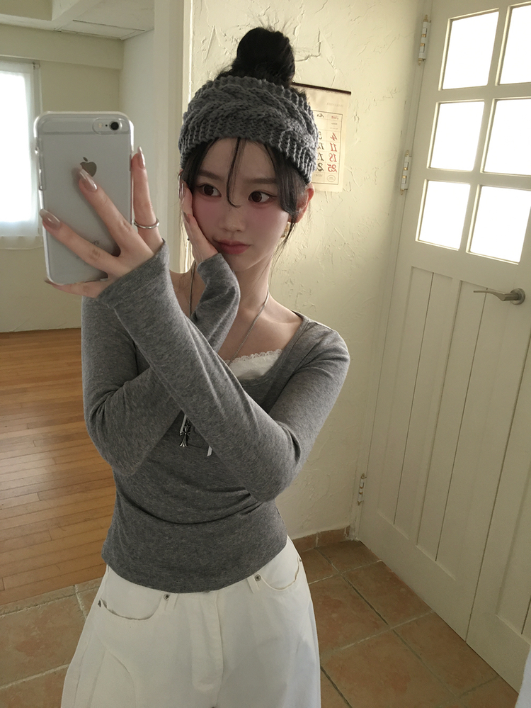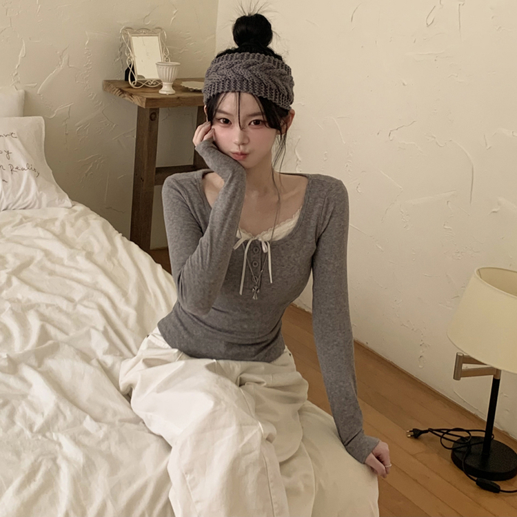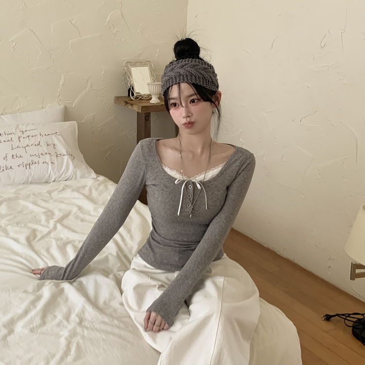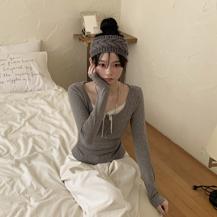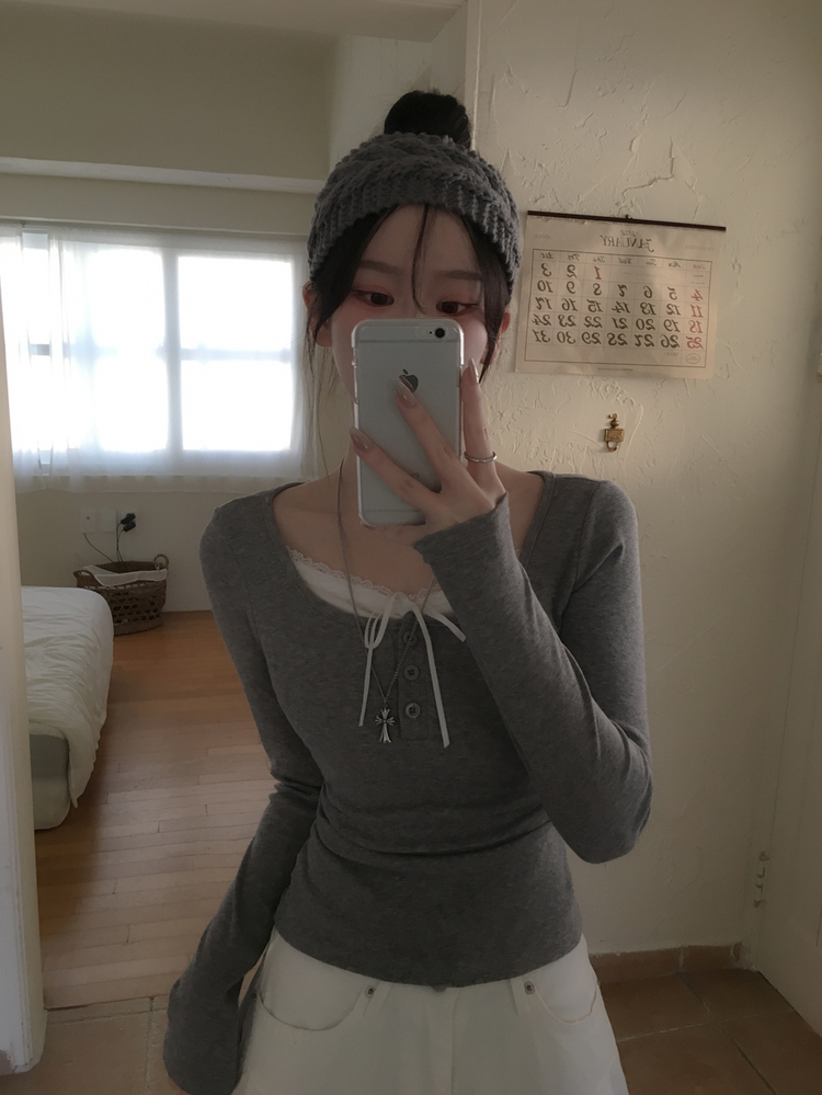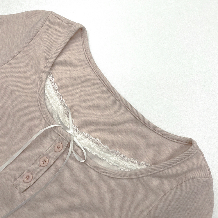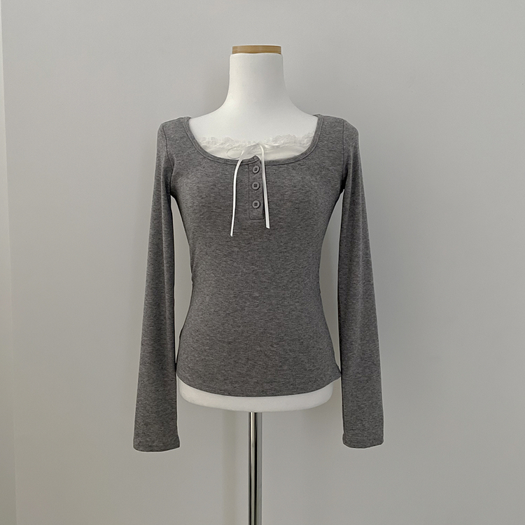 STS75340 레이스 나시 레이어드 허리셔링 슬림핏 단추 버튼 긴팔티셔츠 봄신상 봄옷