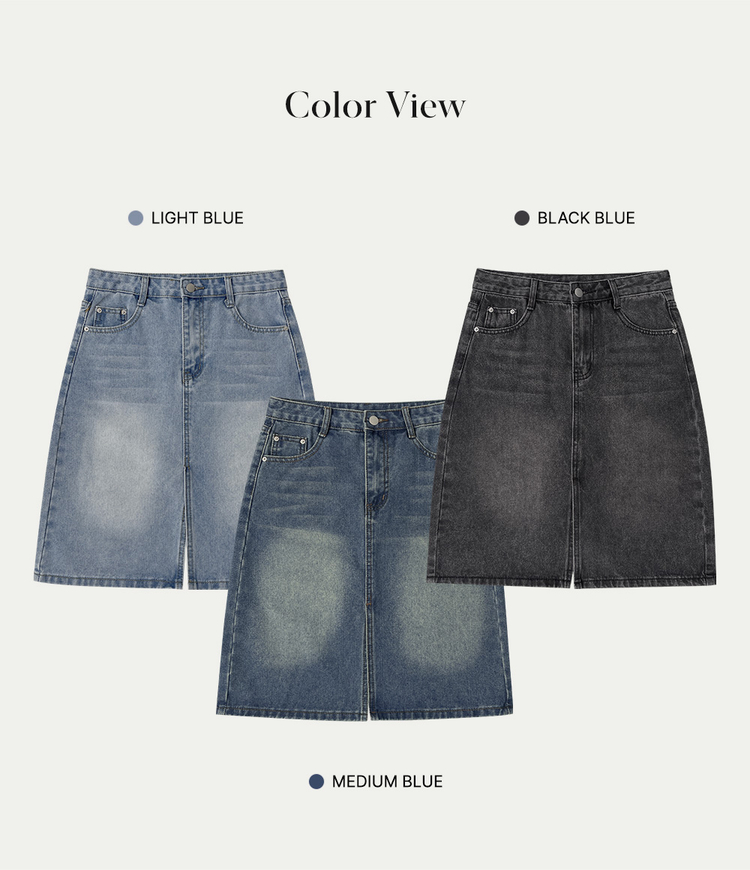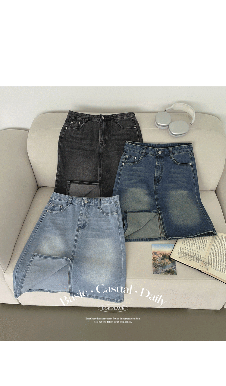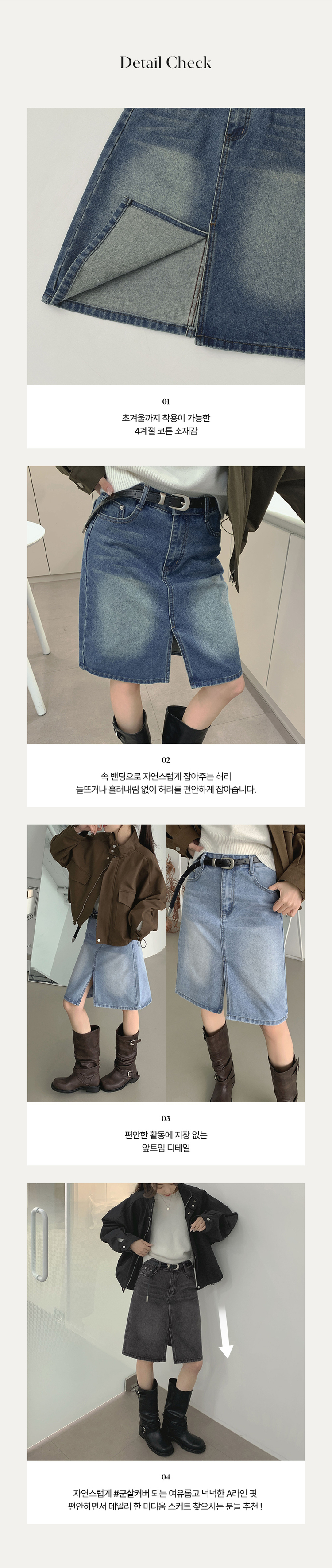 SSK25917 트렌드 데님 미디 기장 트임 A라인 스커트