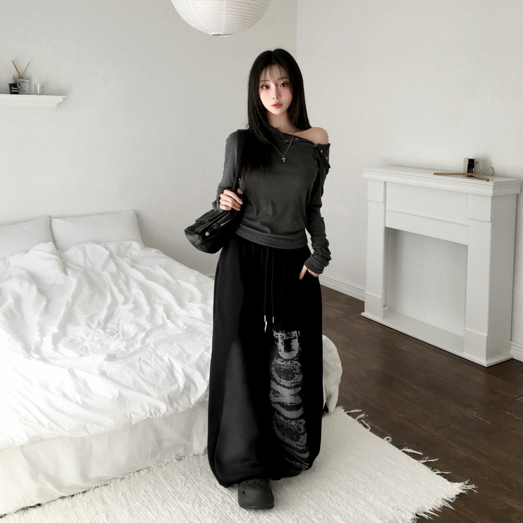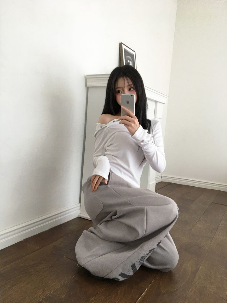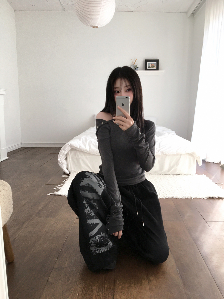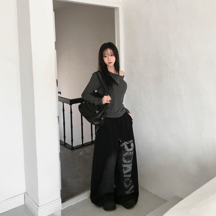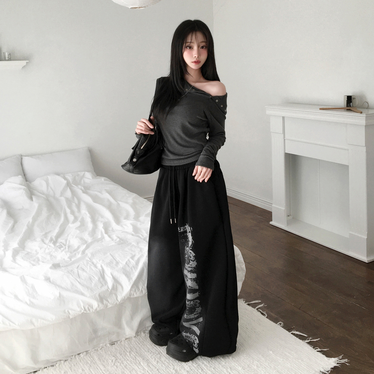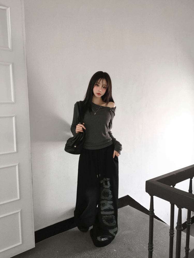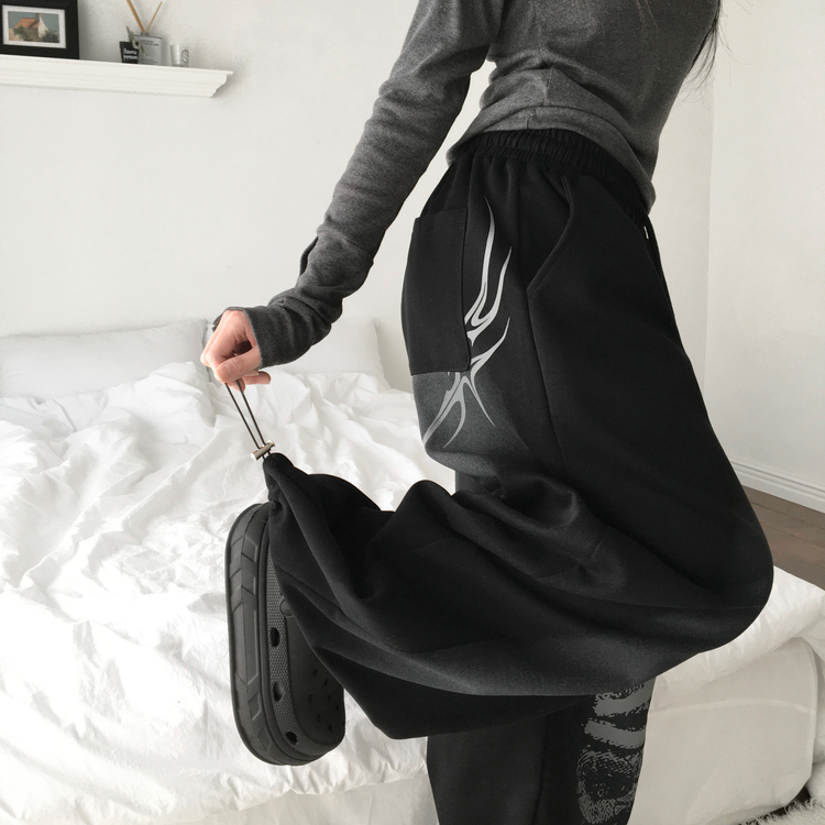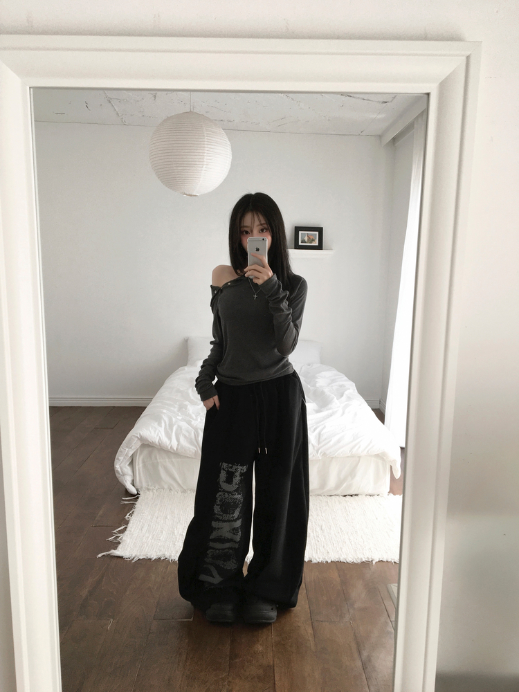SPS38472 페티 브러쉬 워싱 레터링 스트링 와이드 밴딩 트레이닝 팬츠