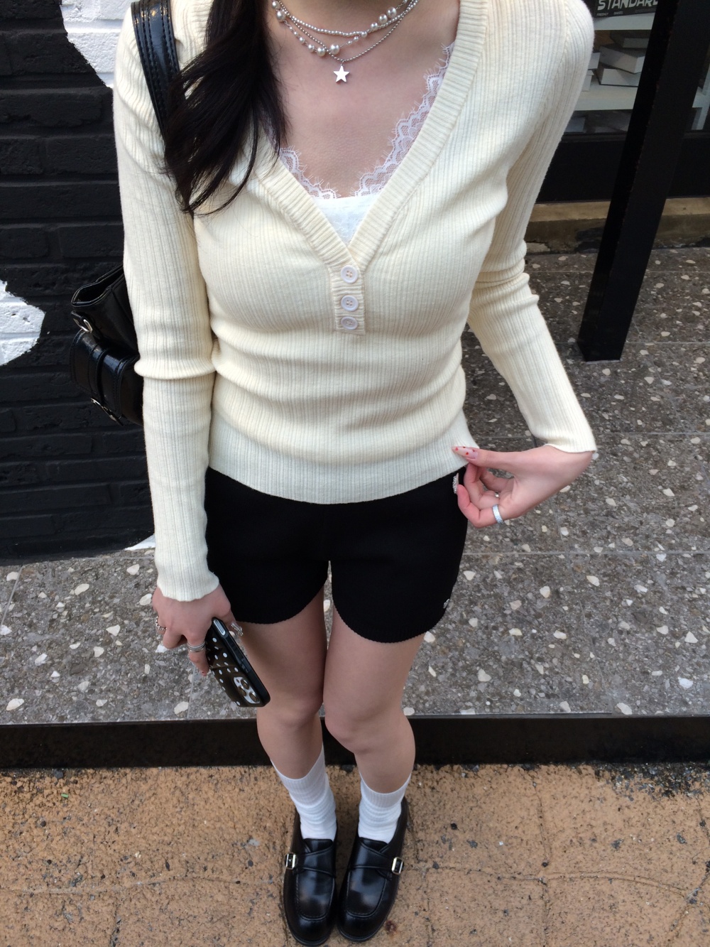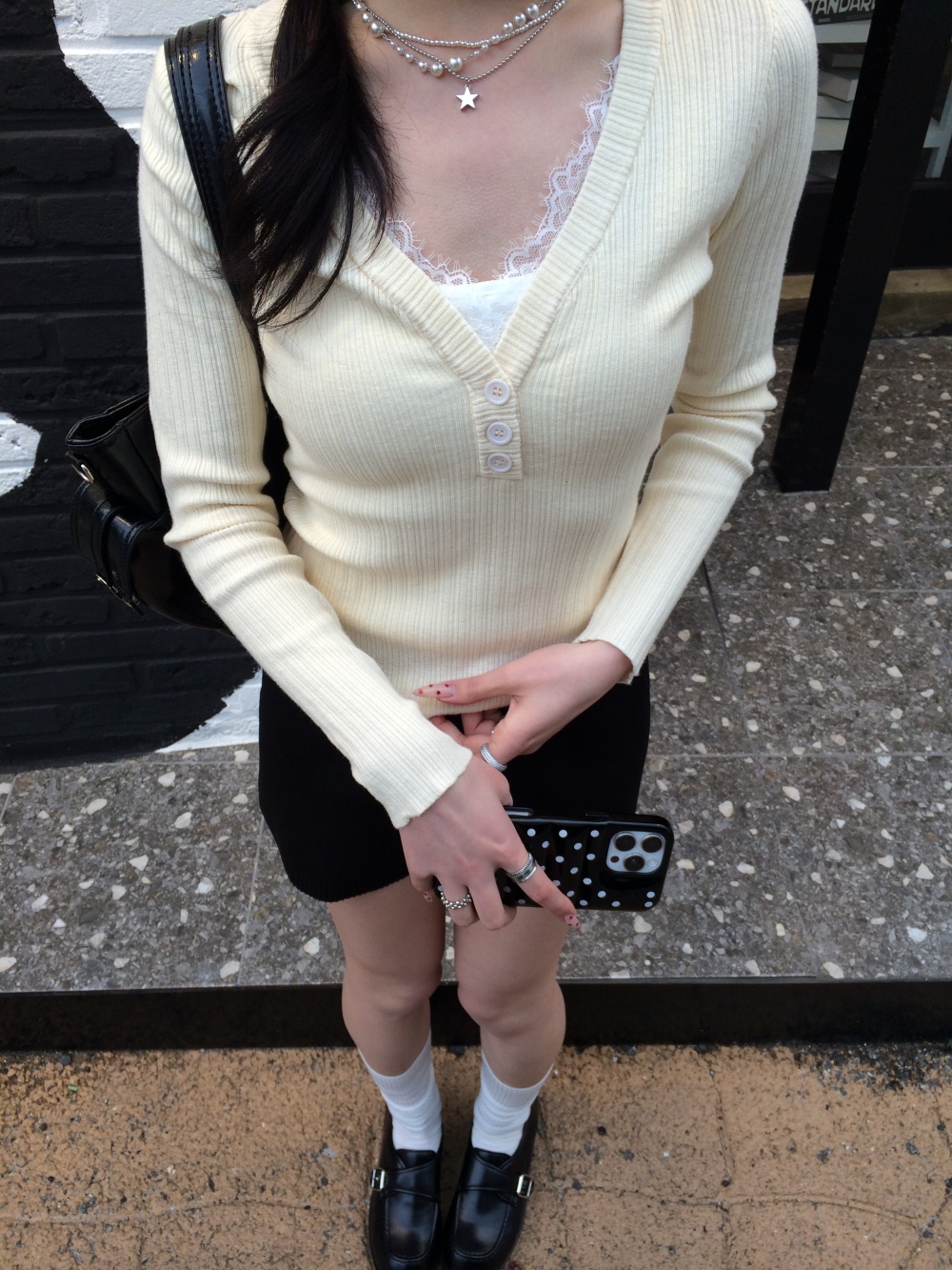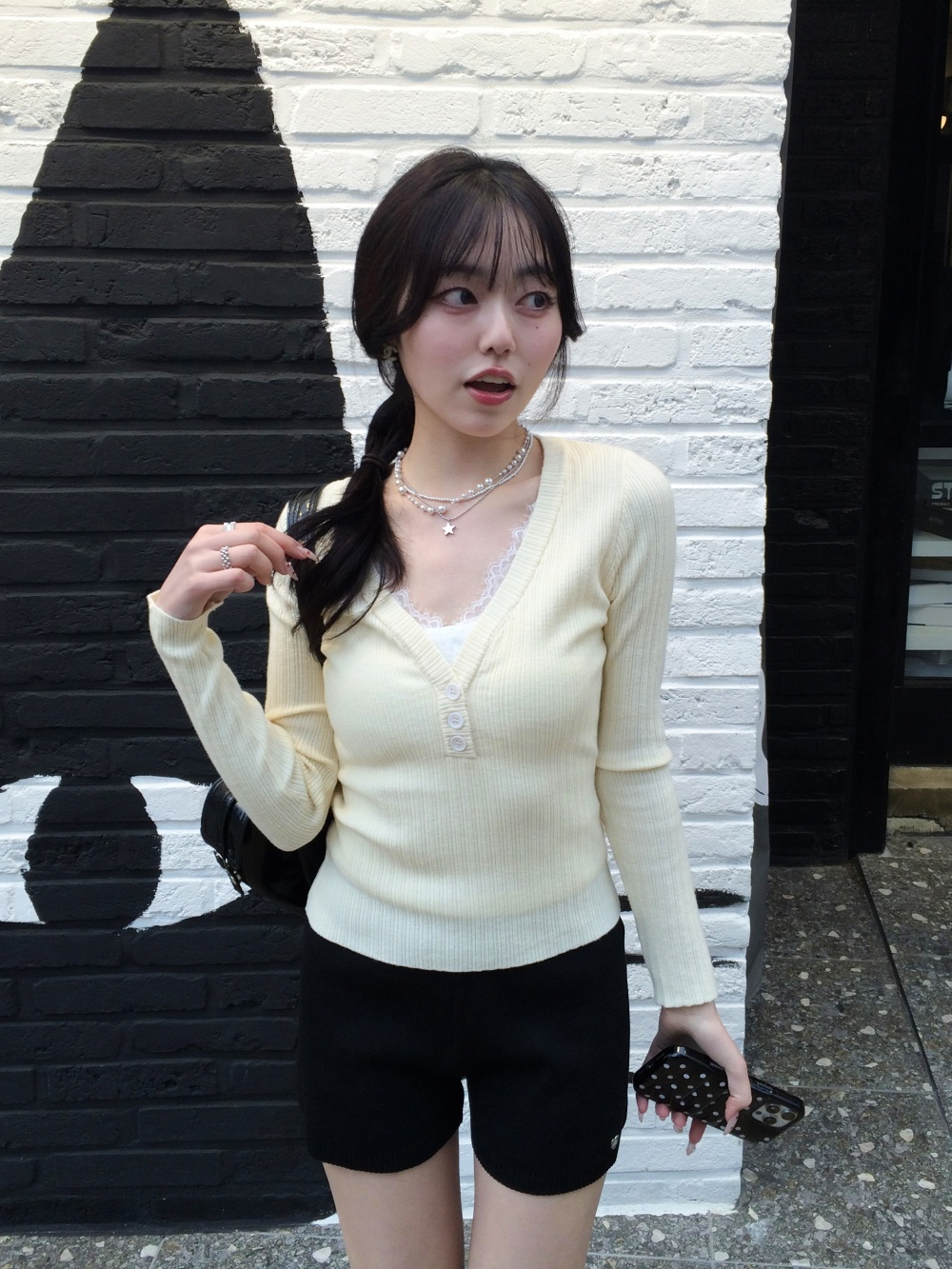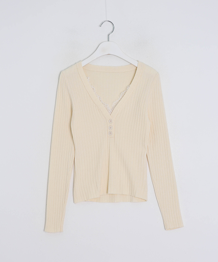 SNT35485 레이스 레이어드 브이넥 니트
