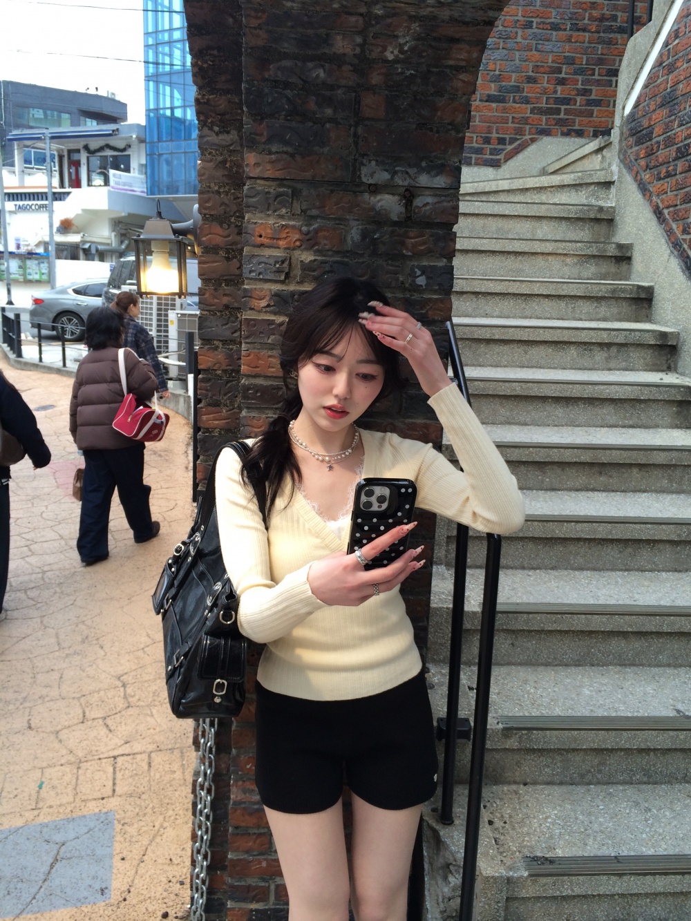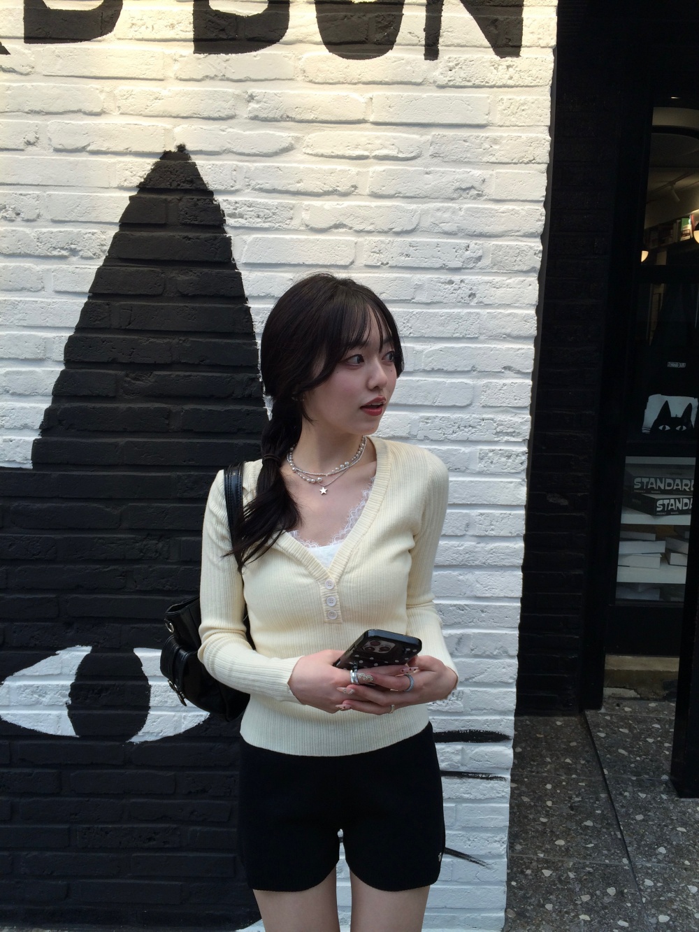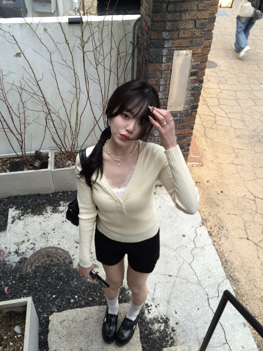 SNT35485 레이스 레이어드 브이넥 니트