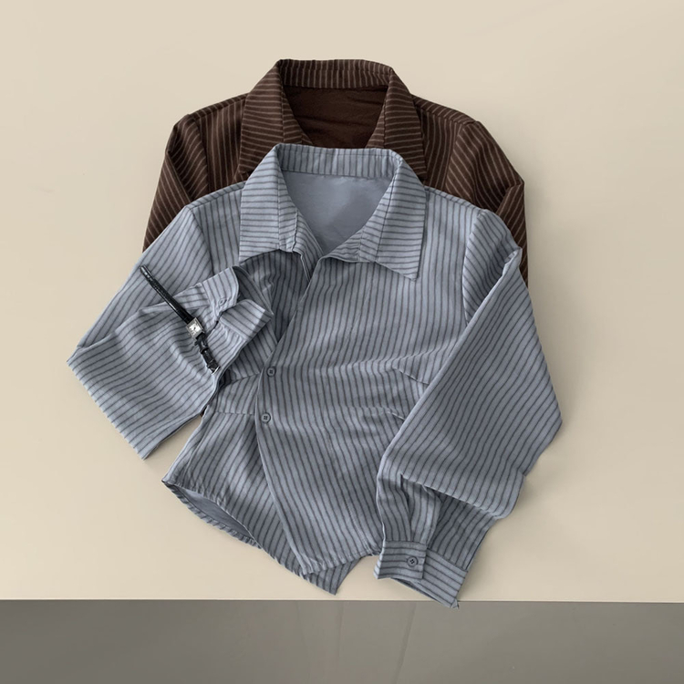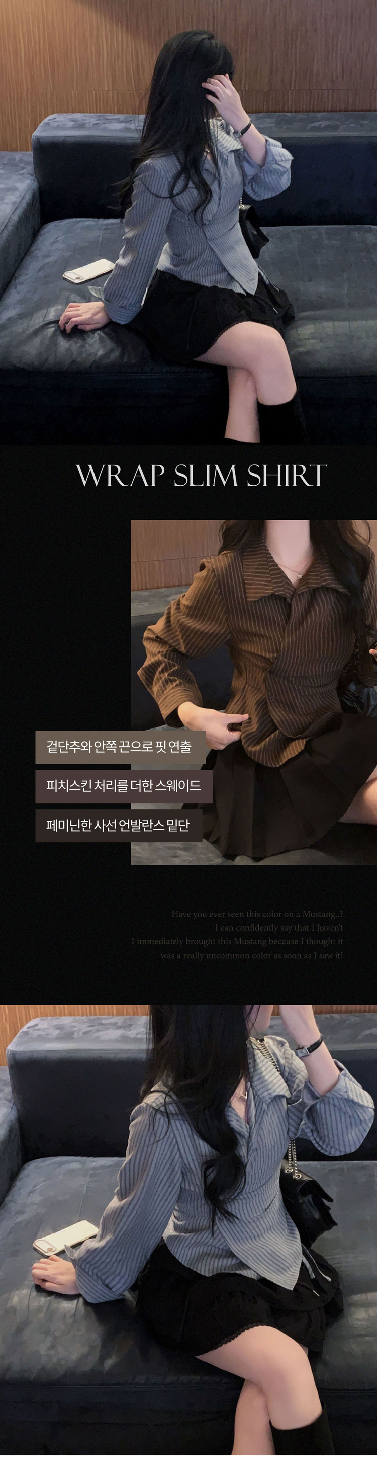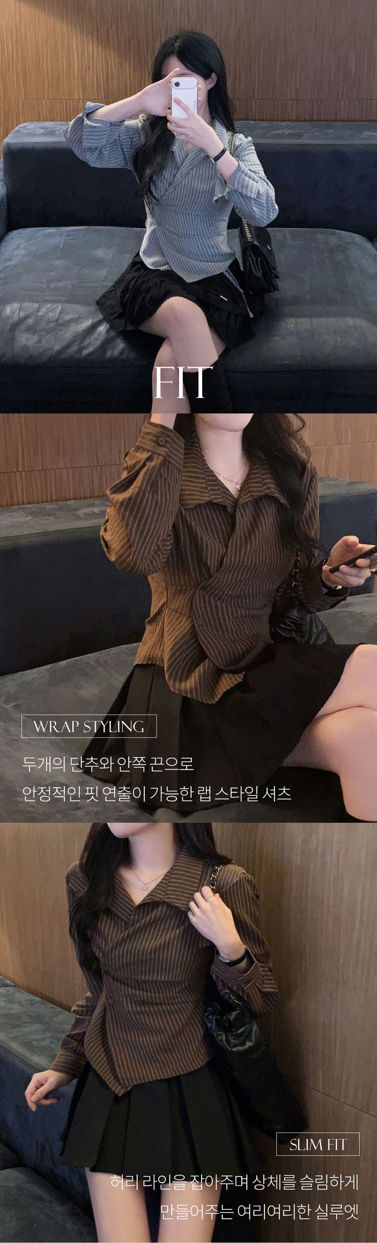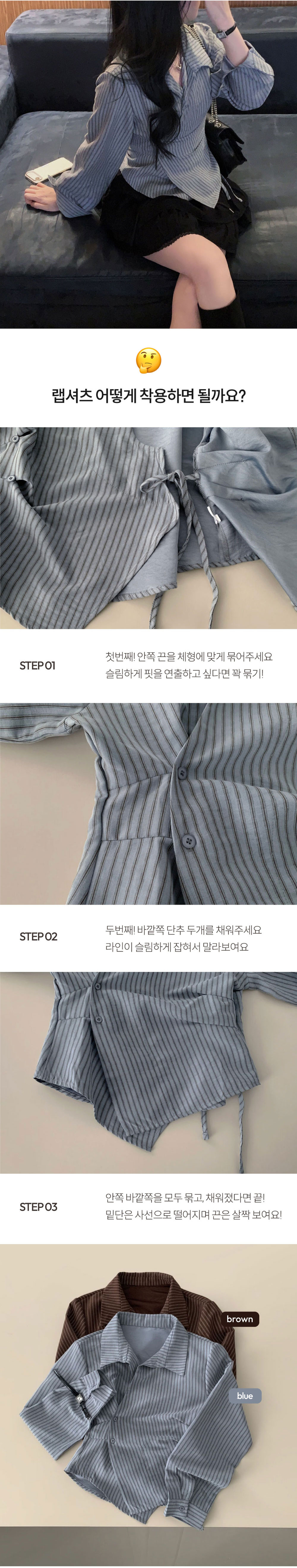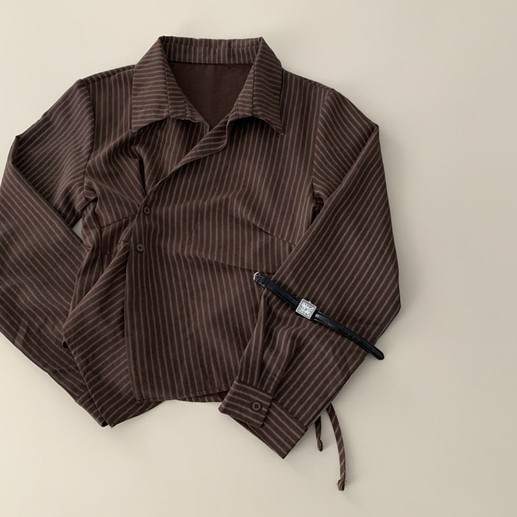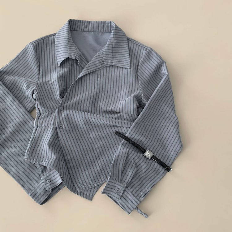 SBS30677 플래시 스웨이드 투버튼 스트라이프 슬림핏 랩 셔츠블라우스