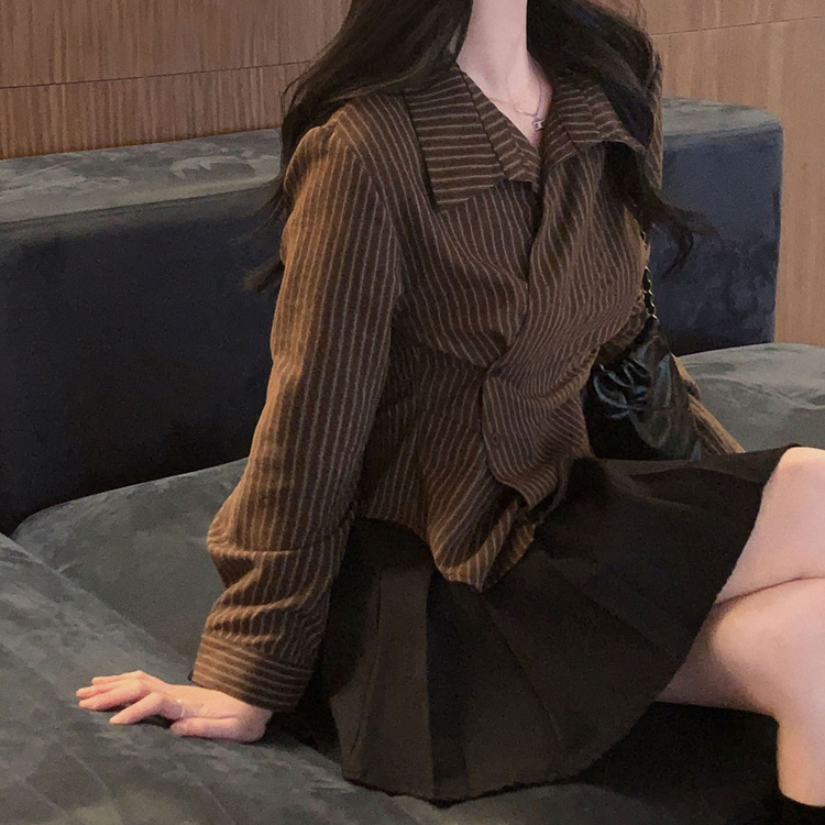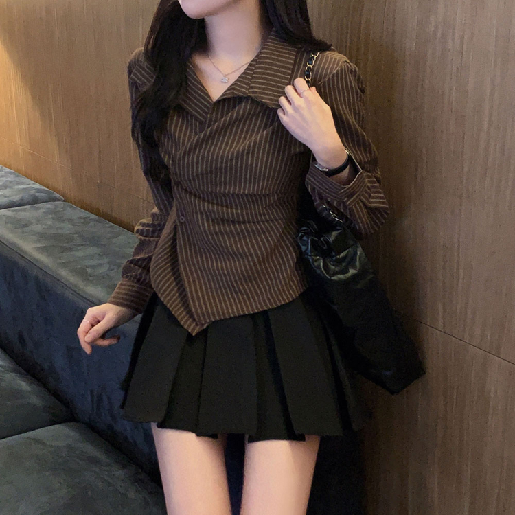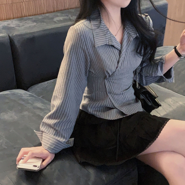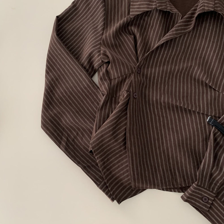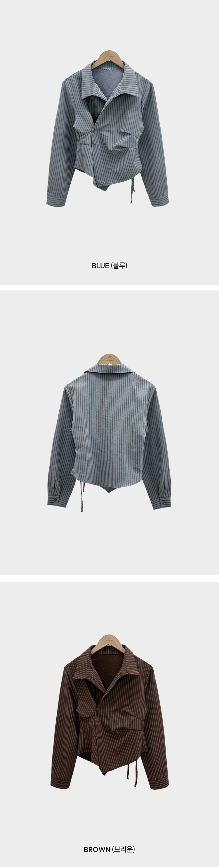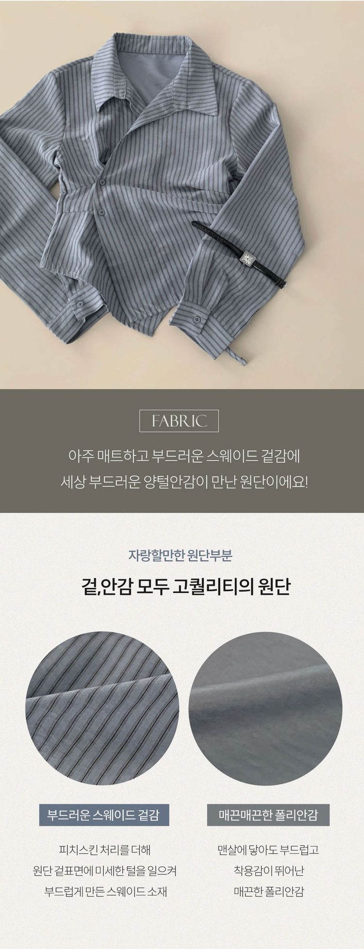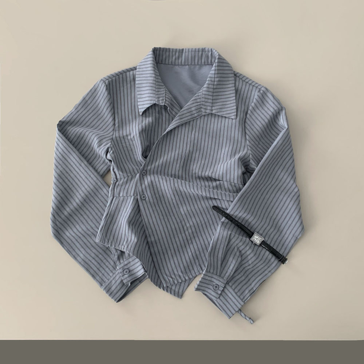 SBS30677 플래시 스웨이드 투버튼 스트라이프 슬림핏 랩 셔츠블라우스