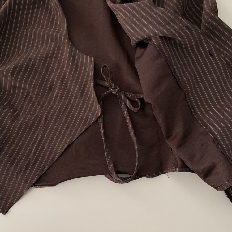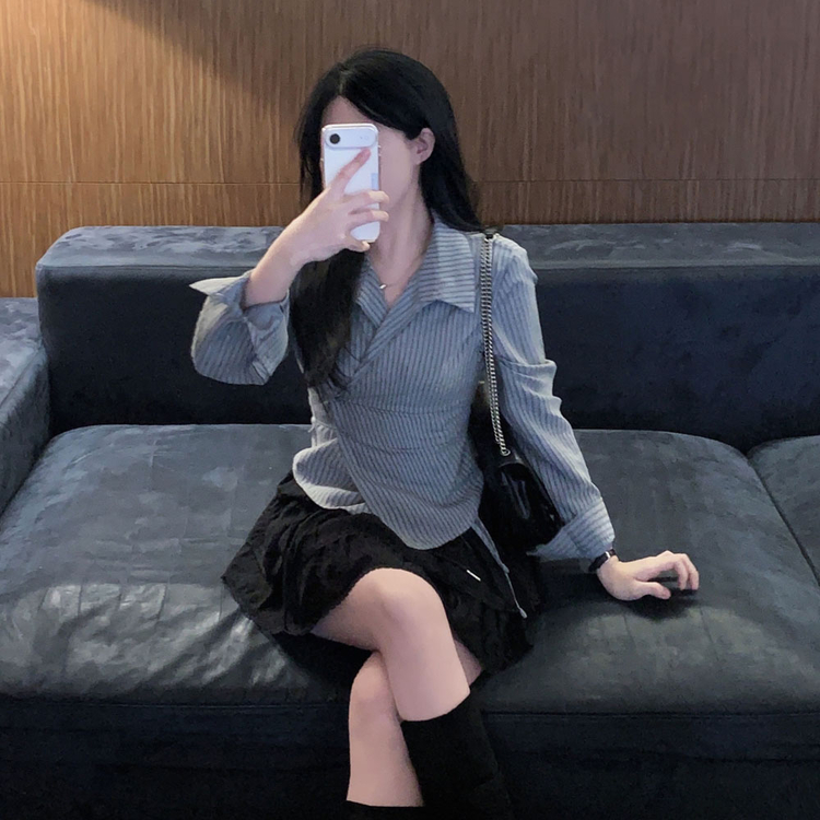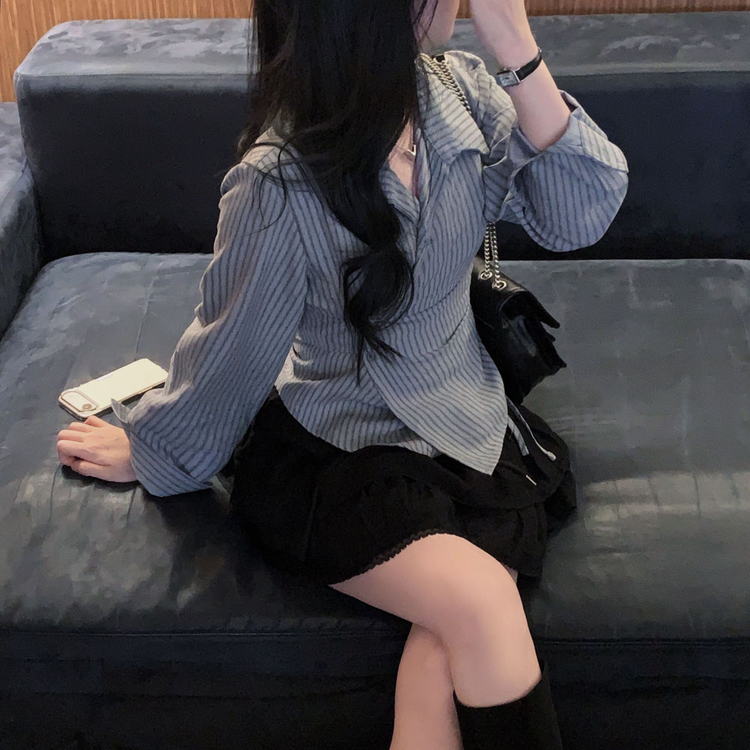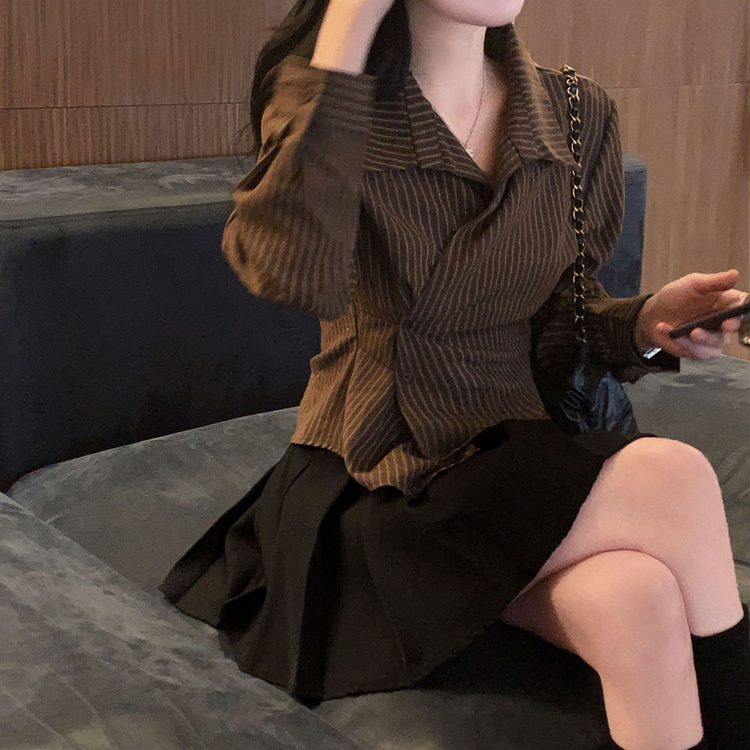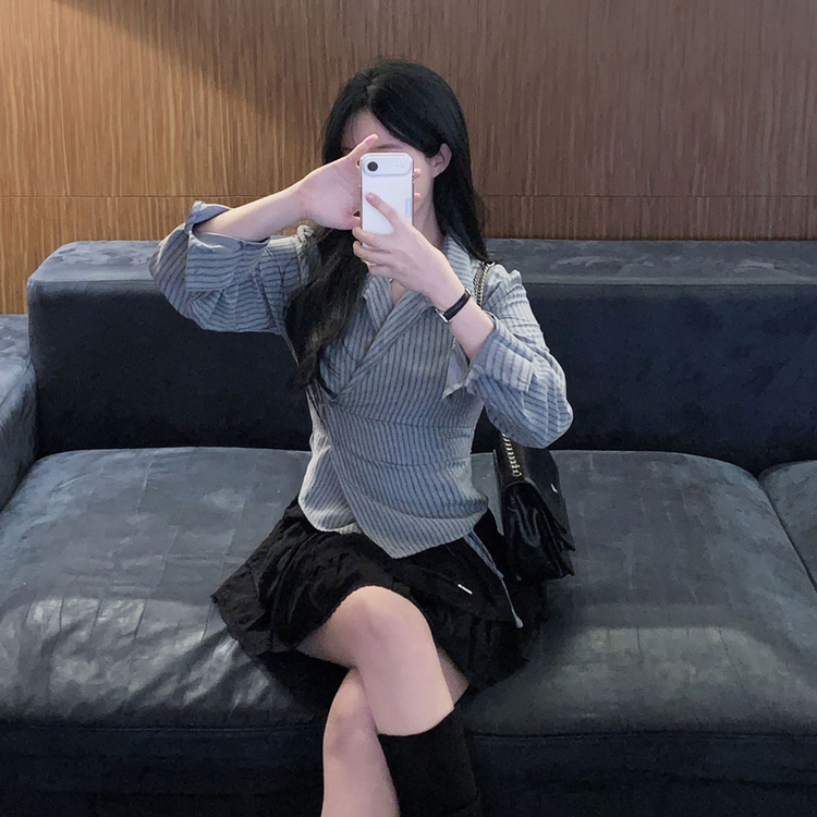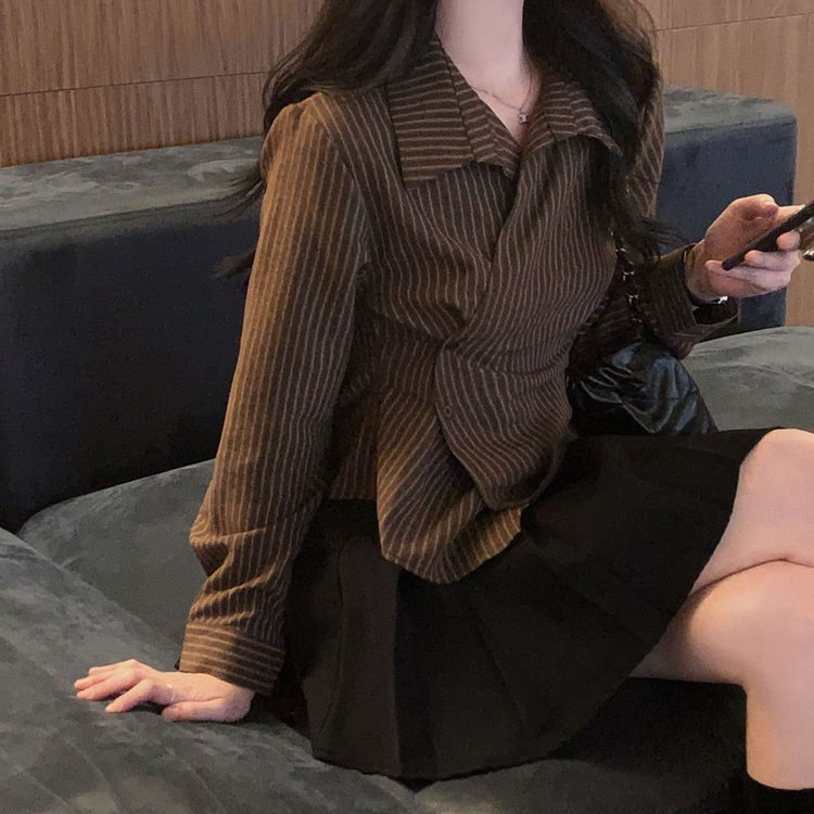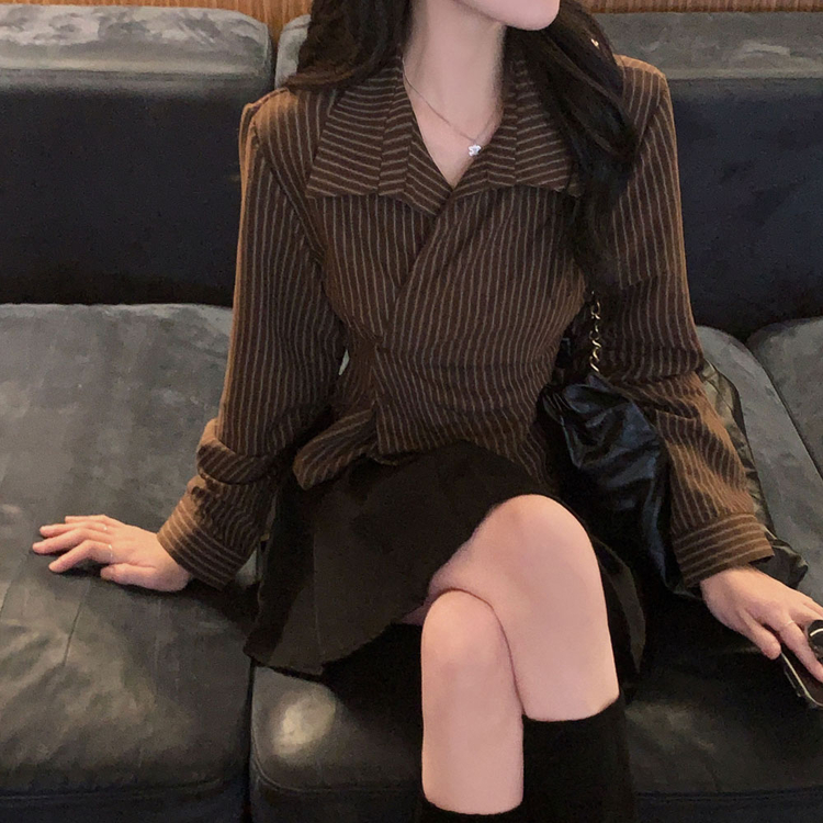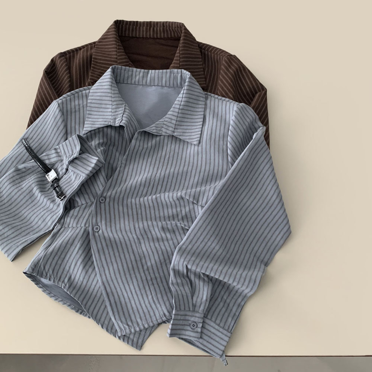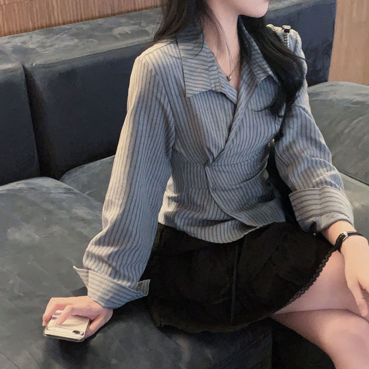 SBS30677 플래시 스웨이드 투버튼 스트라이프 슬림핏 랩 셔츠블라우스