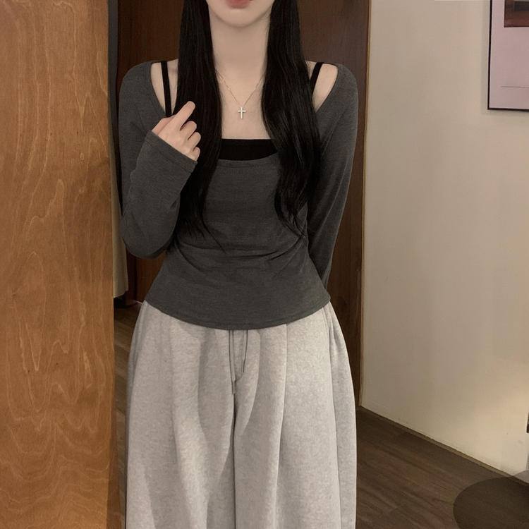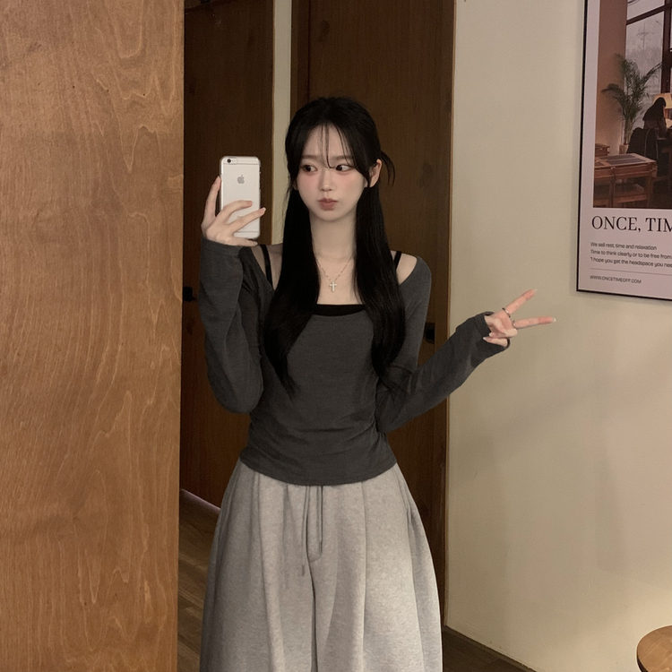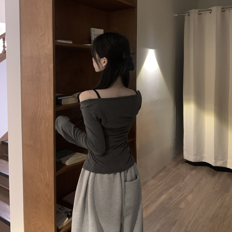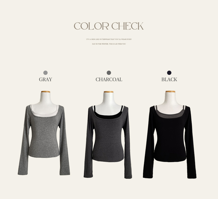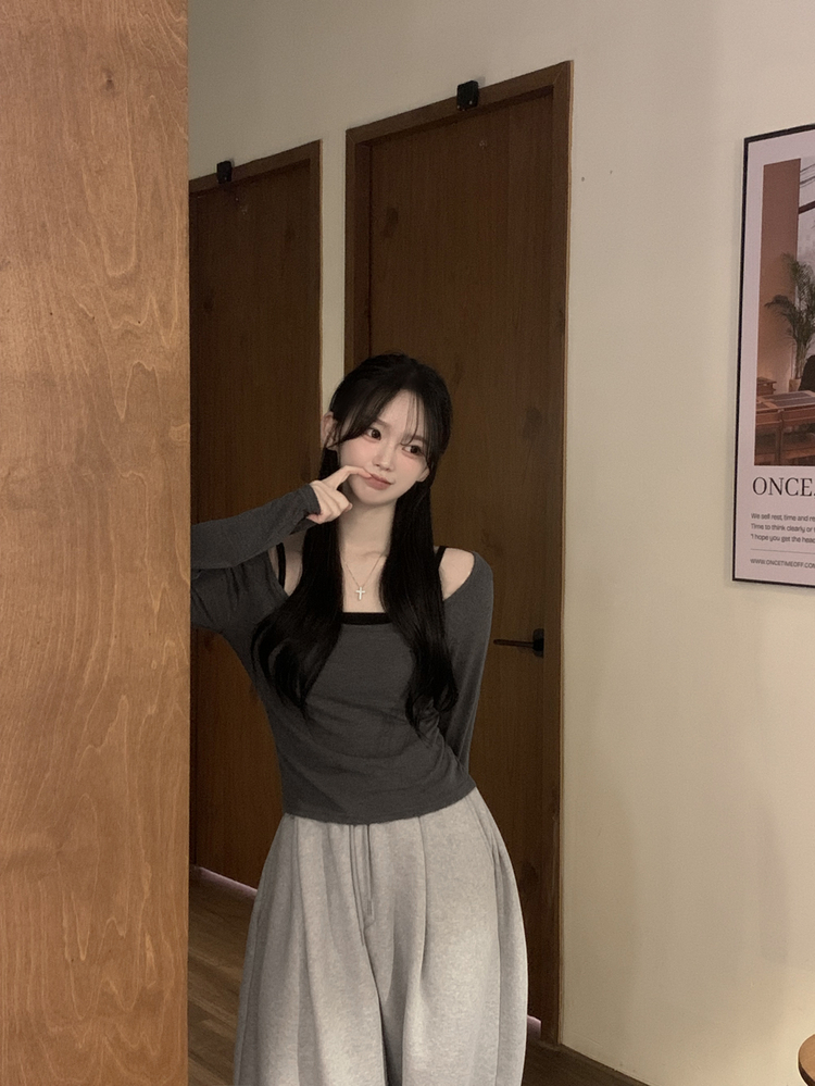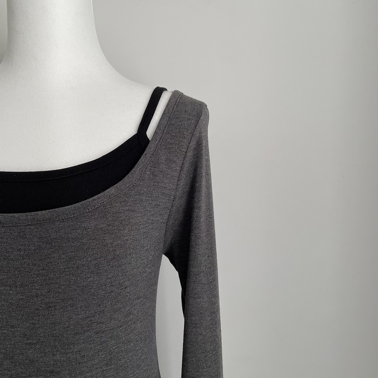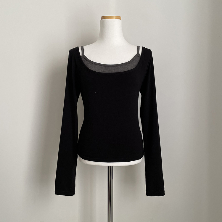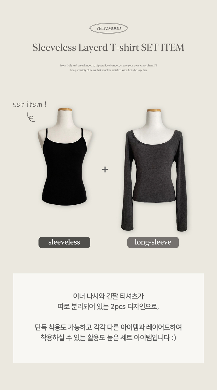 STS75736 레이어드 이너 슬리브리스 끈나시 루즈핏 긴팔티셔츠 투피스 세트