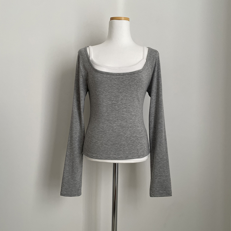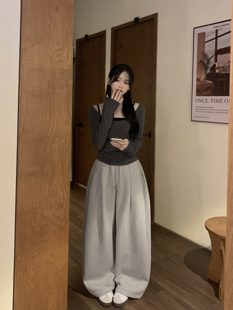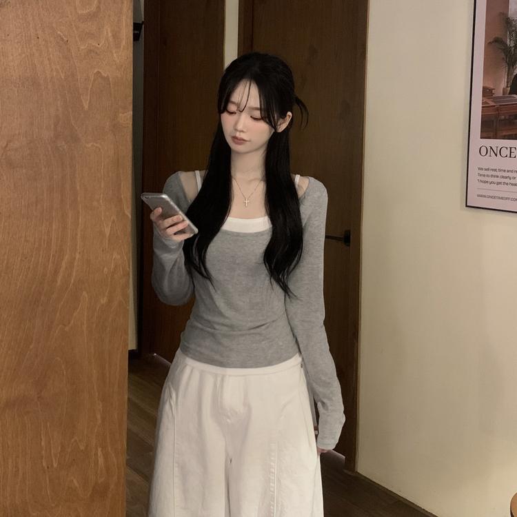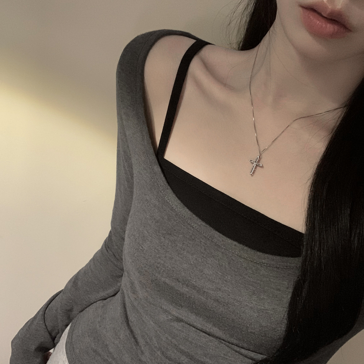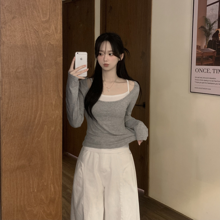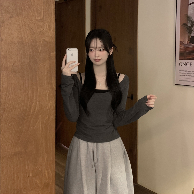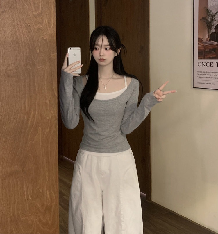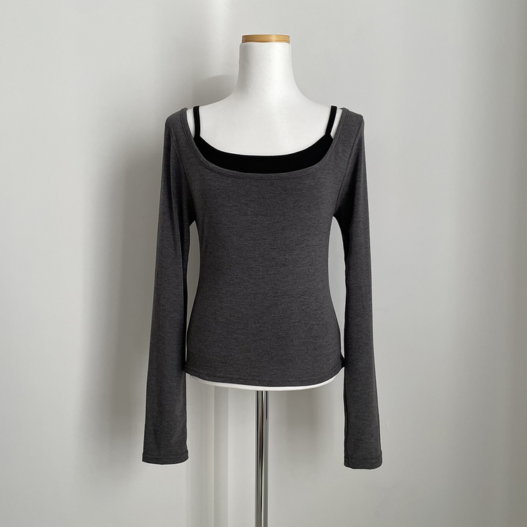 STS75736 레이어드 이너 슬리브리스 끈나시 루즈핏 긴팔티셔츠 투피스 세트