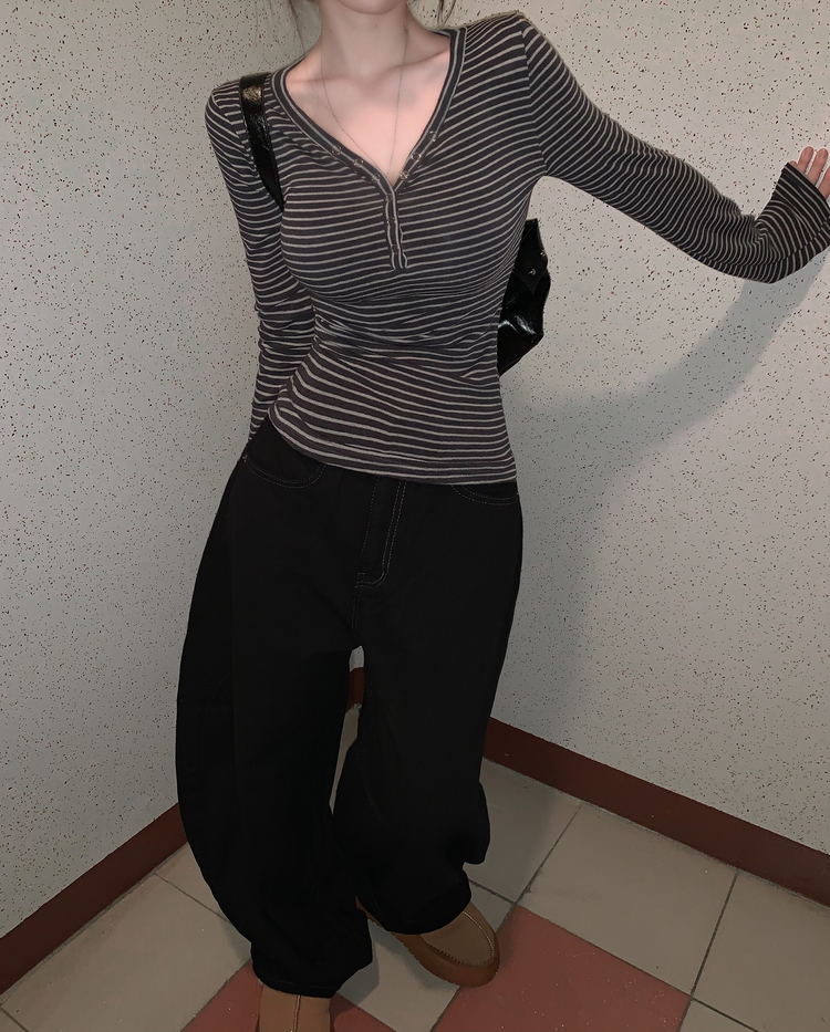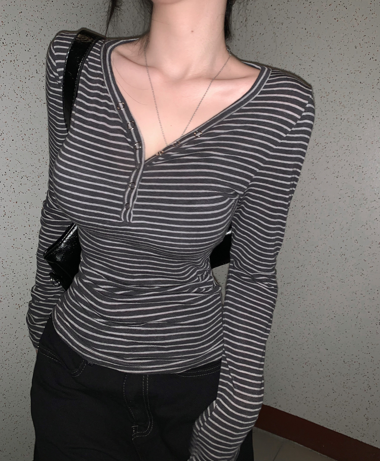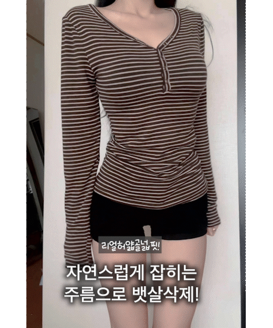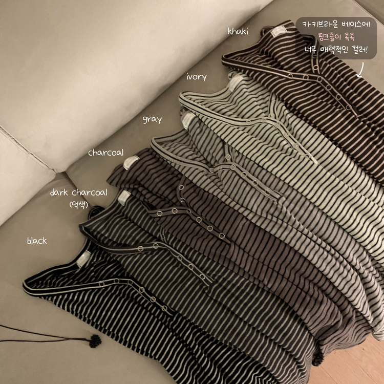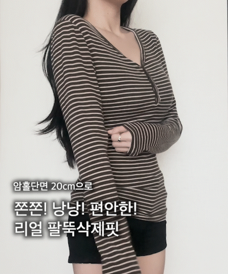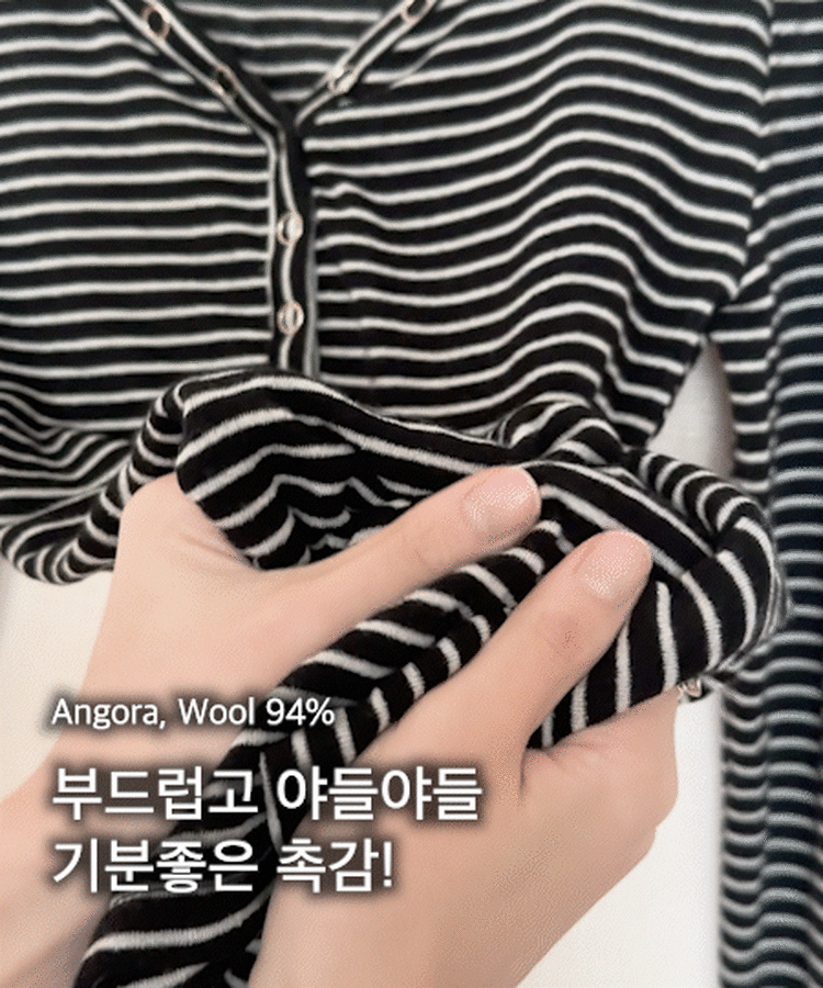 STS75833 카피주의 단가라 스트라이프 앙고라 울 치즈 쫀쫀 스냅 또또 버튼 브이넥 오프숄더 롱슬리브 긴팔티셔츠 가을이너 겨울이너
