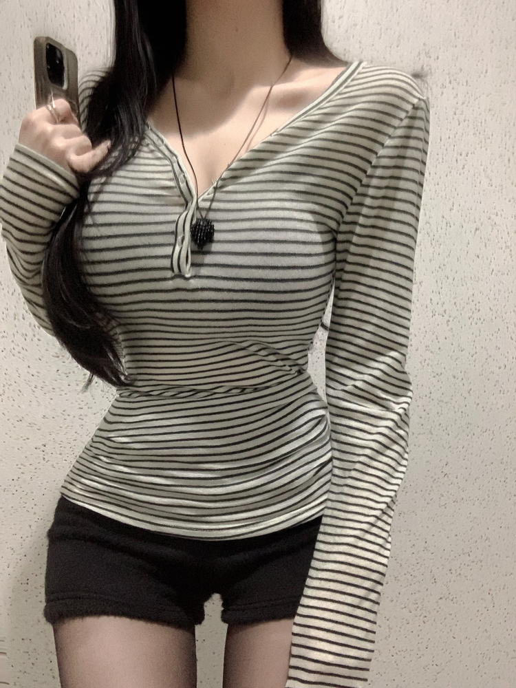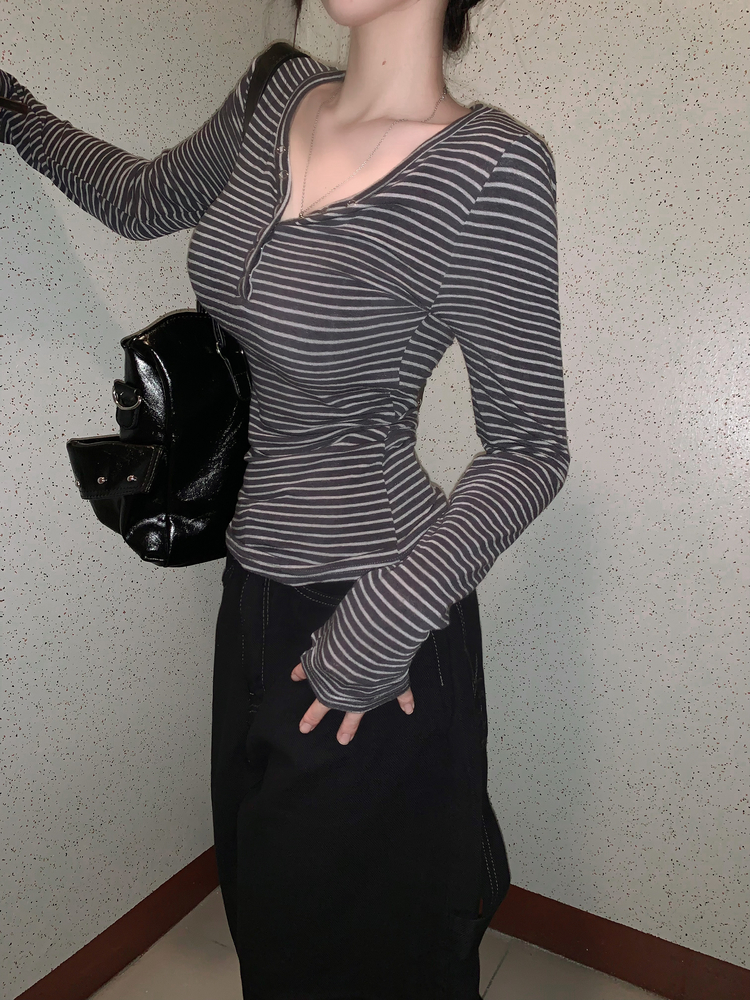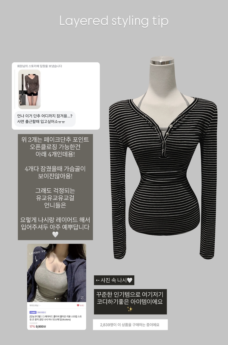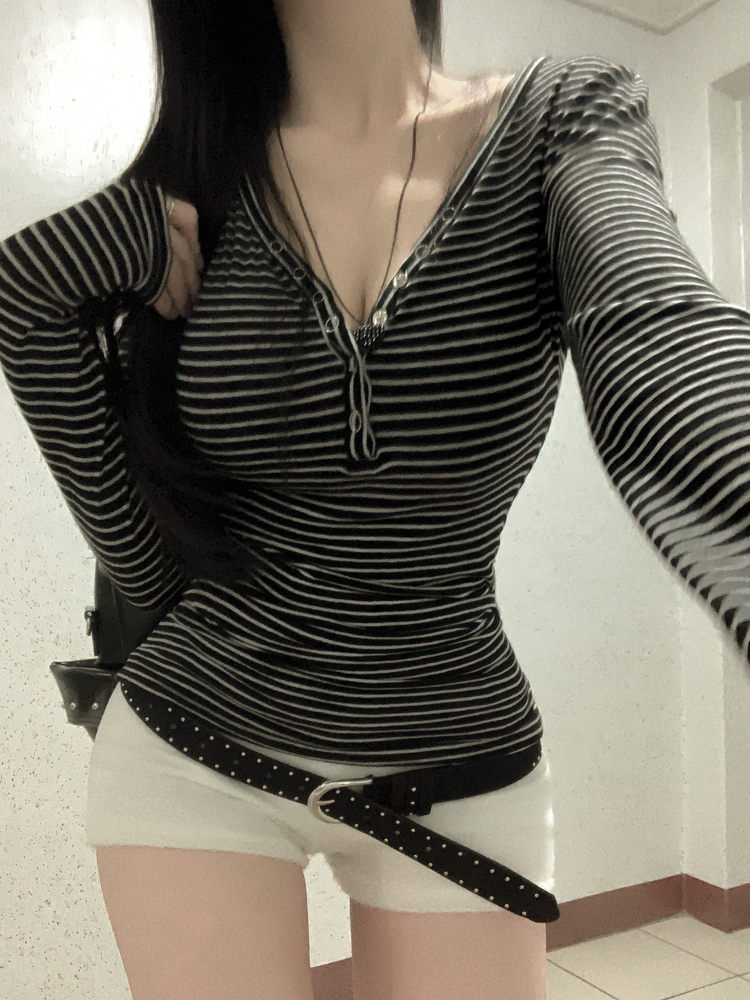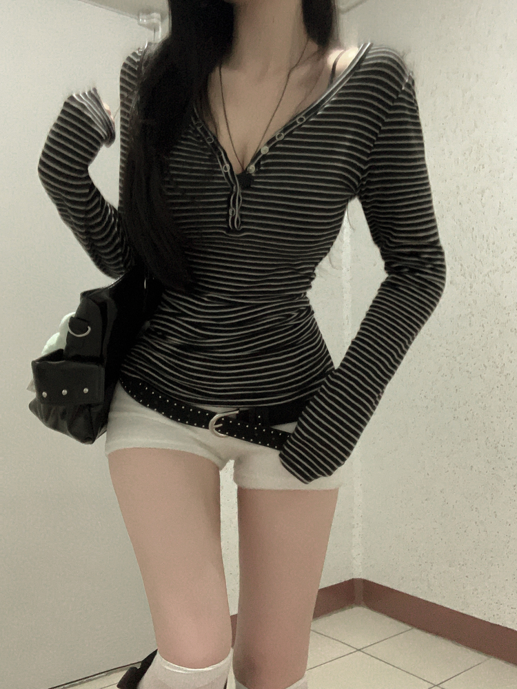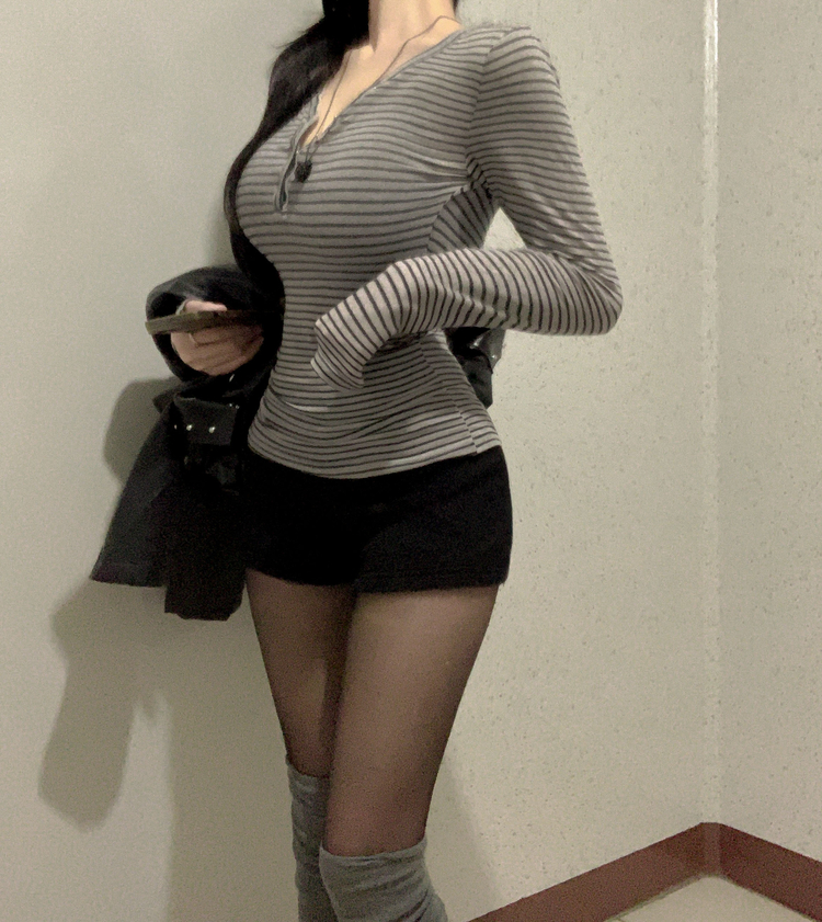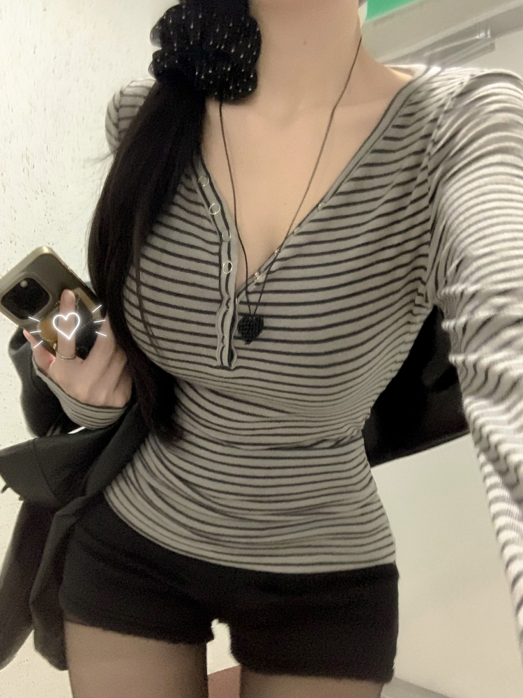 STS75833 카피주의 단가라 스트라이프 앙고라 울 치즈 쫀쫀 스냅 또또 버튼 브이넥 오프숄더 롱슬리브 긴팔티셔츠 가을이너 겨울이너