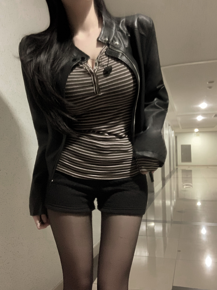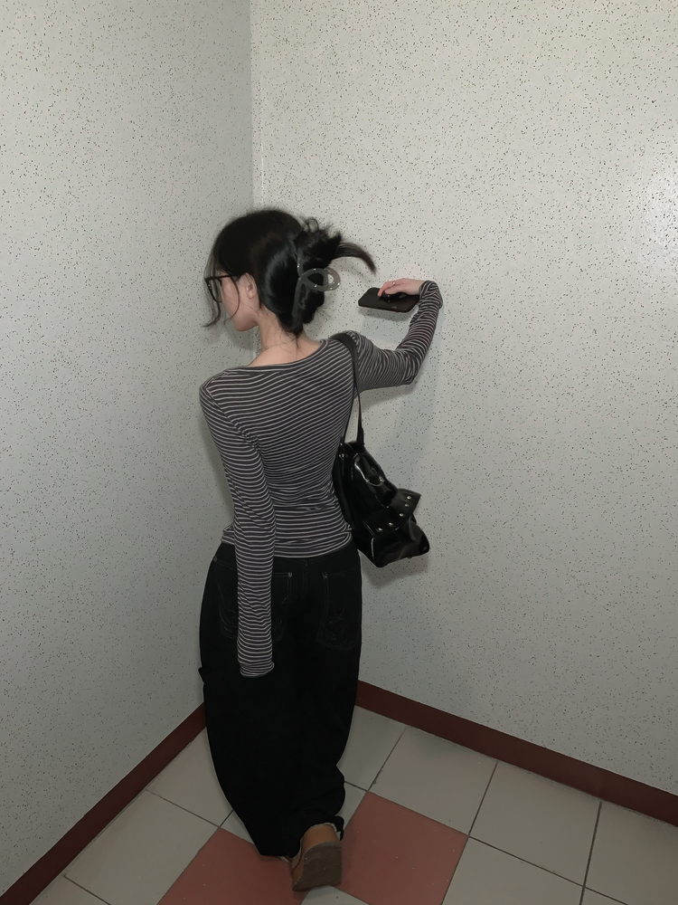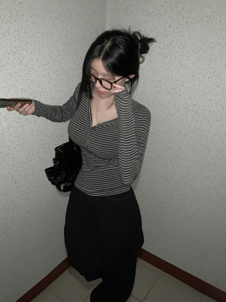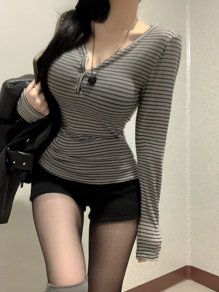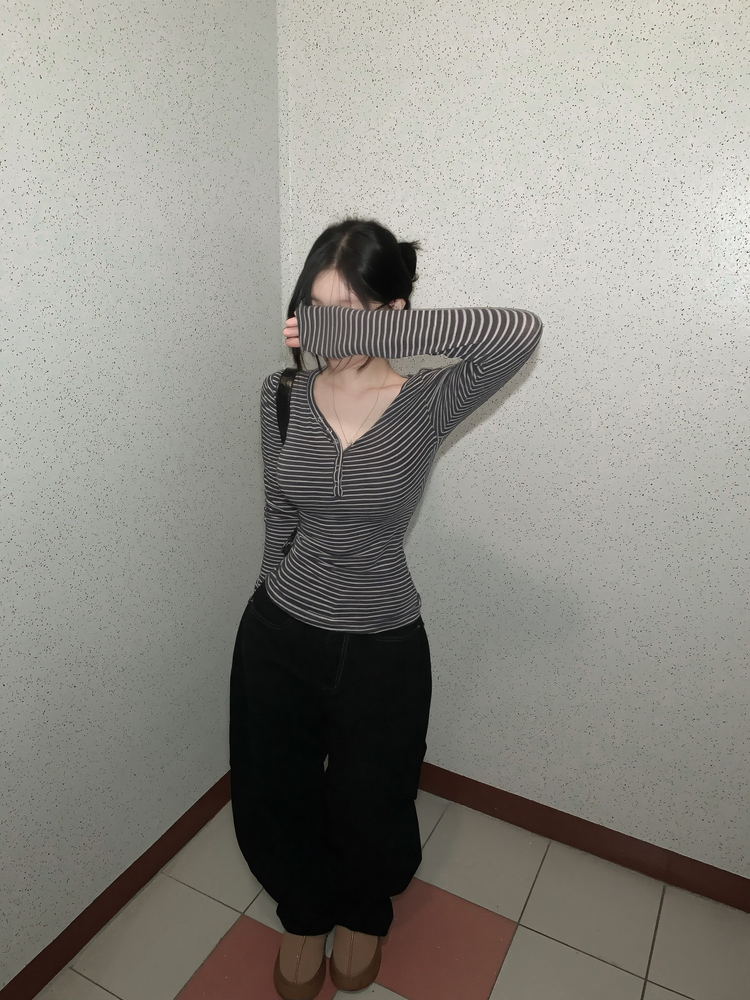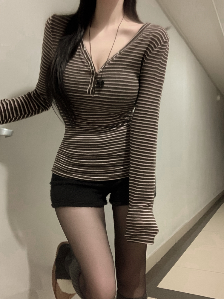STS75833 카피주의 단가라 스트라이프 앙고라 울 치즈 쫀쫀 스냅 또또 버튼 브이넥 오프숄더 롱슬리브 긴팔티셔츠 가을이너 겨울이너