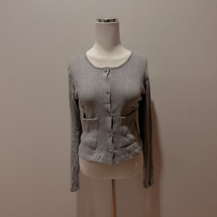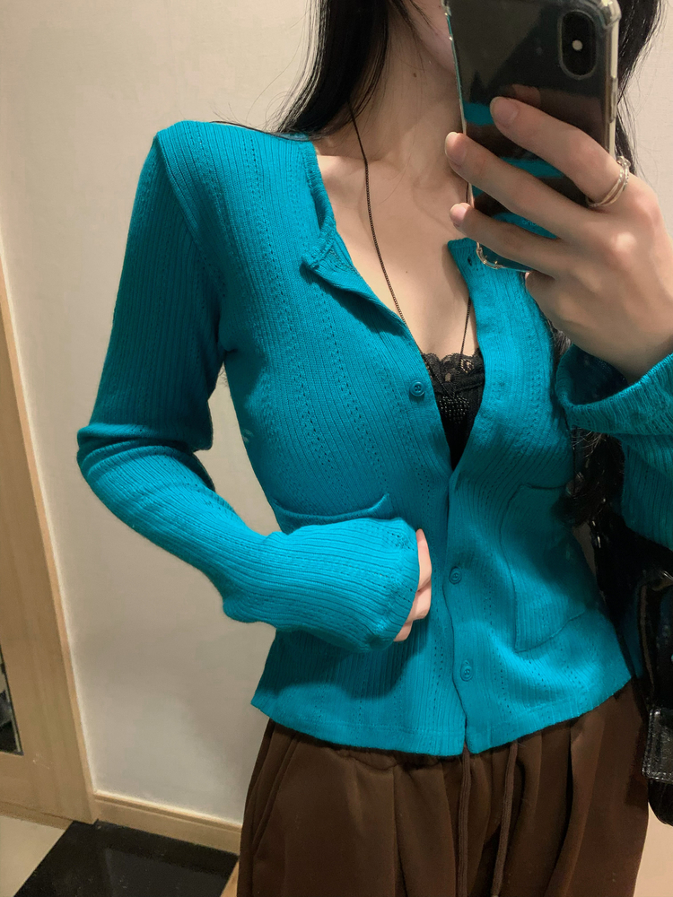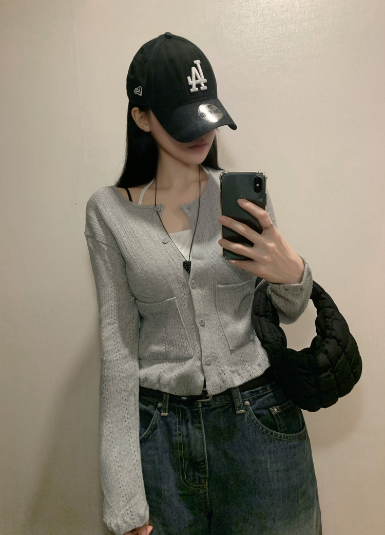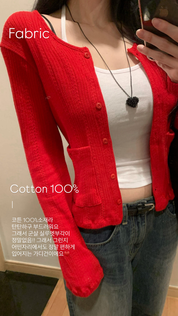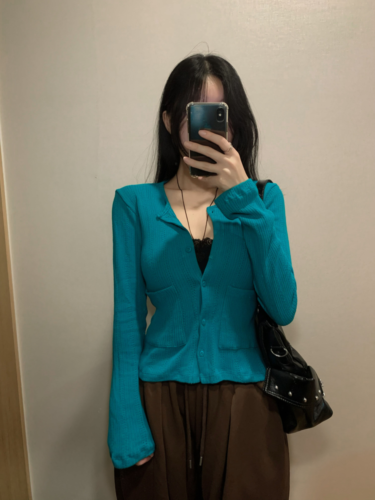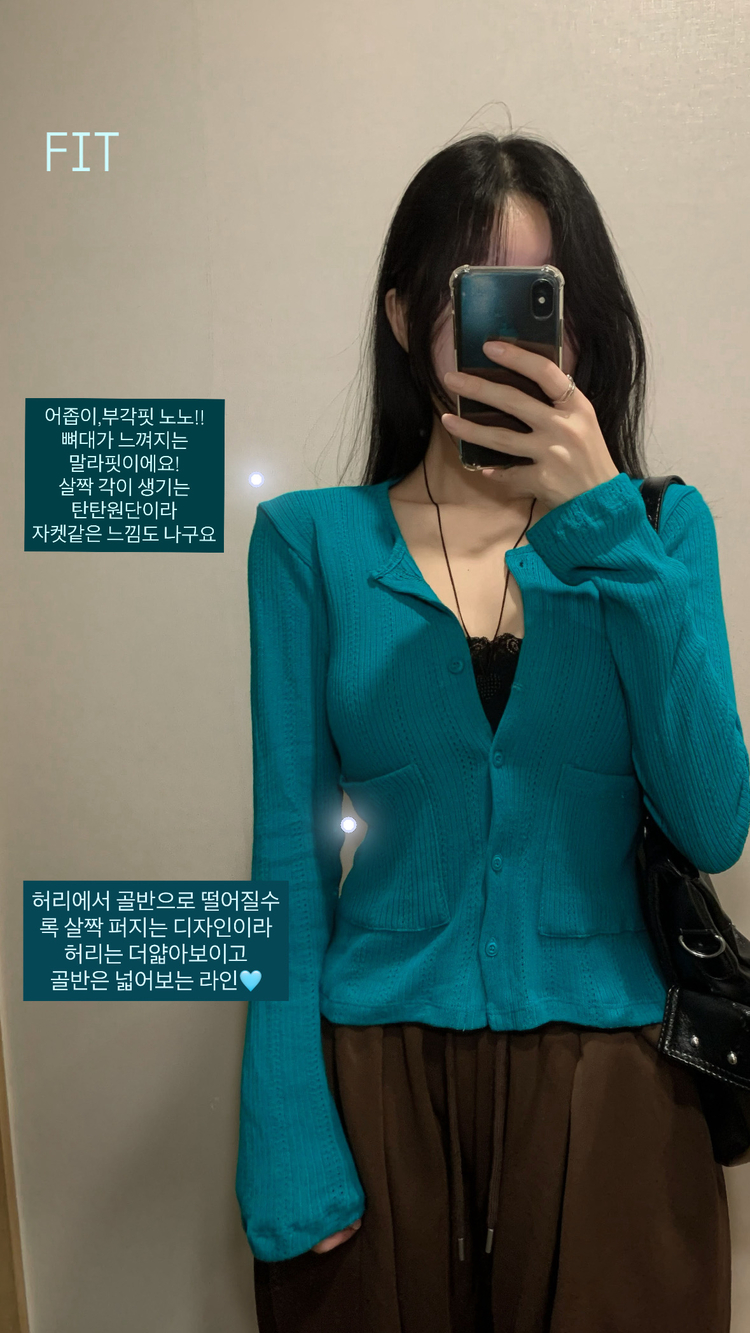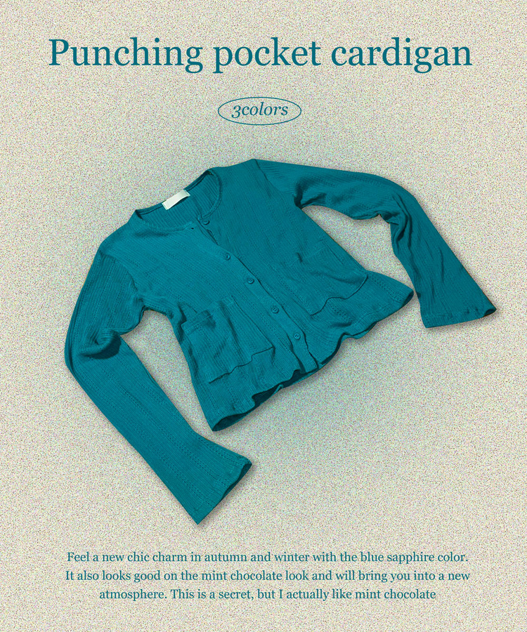 SGD31088 비비드 민트 플라워 펀칭 포켓 코튼 스판 쫀쫀 니트 단추 버튼 롱슬리브 긴팔 가디건 3colors