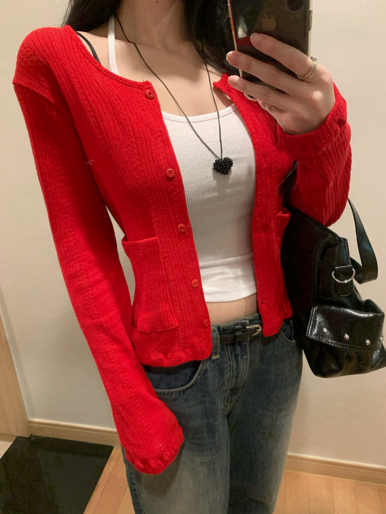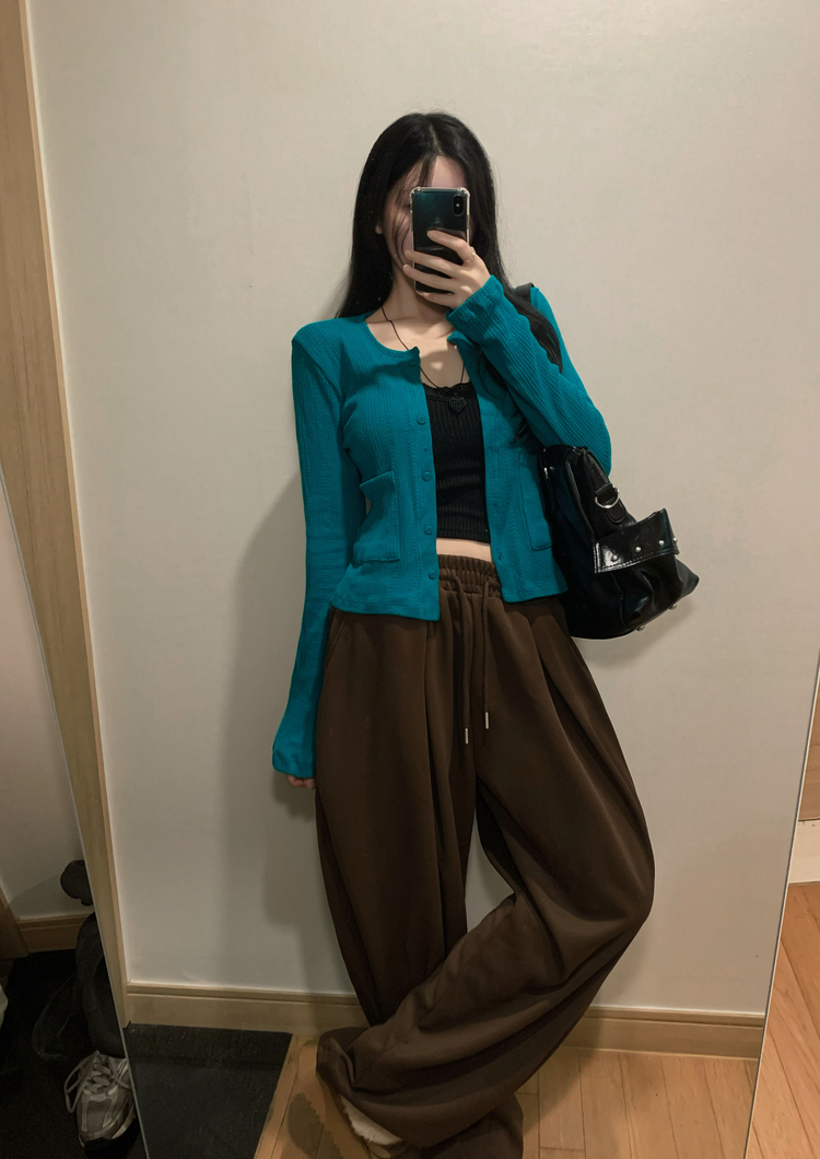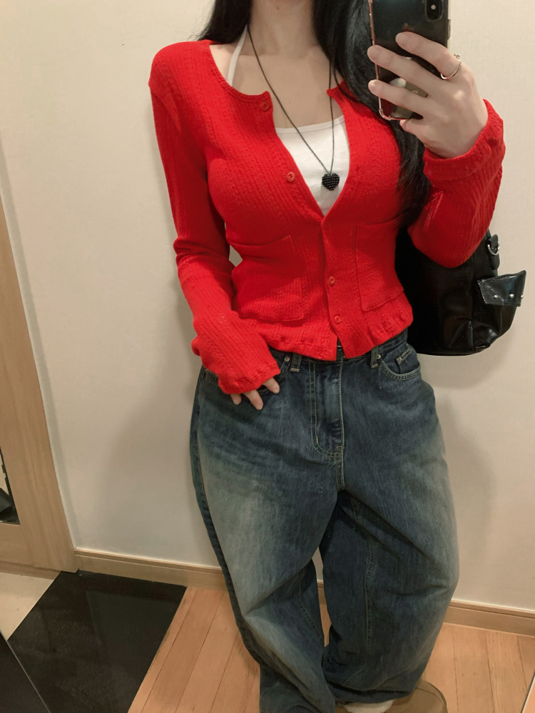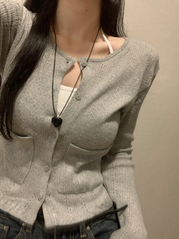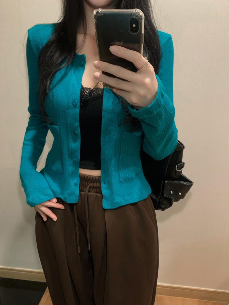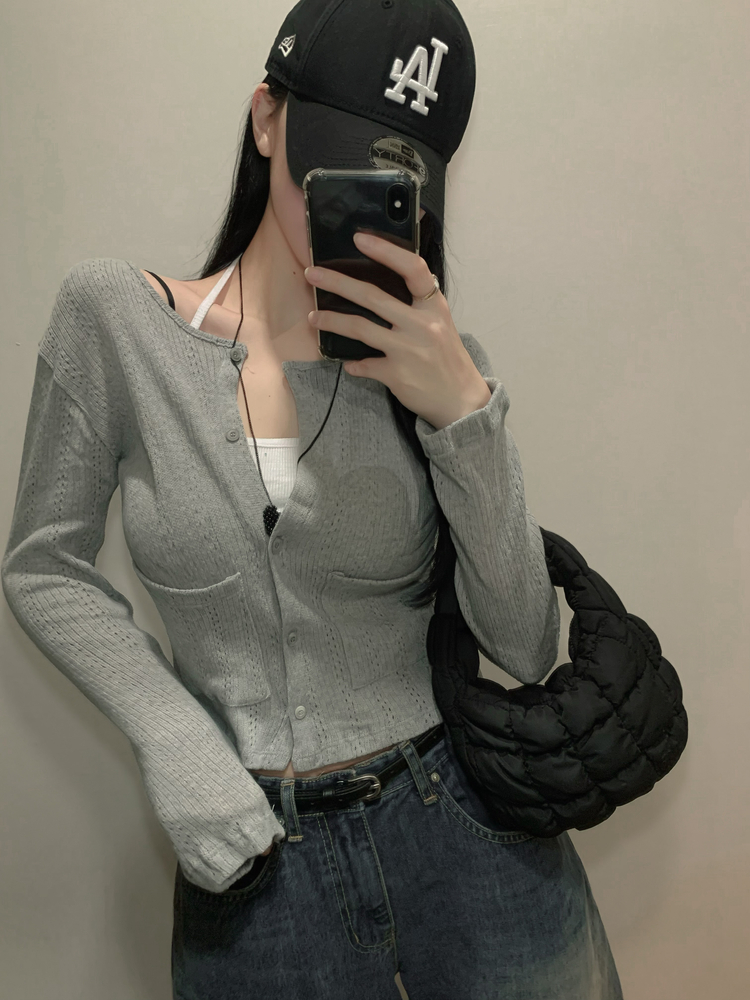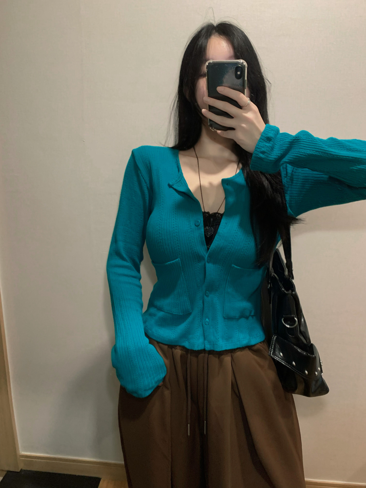 SGD31088 비비드 민트 플라워 펀칭 포켓 코튼 스판 쫀쫀 니트 단추 버튼 롱슬리브 긴팔 가디건 3colors