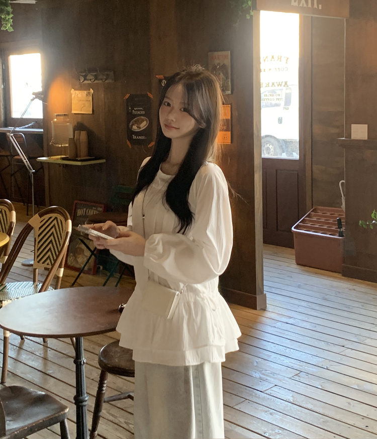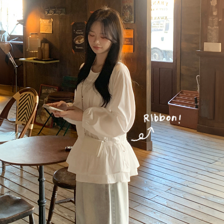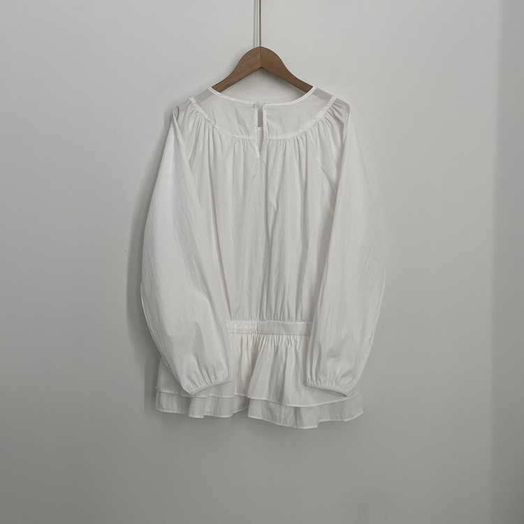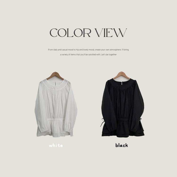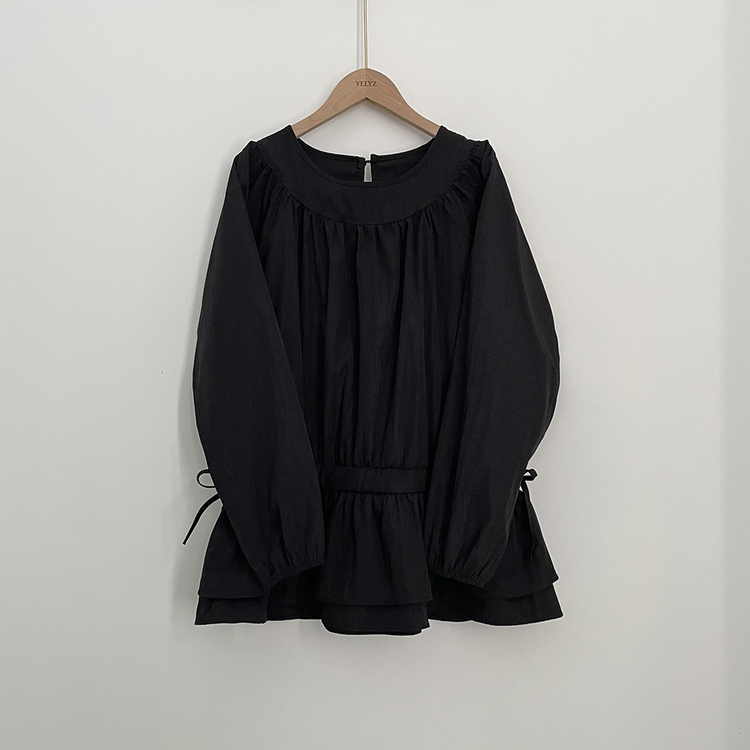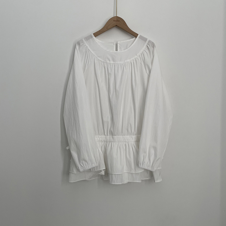 SBS30865 레이어드 퓨어 라운드 캉캉 셔링 프릴 허리리본 스트링 긴팔 벌룬 블라우스 봄신상